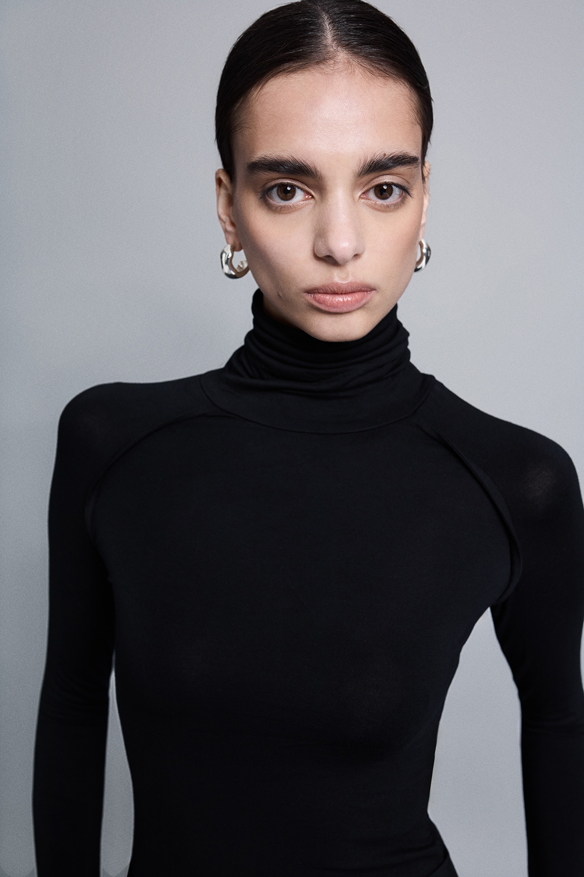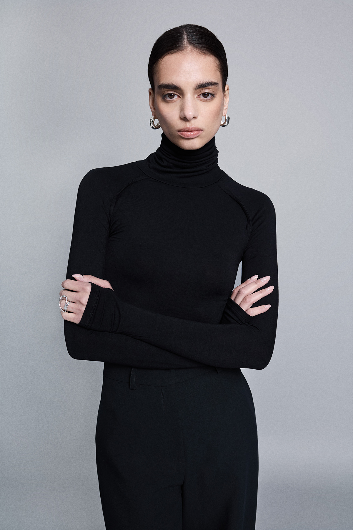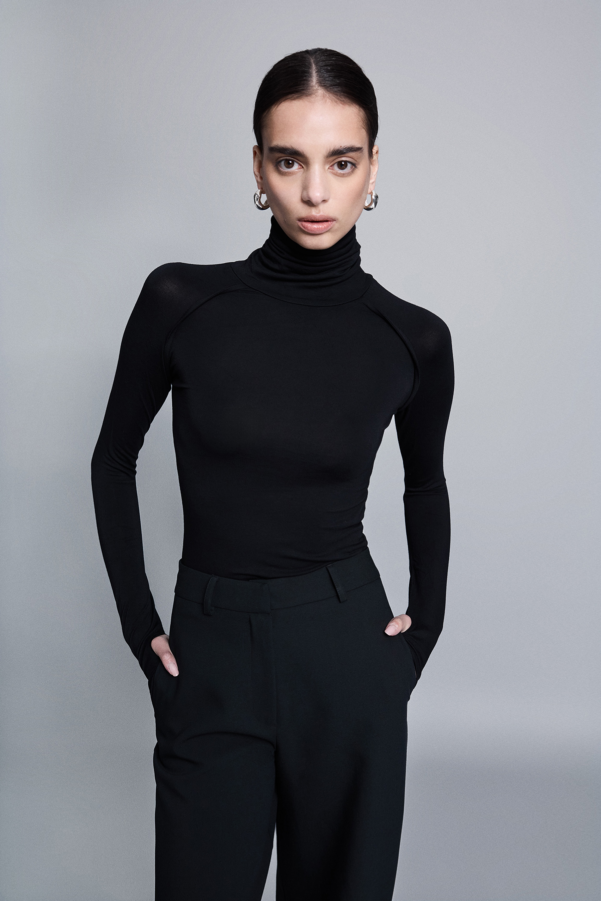 Balıkçı yaka, esnek kumaş, kol ucundan parmak geçirme detaylı, raglan kol detaylı, örme, tam kalıp, basic bluz.