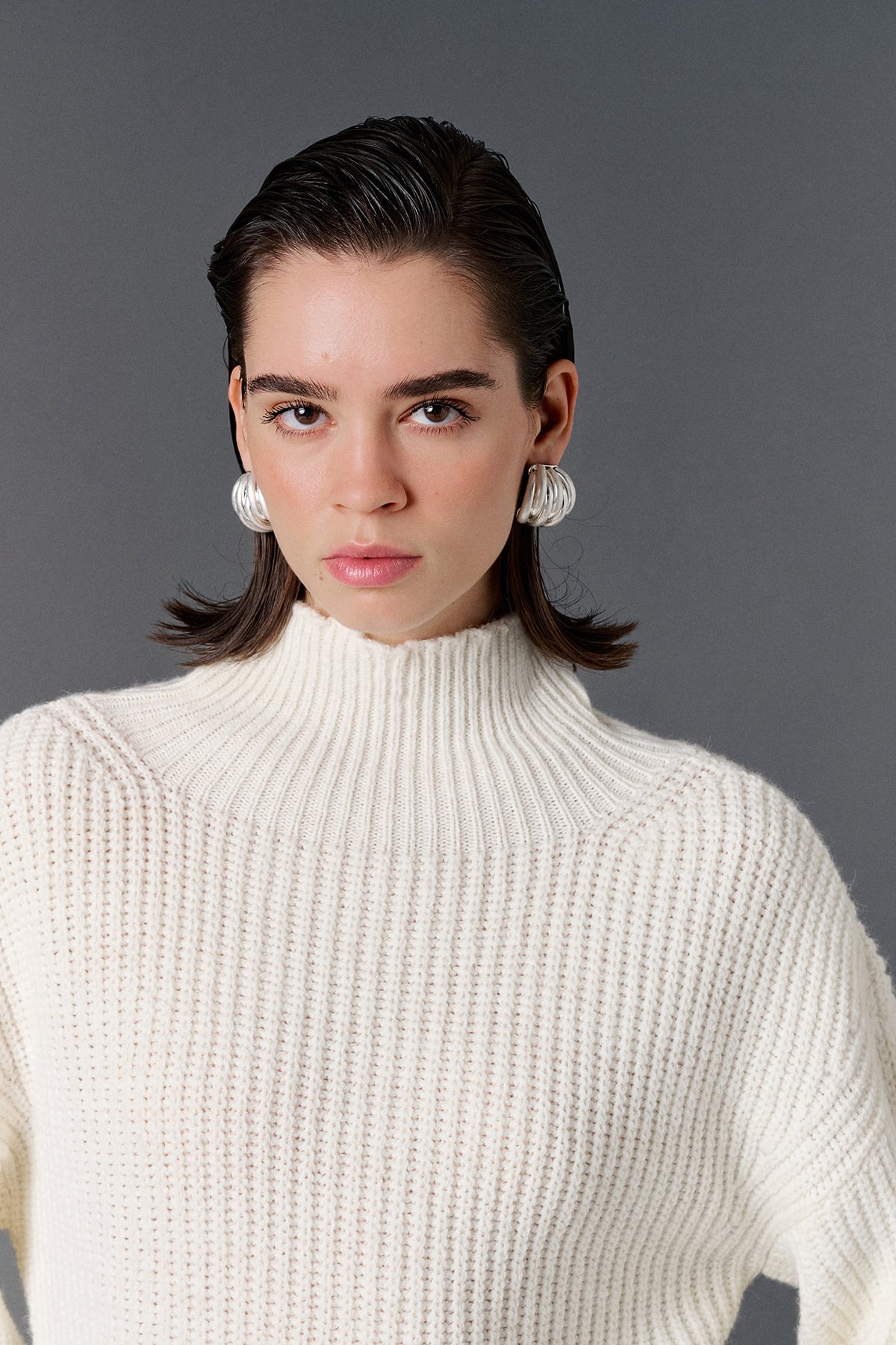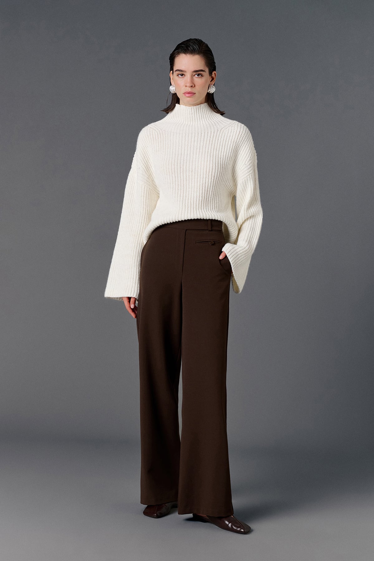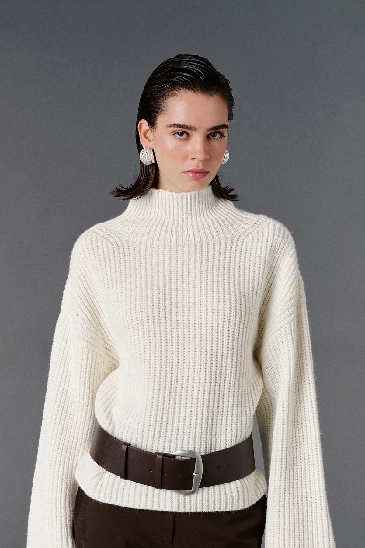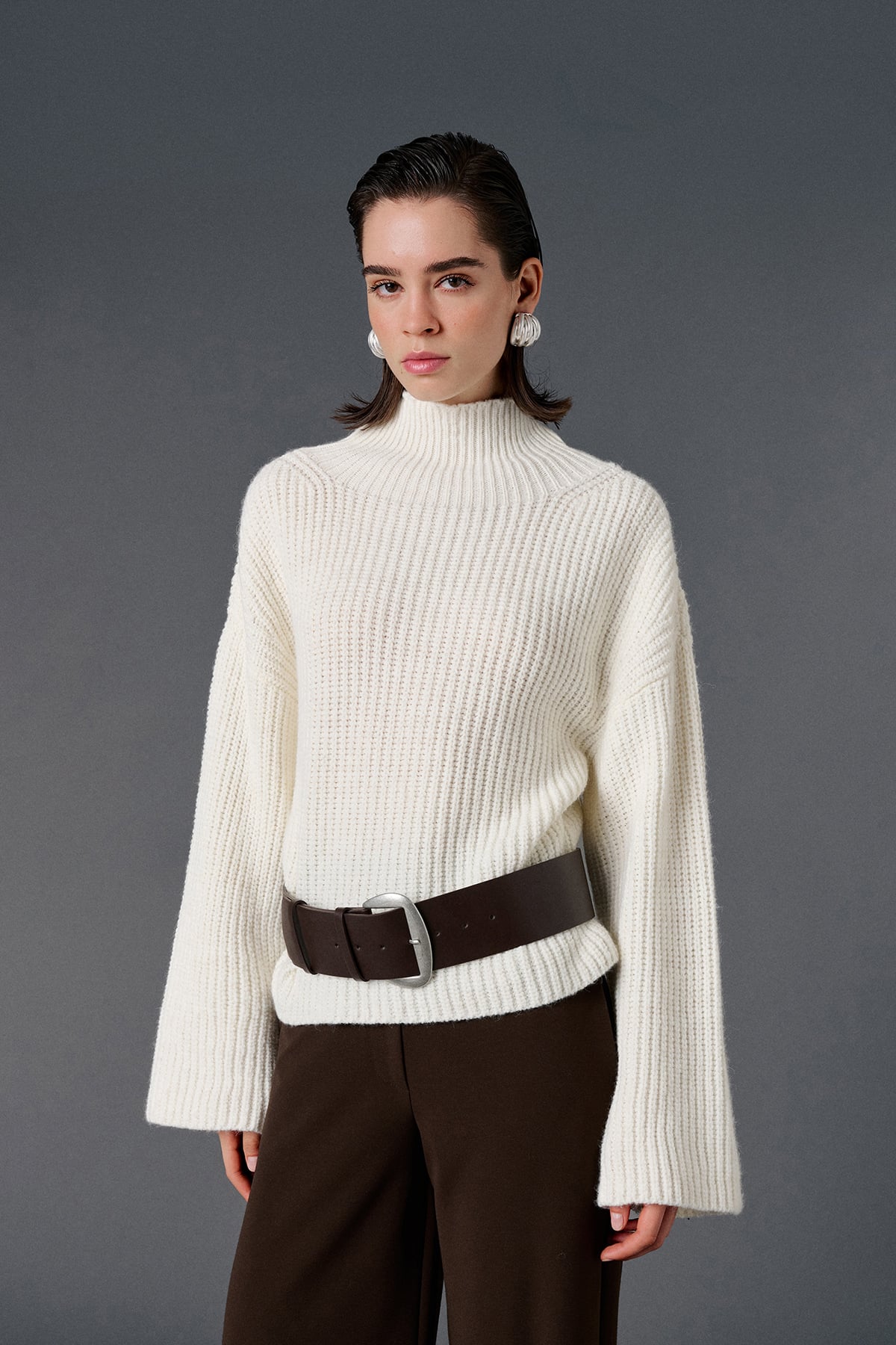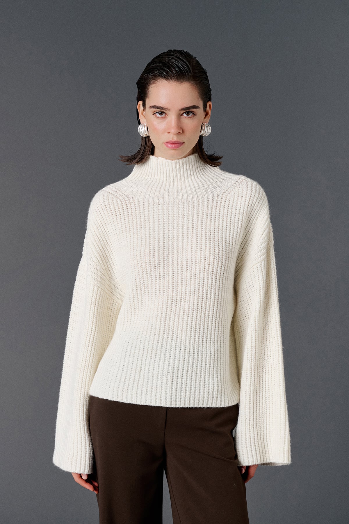 Balıkçı yaka, geniş kollu, oversize kazak.