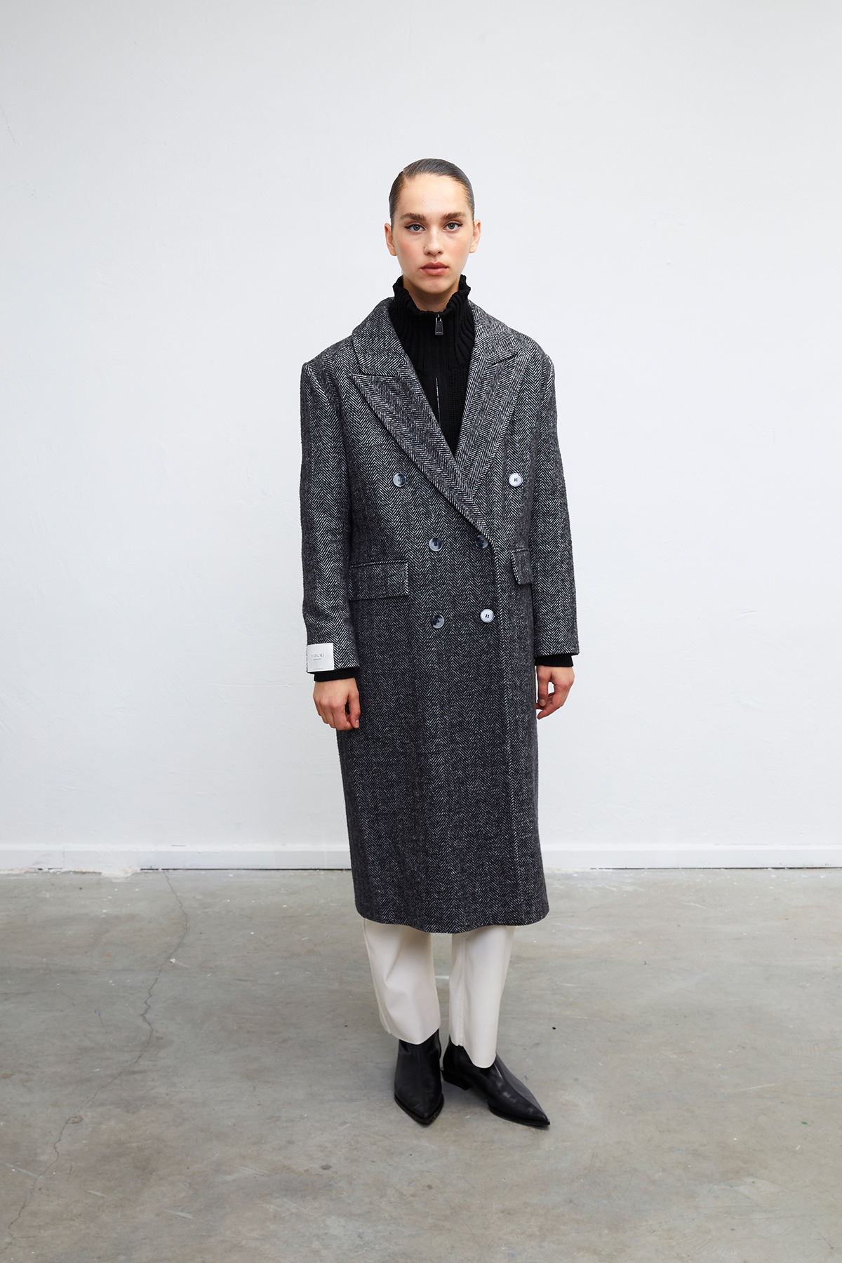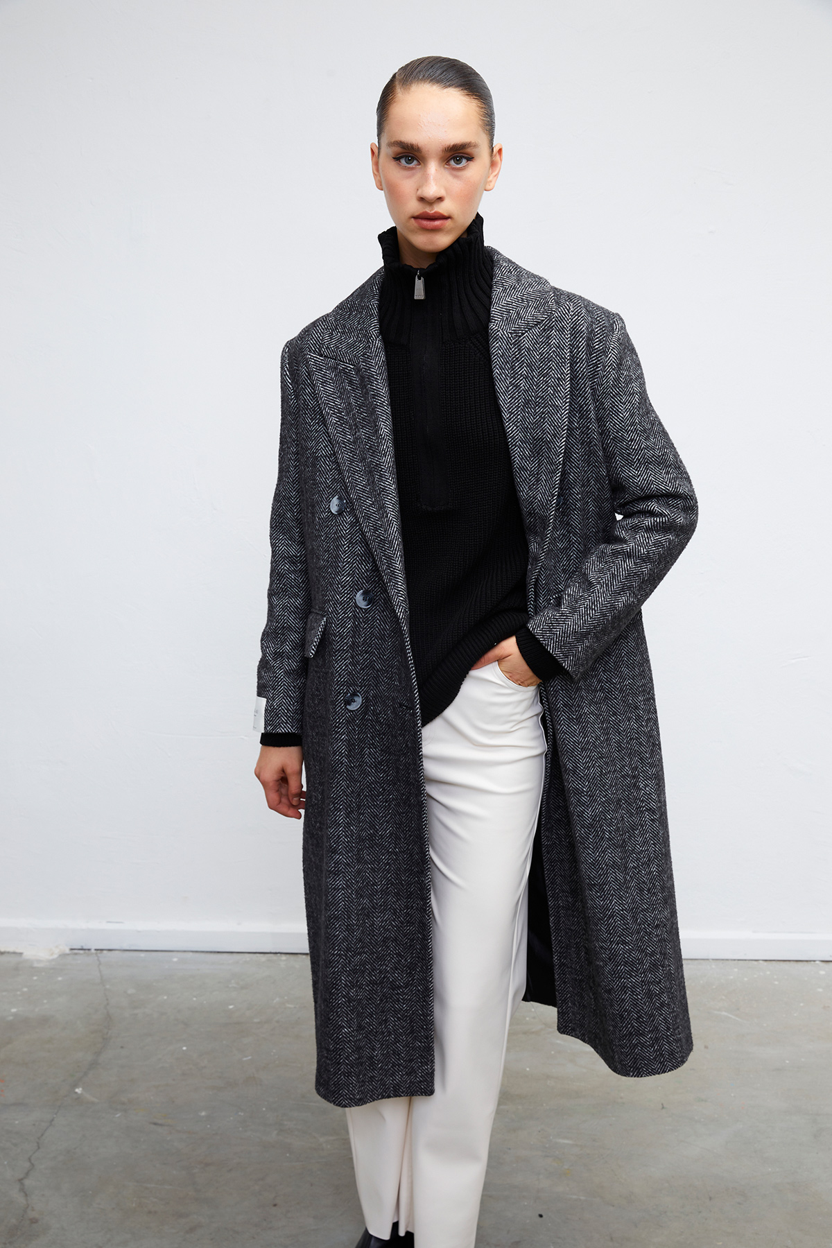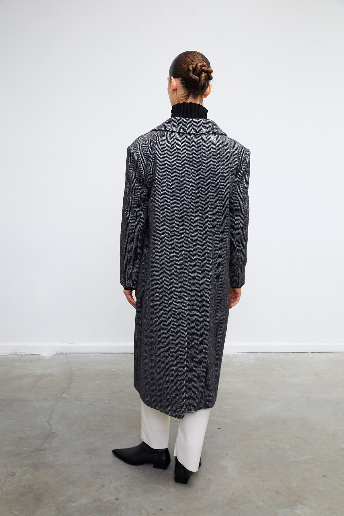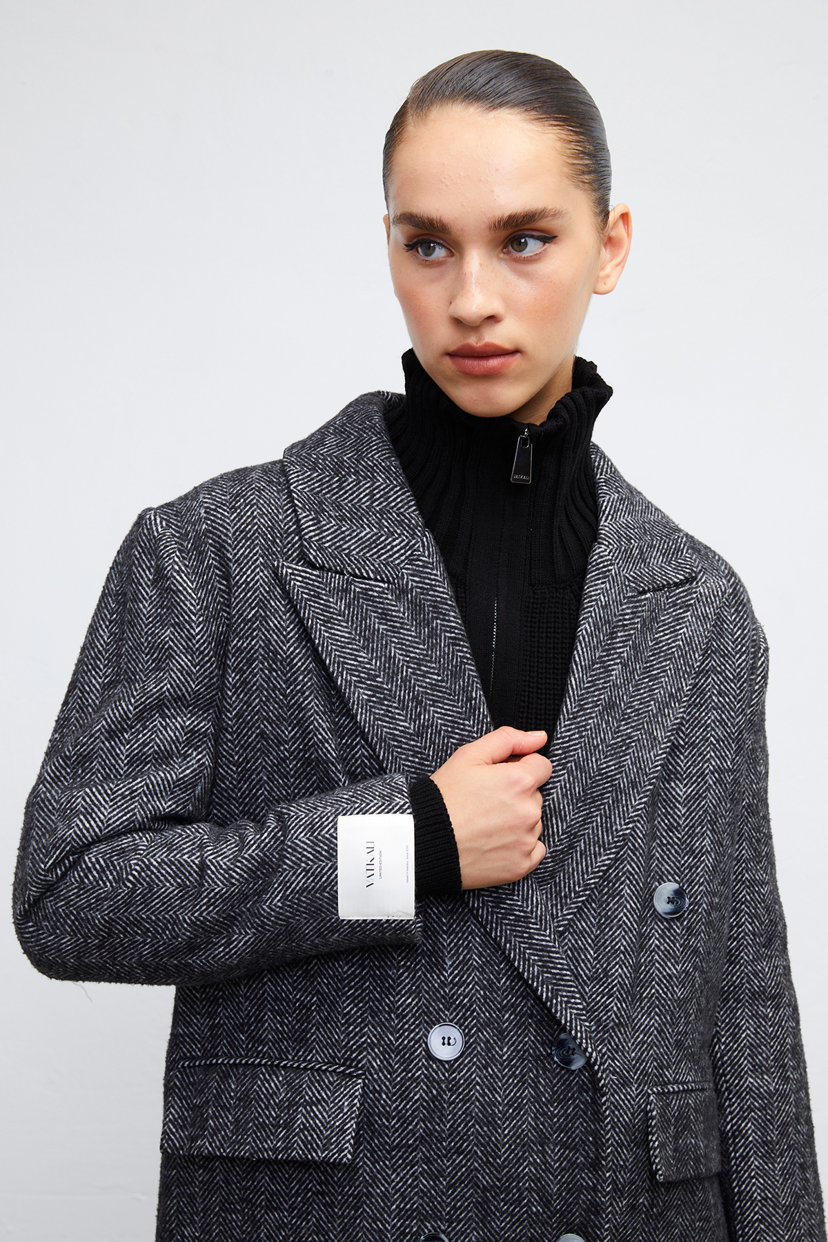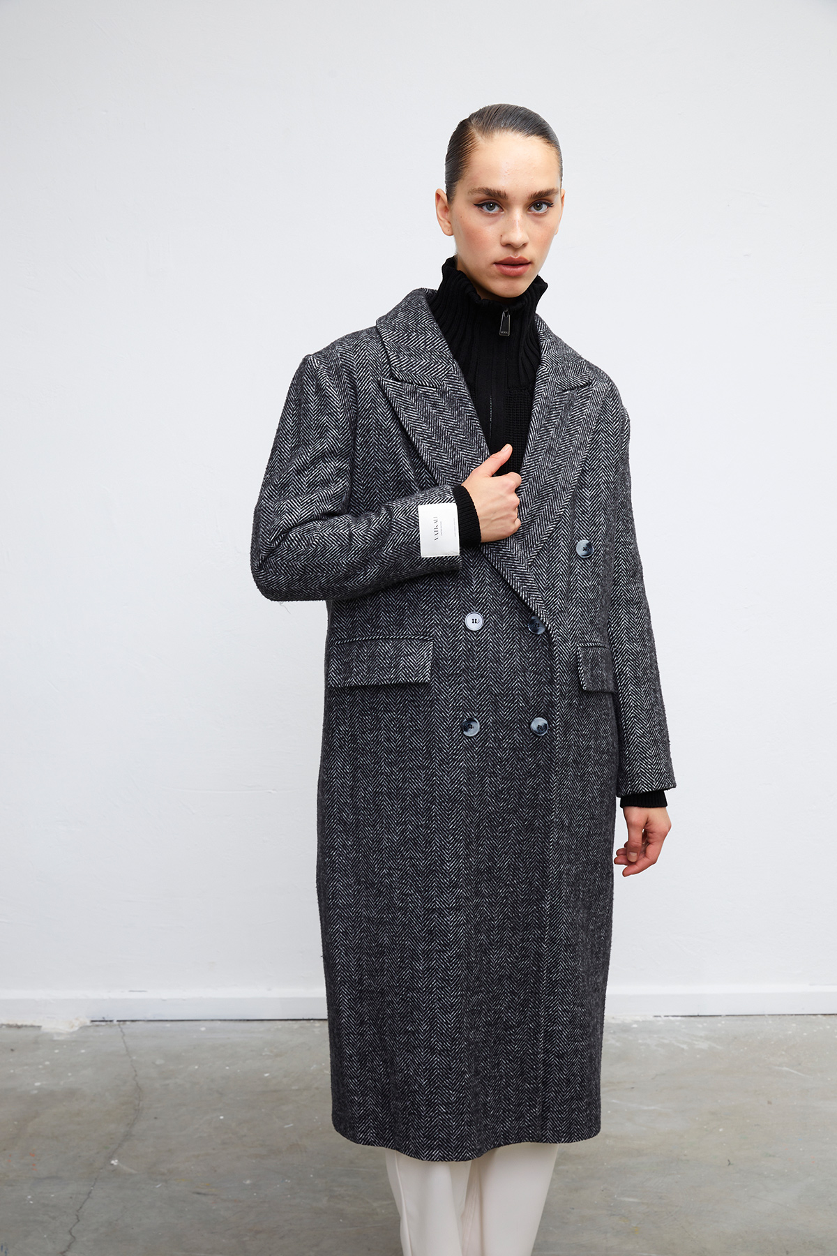 Kruvaze yaka, Önü düğmeli, Astarlı, Arkası yırtmaç detaylı, Yanları iki sahte cepli, Yün karışımlı kaban.