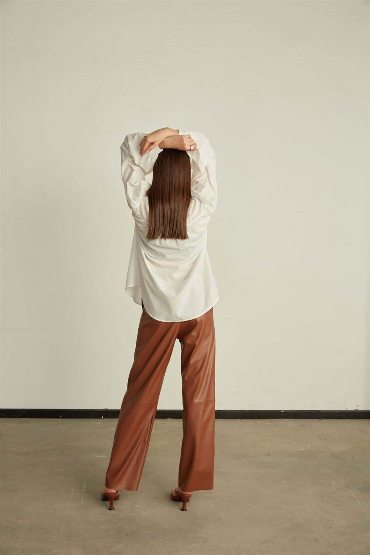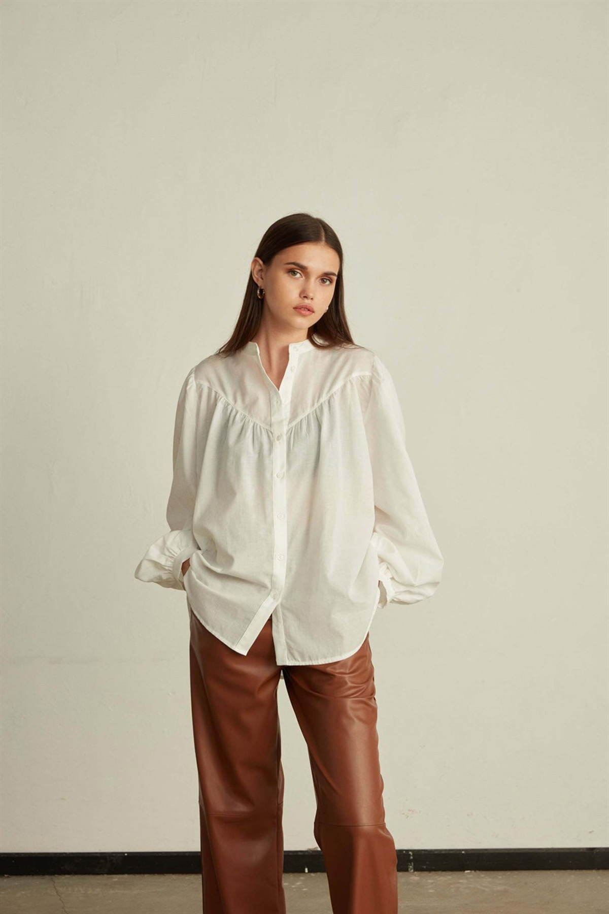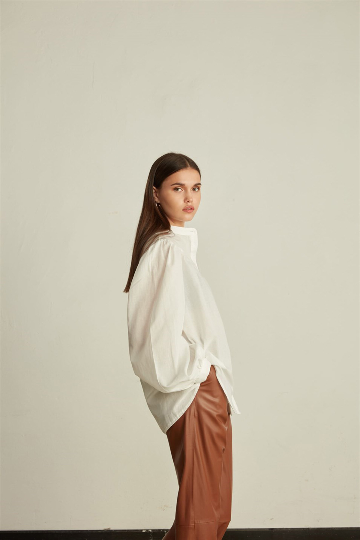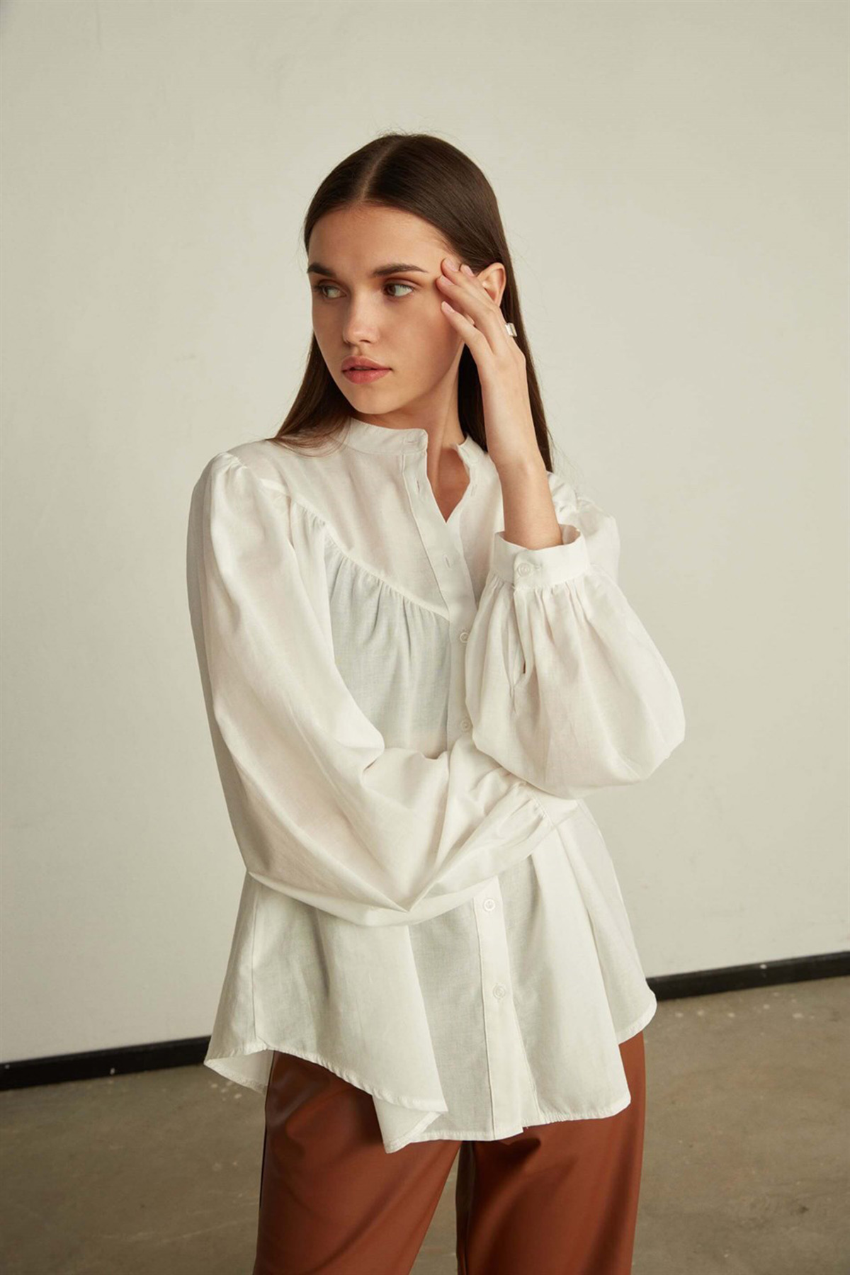 Bisiklet yakalı, balon kollu, iç gösteren kumaş, kolları pensli, oversize kadın gömlek.
