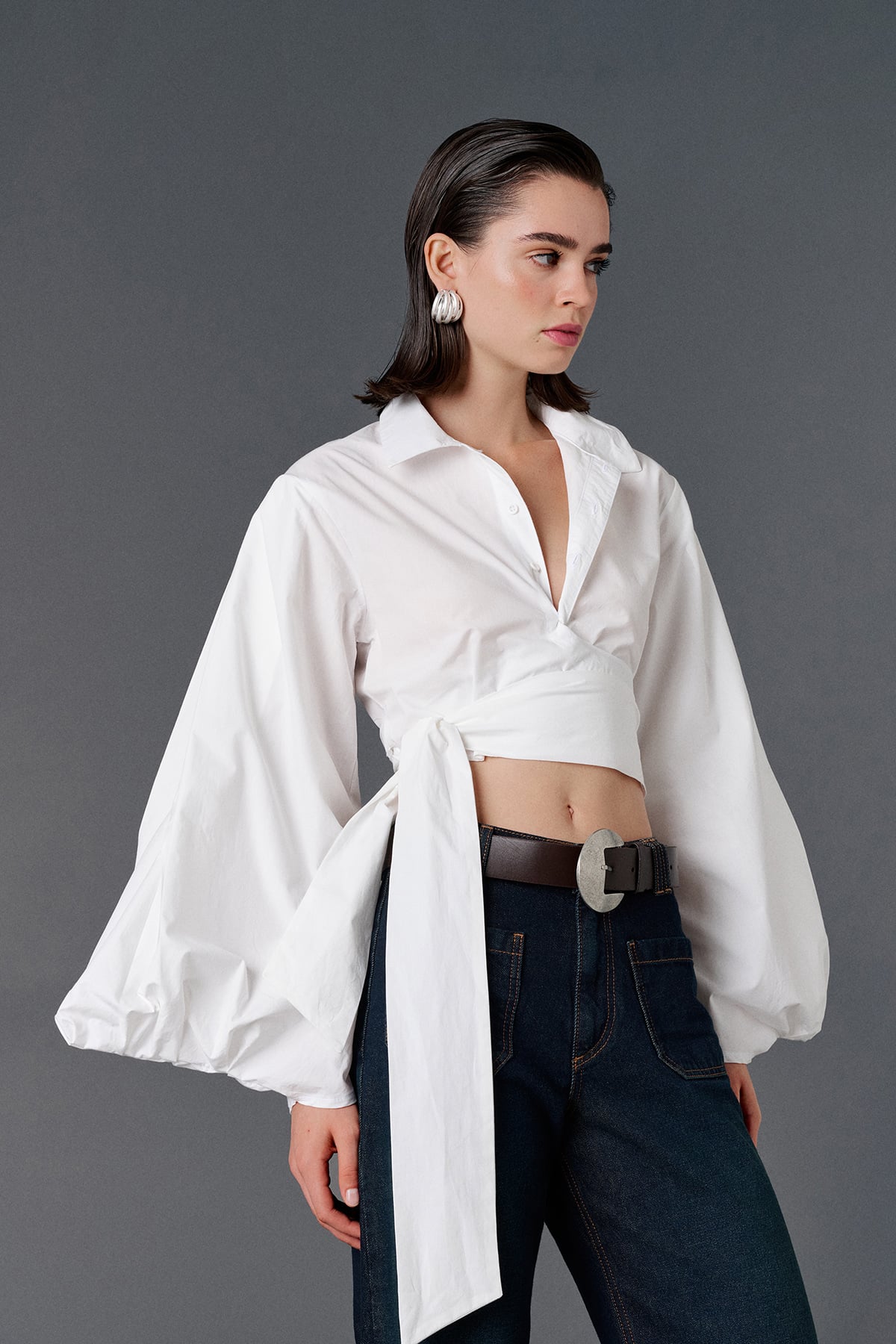 Kruvaze, belden bağlama detaylı, düğme kapamalı, balon kollu crop gömlek.