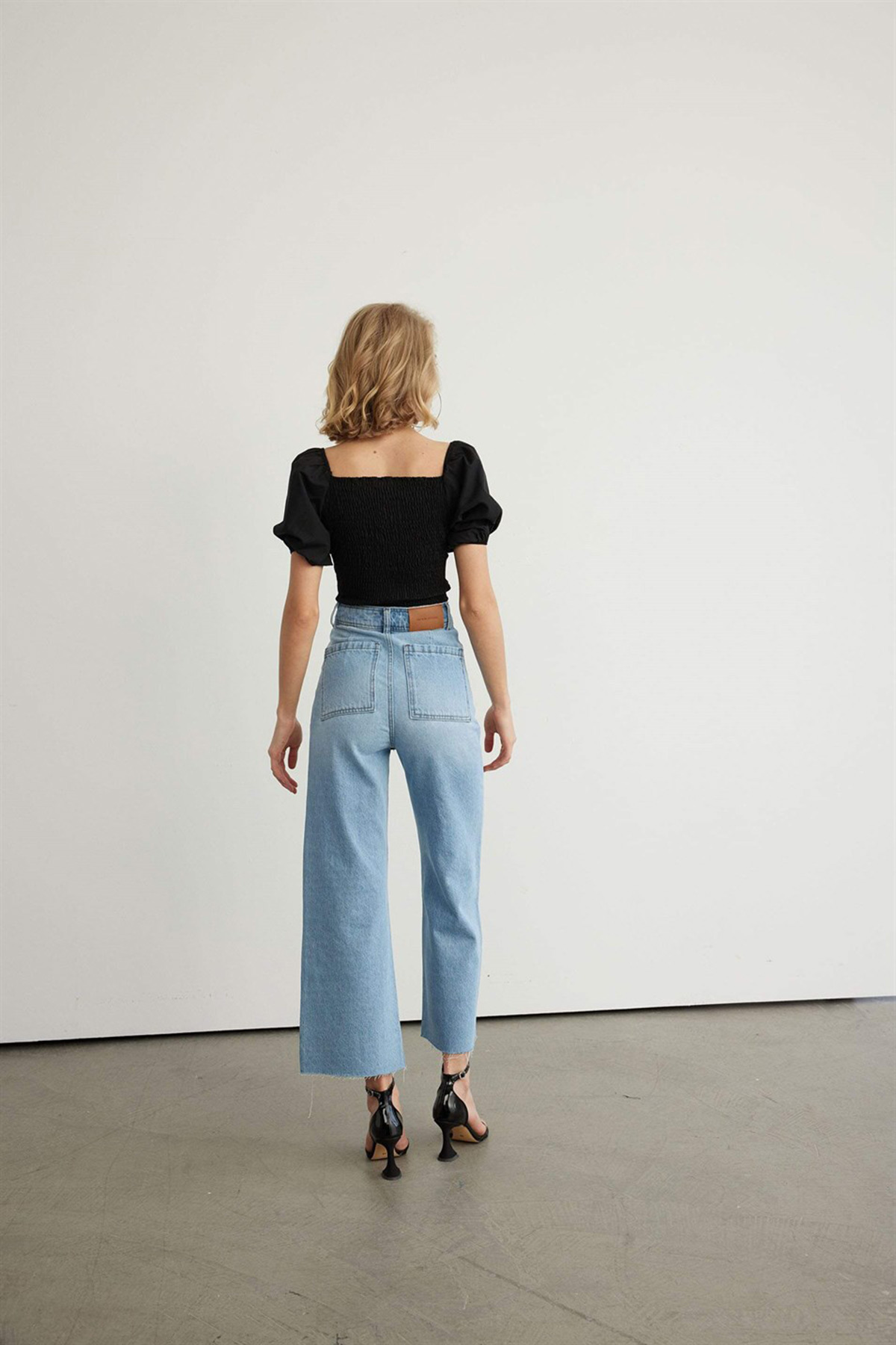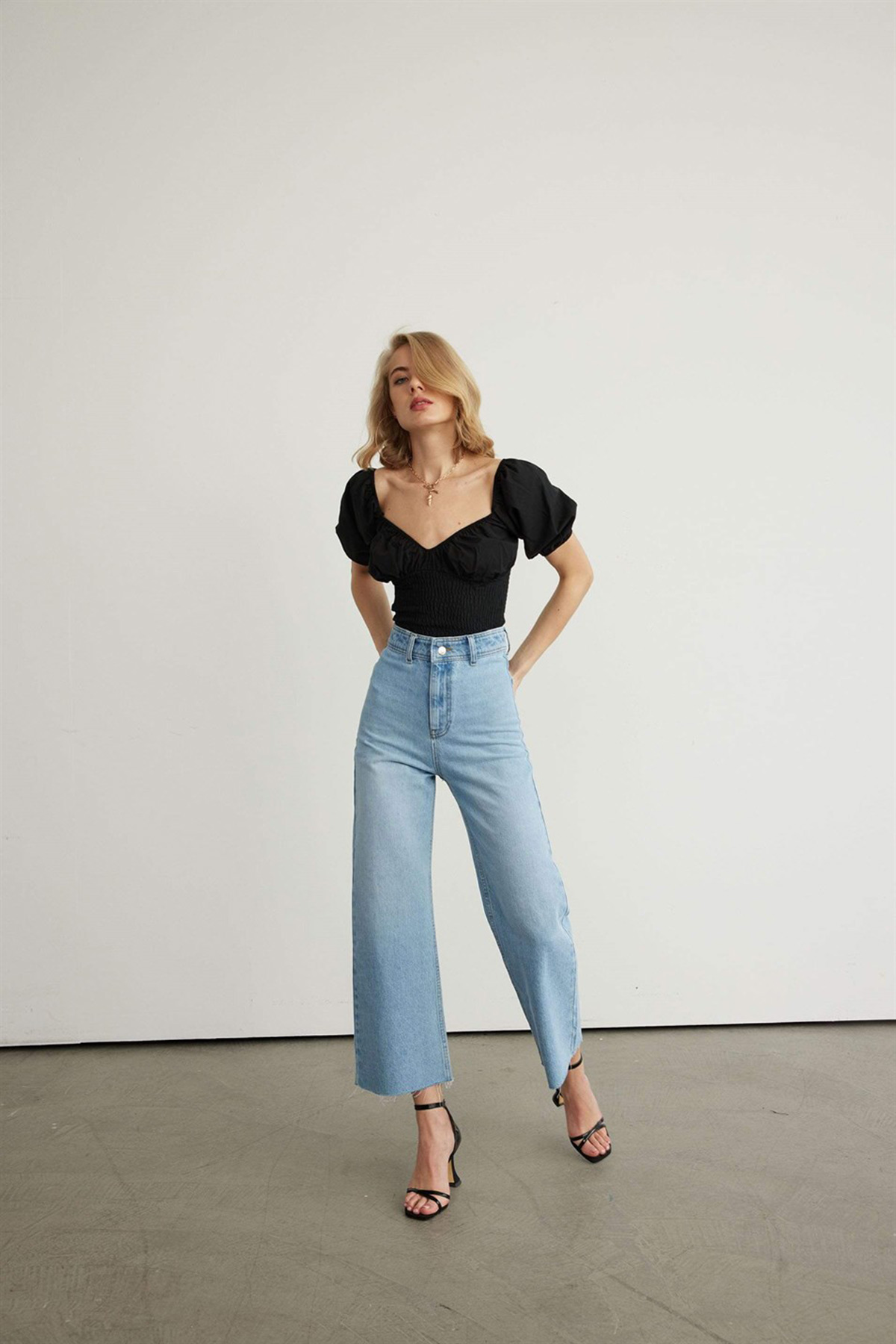 Kısa balon kollu, kayık yaka, poplin model kadın bluz.