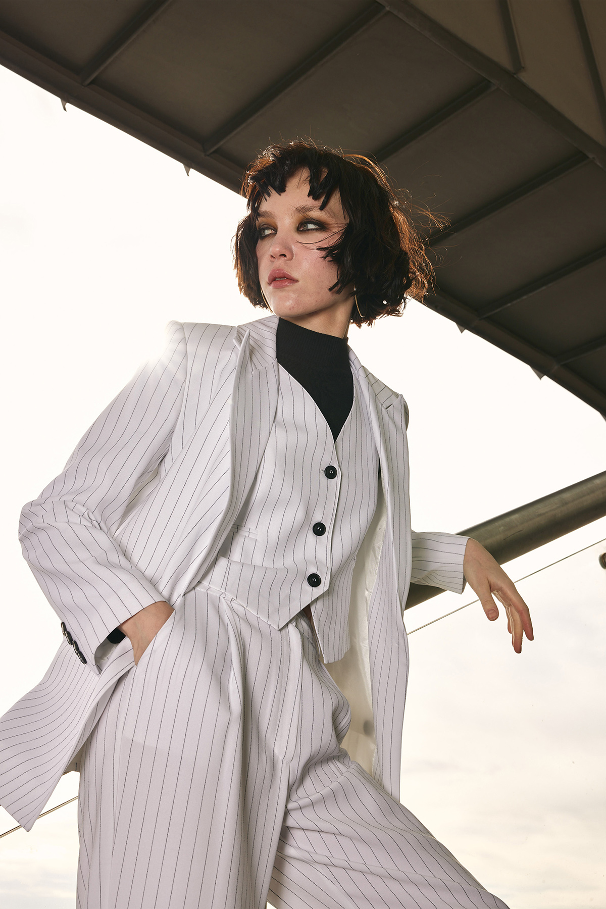 Kruvaze yaka, Tam kalıp, Önü tek düğmeli, Yanları iki cepli, Vatkalı, İçi astarlı blazer ceket.