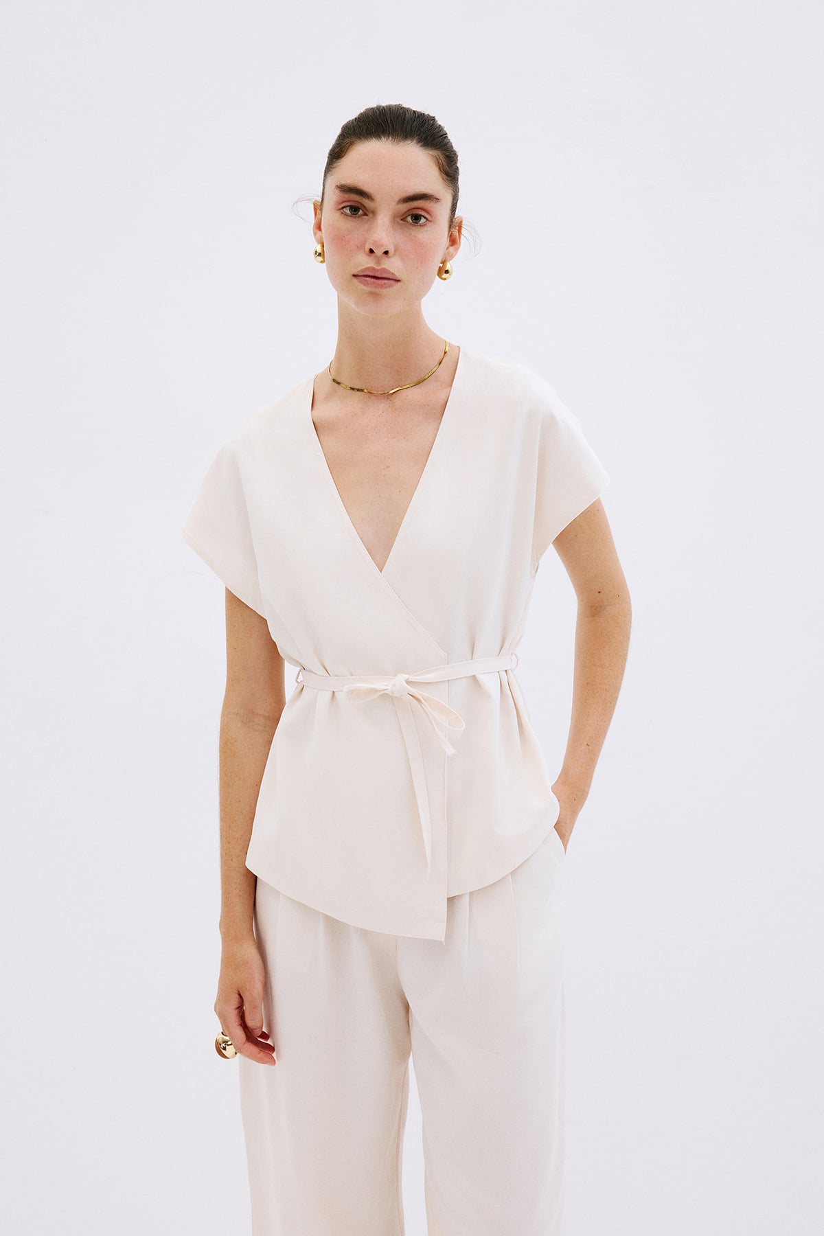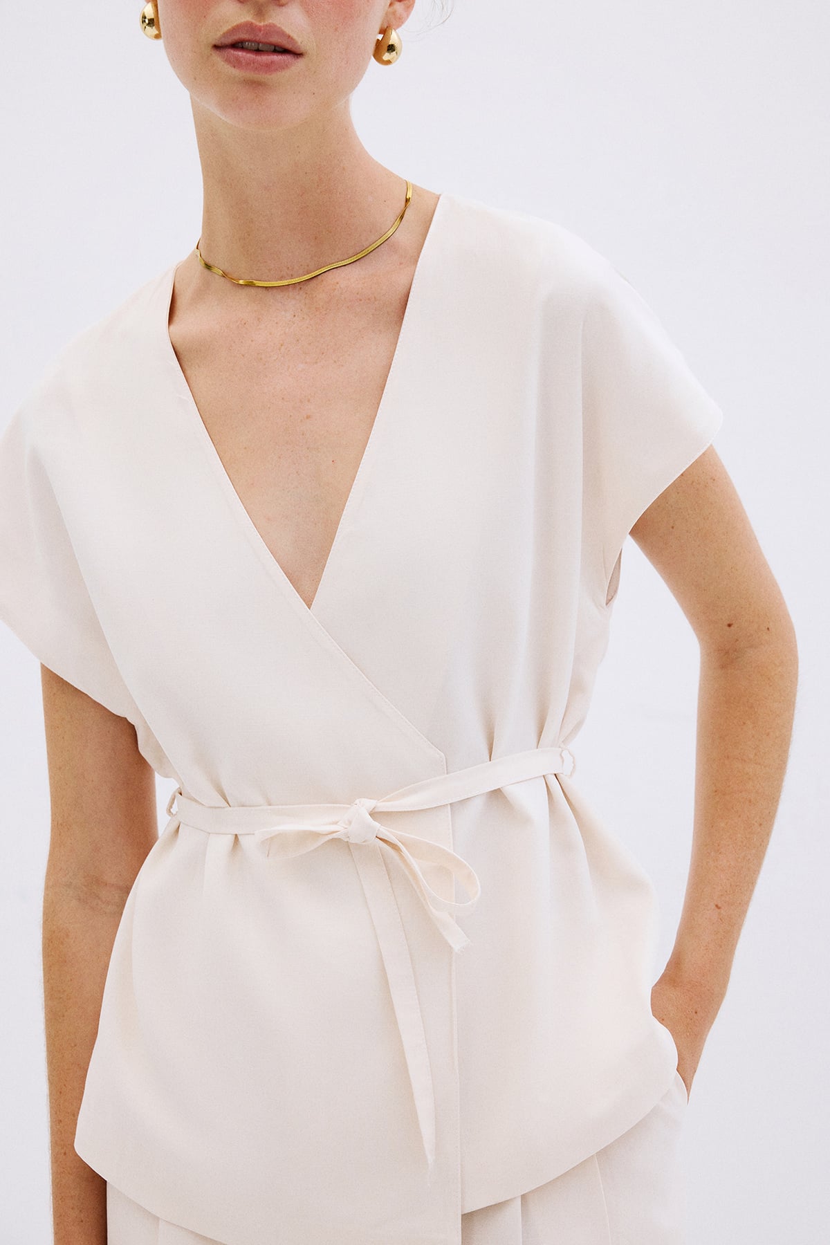 V yaka, kısa kollu, beli bağlamalı yelek bluz