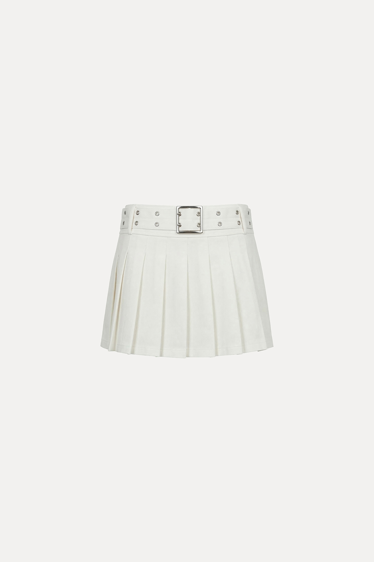 Yüksek bel, pilili, astarlı, kemerli, iç göstermeyen mini etek