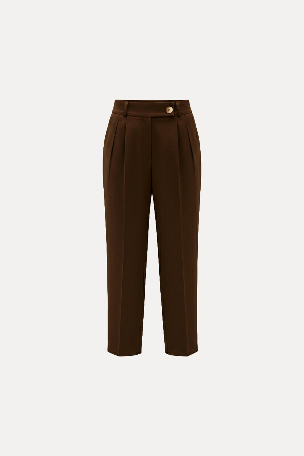 Yüksek bel, havuç kesim, önü tek düğme ve fermuar kapamalı, ön pilili, 2 yan cepli, carrot fit pantolon.
