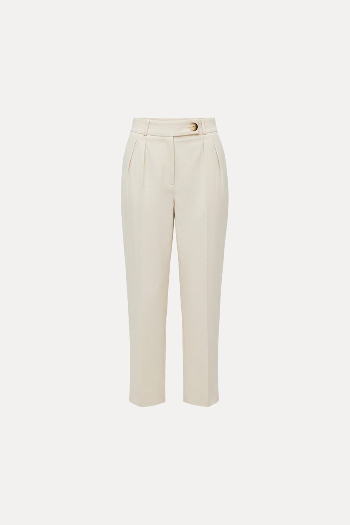 Yüksek bel, havuç kesim, önü tek düğme ve fermuar kapamalı, ön pilili, 2 yan cepli, carrot fit pantolon.