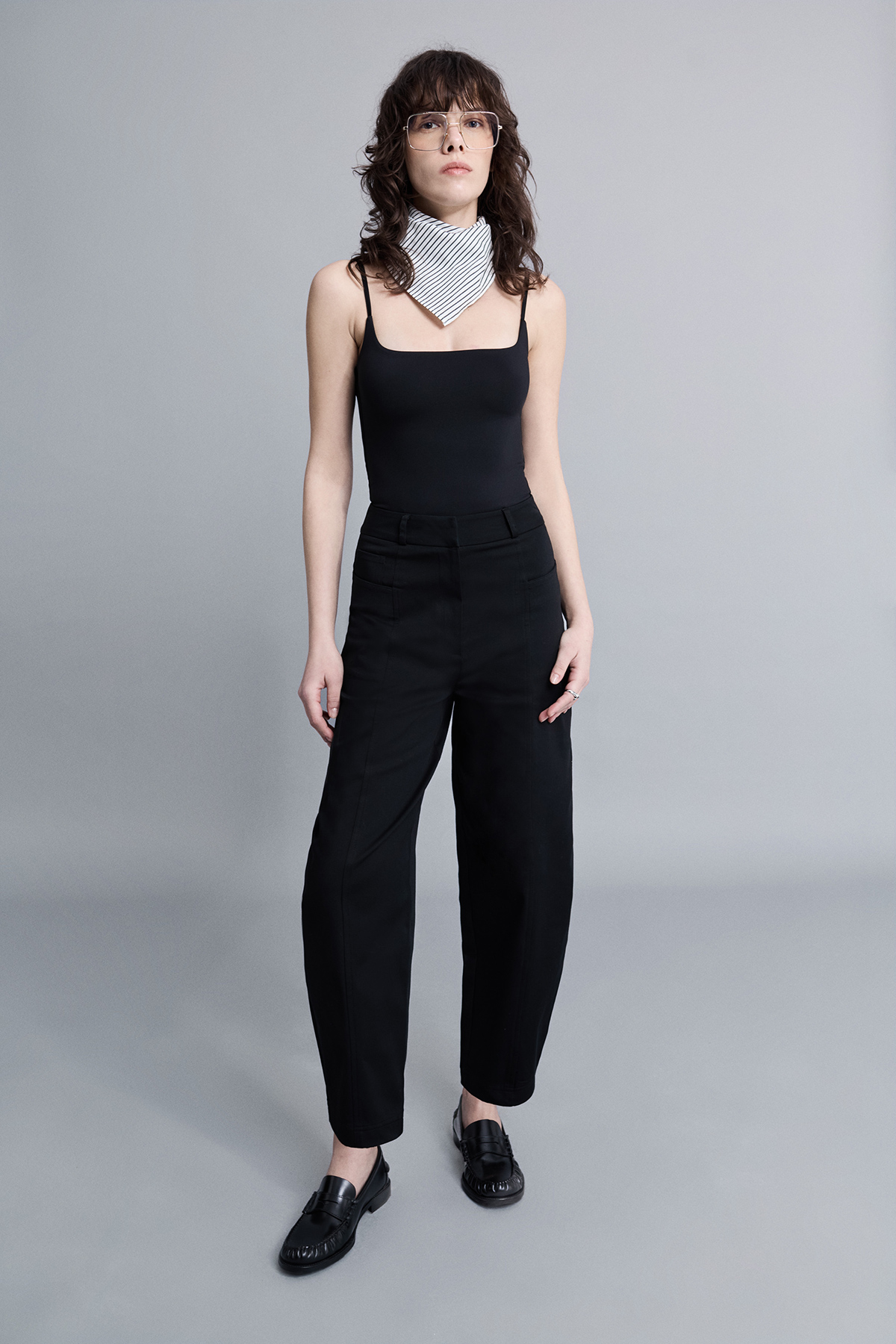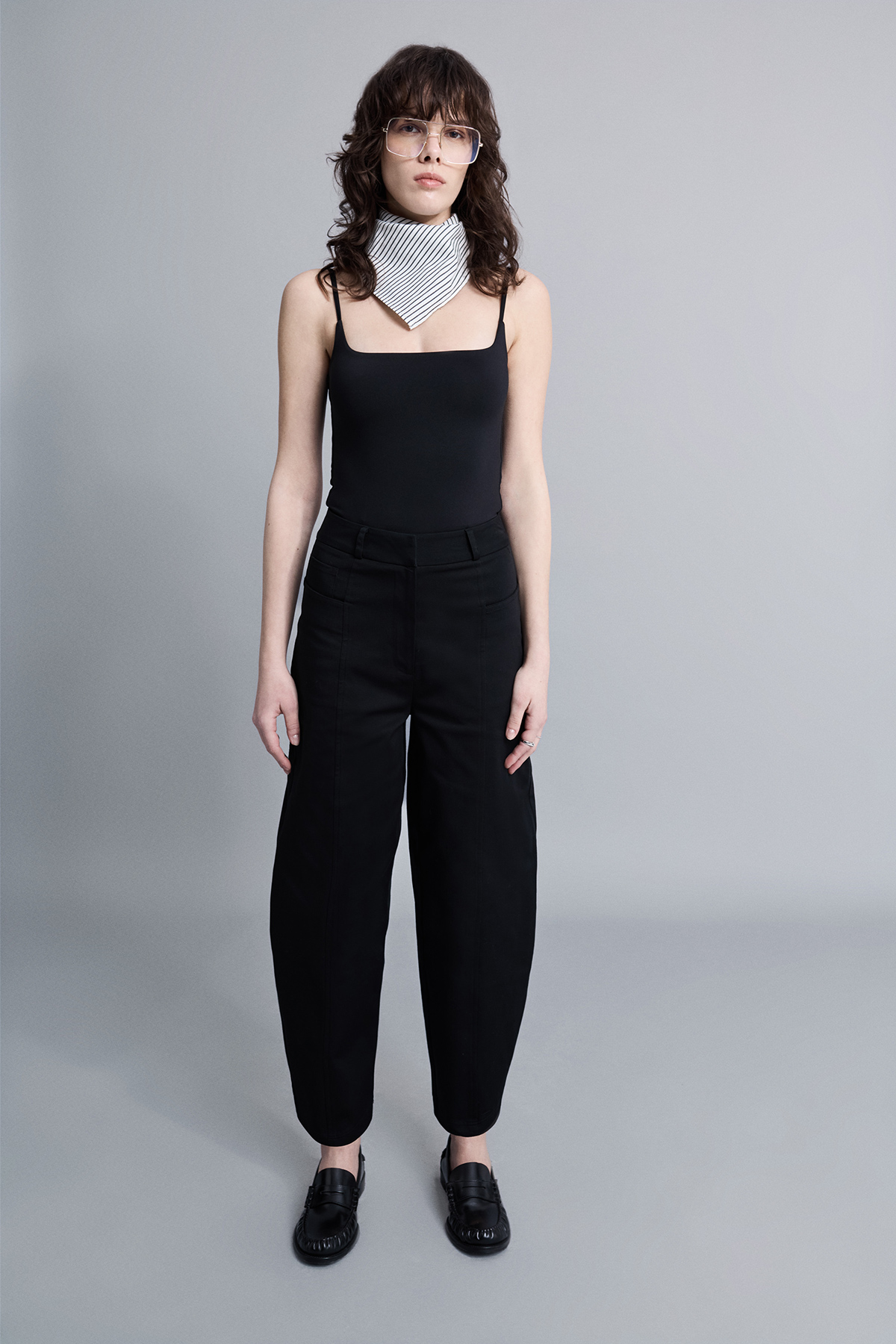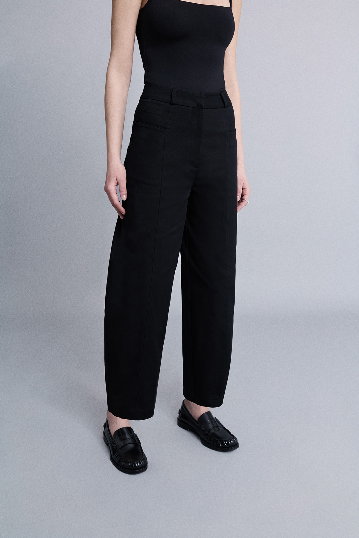 Önden cep detaylı, fermuar, klips ve düğme kapamalı, barrel pantolon.