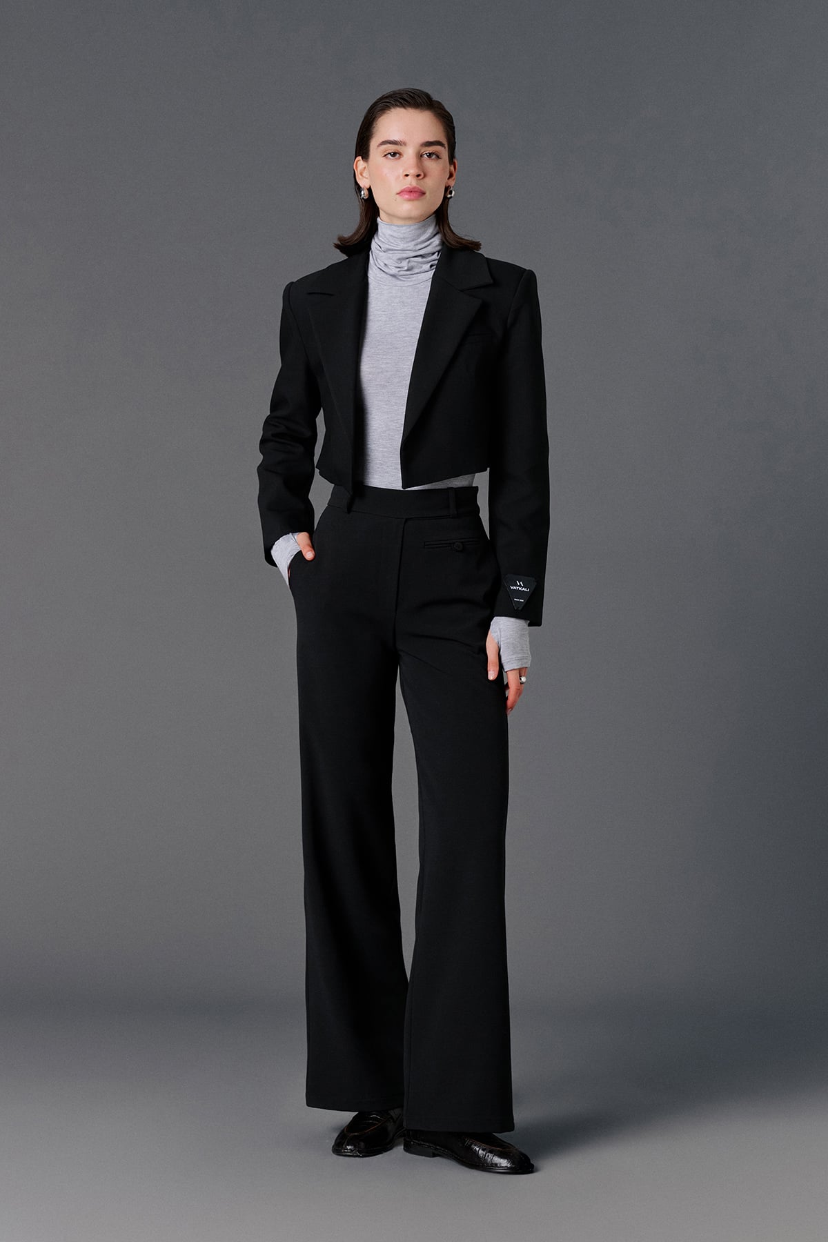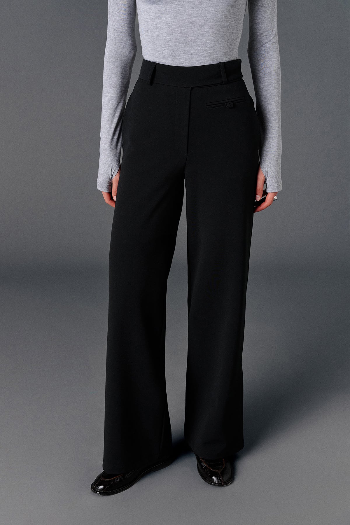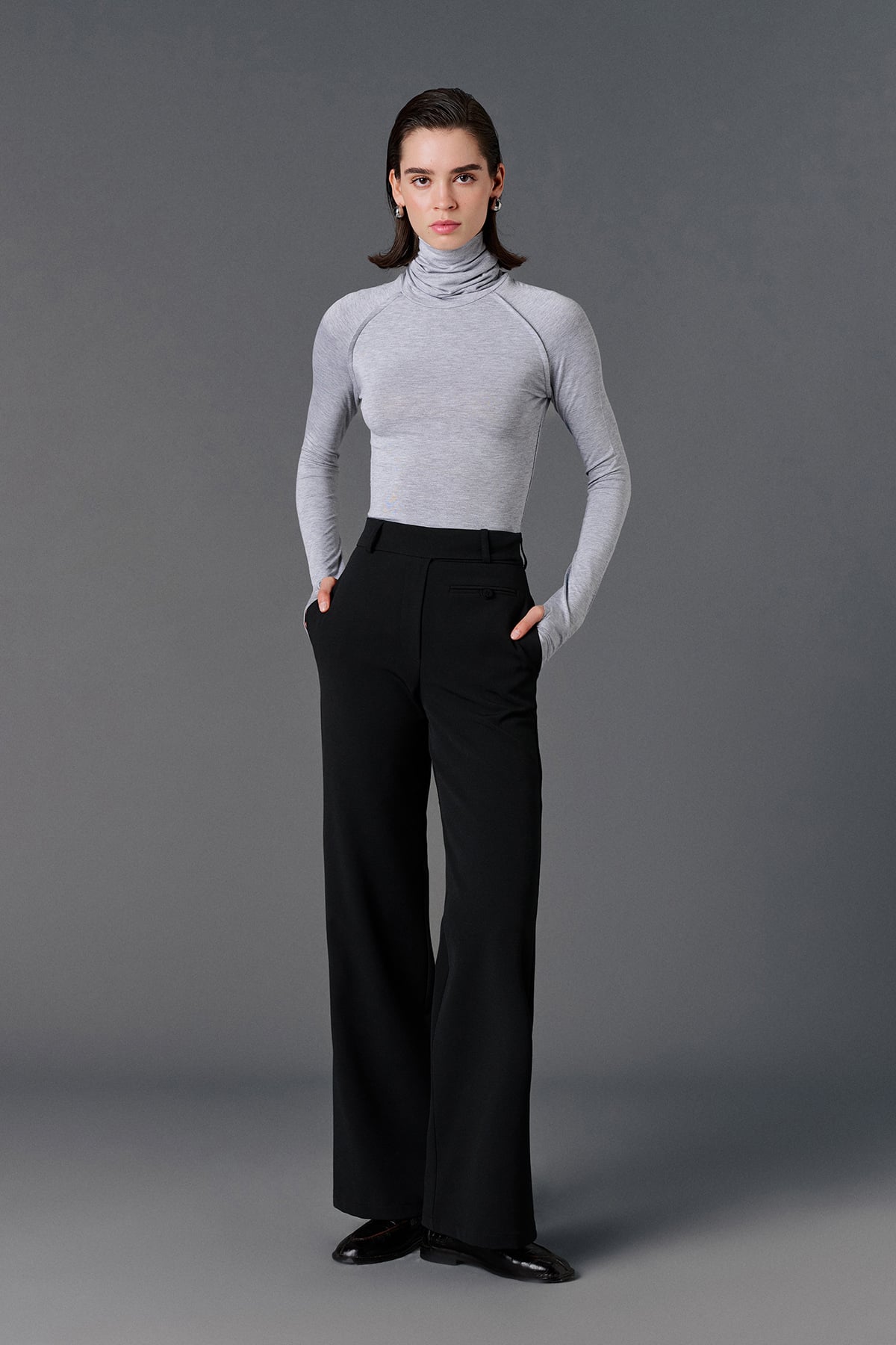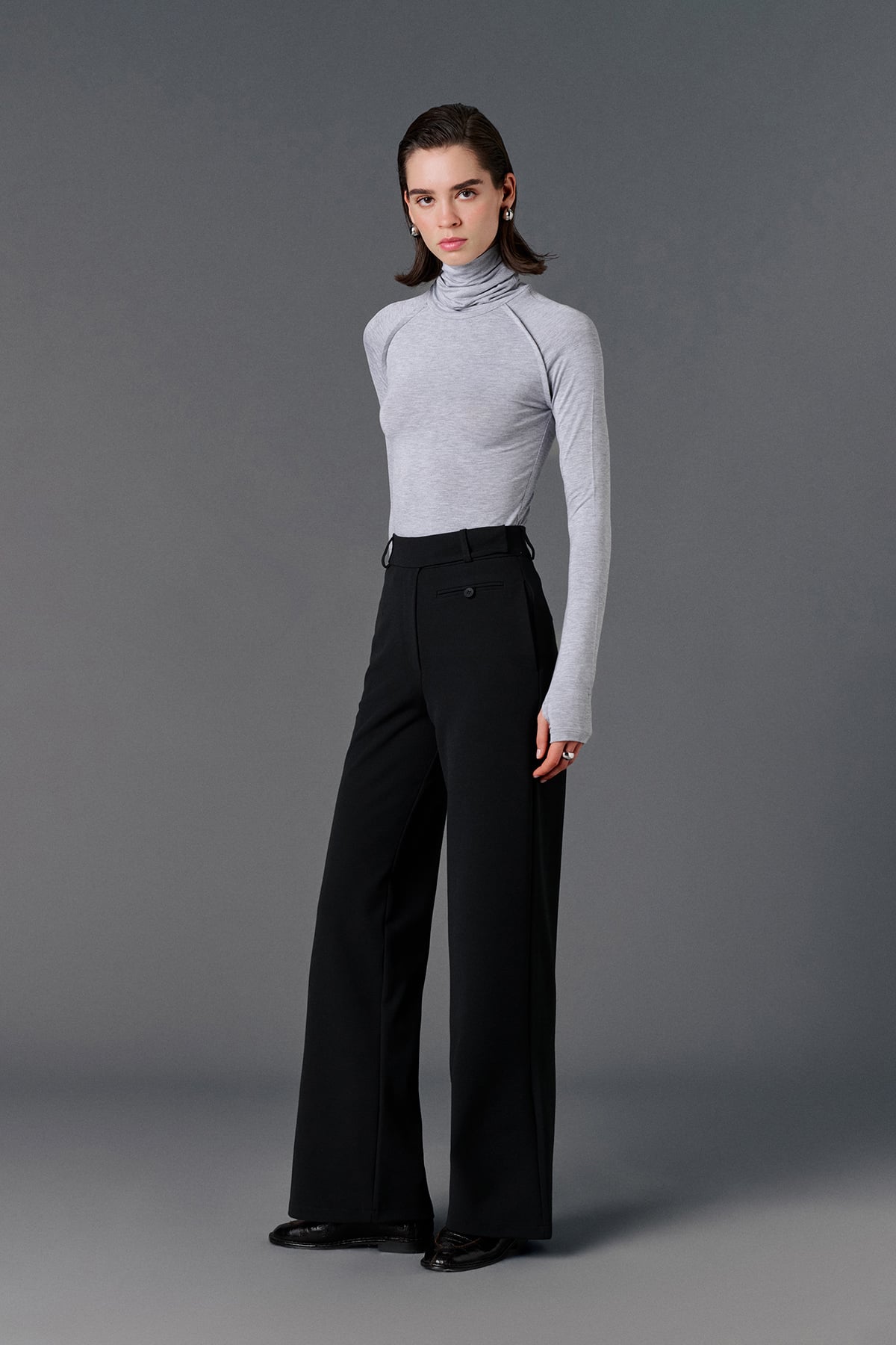 Yüksek bel, önden düğme ve fermuar kapamalı, yanlardan çift cepli, sol önünde aksesuar cep detaylı, casual kumaş pantolon.
