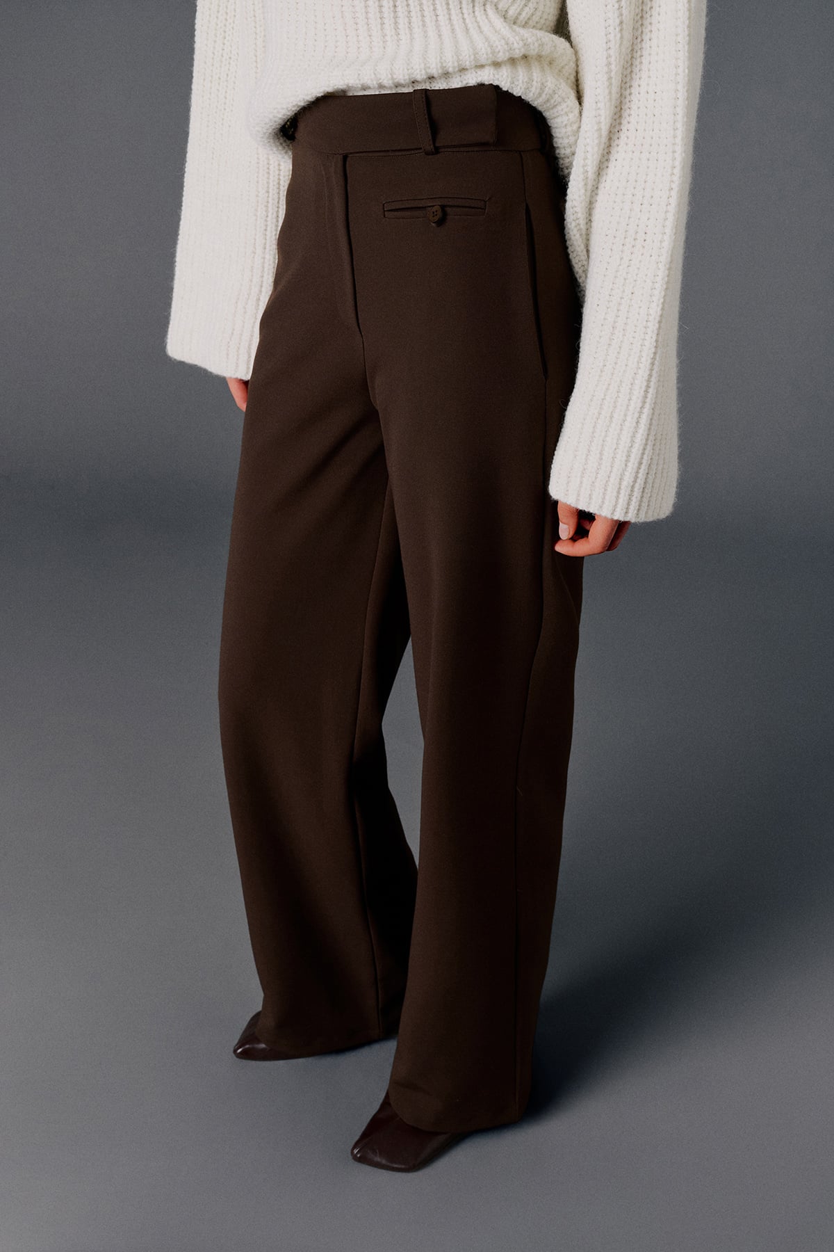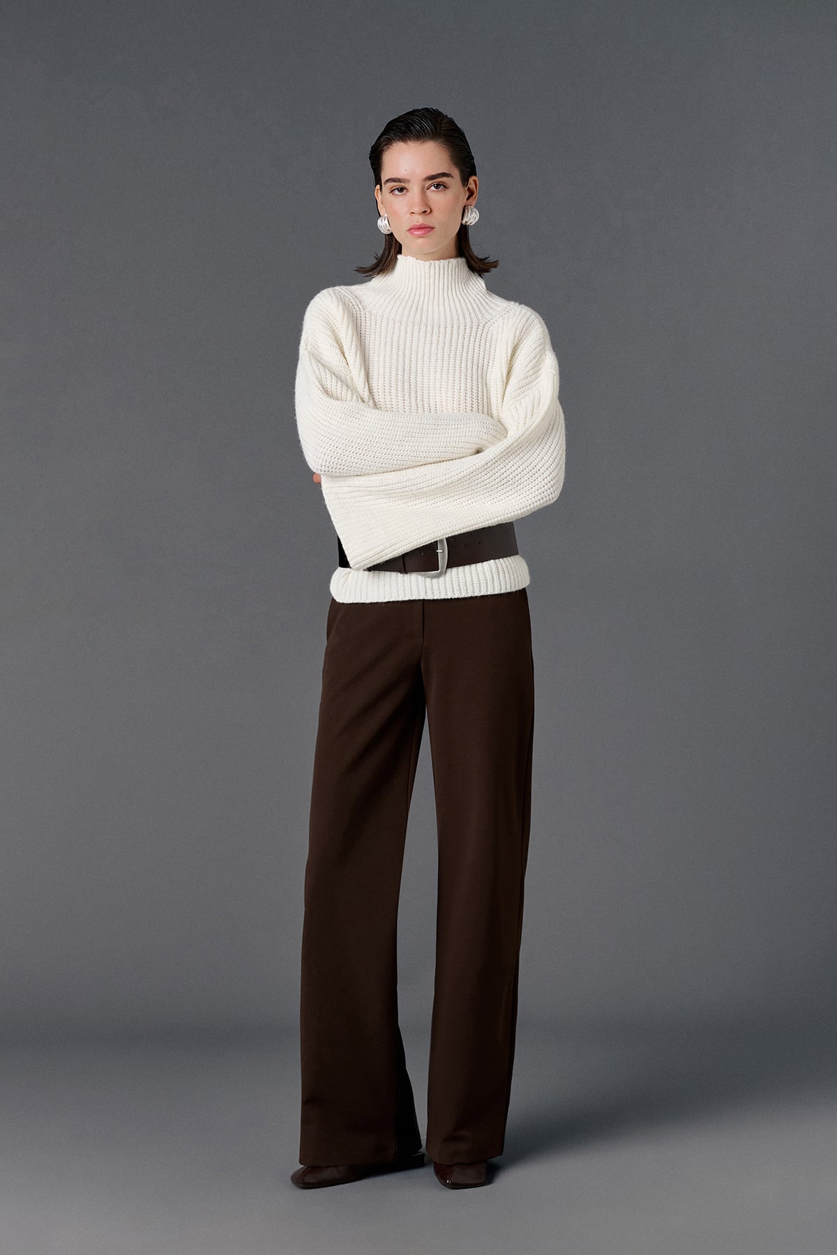 Yüksek bel, önden düğme ve fermuar kapamalı, yanlardan çift cepli, sol önünde aksesuar cep detaylı, casual kumaş pantolon.