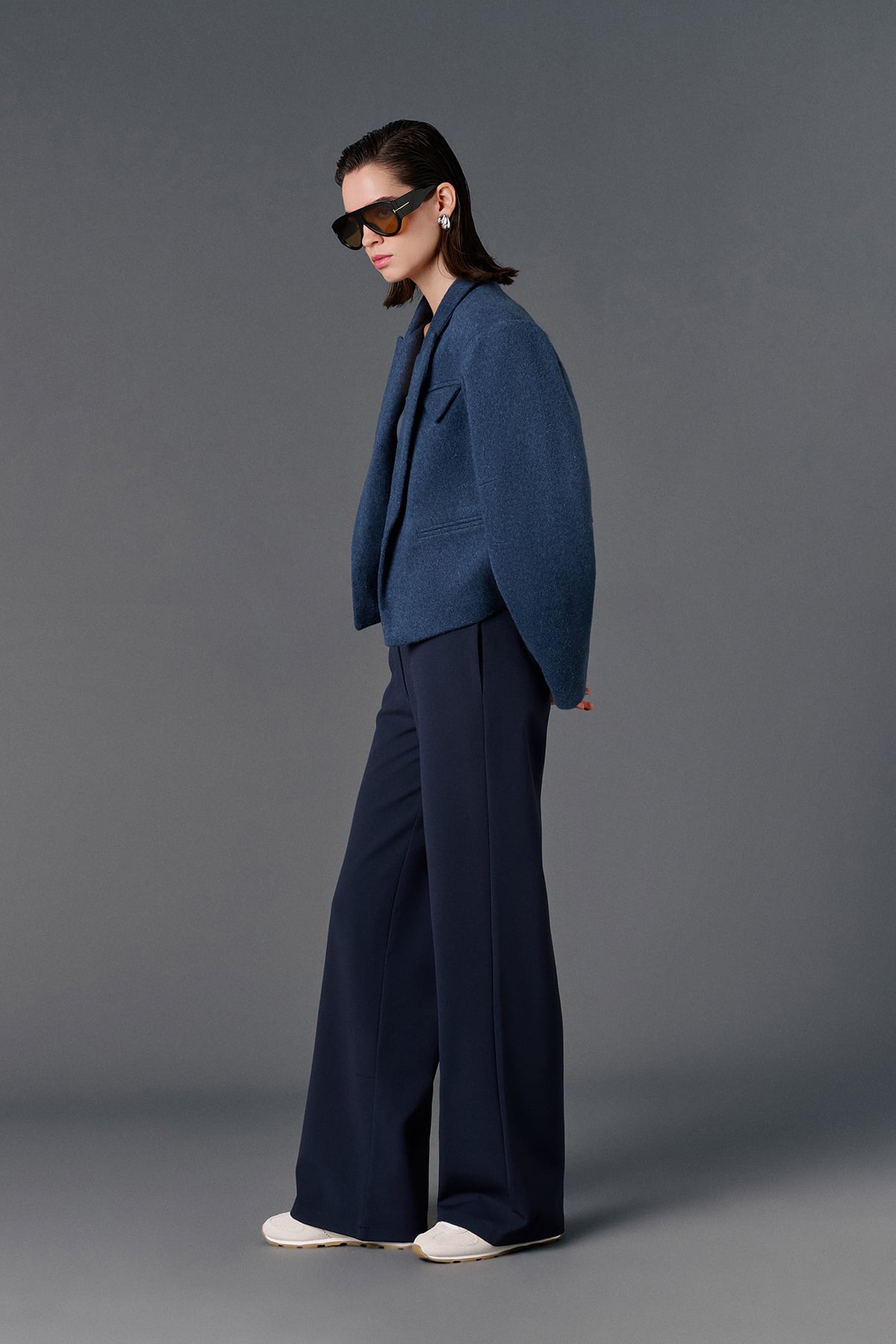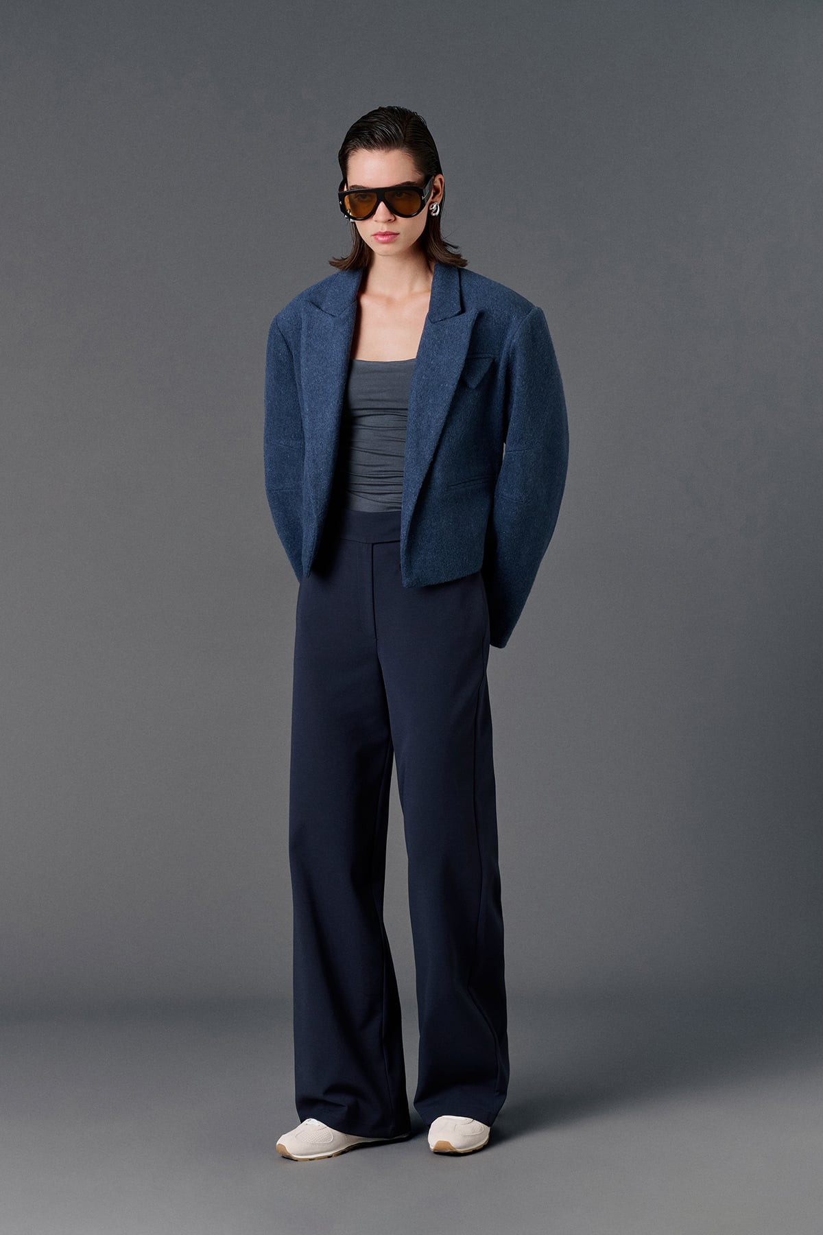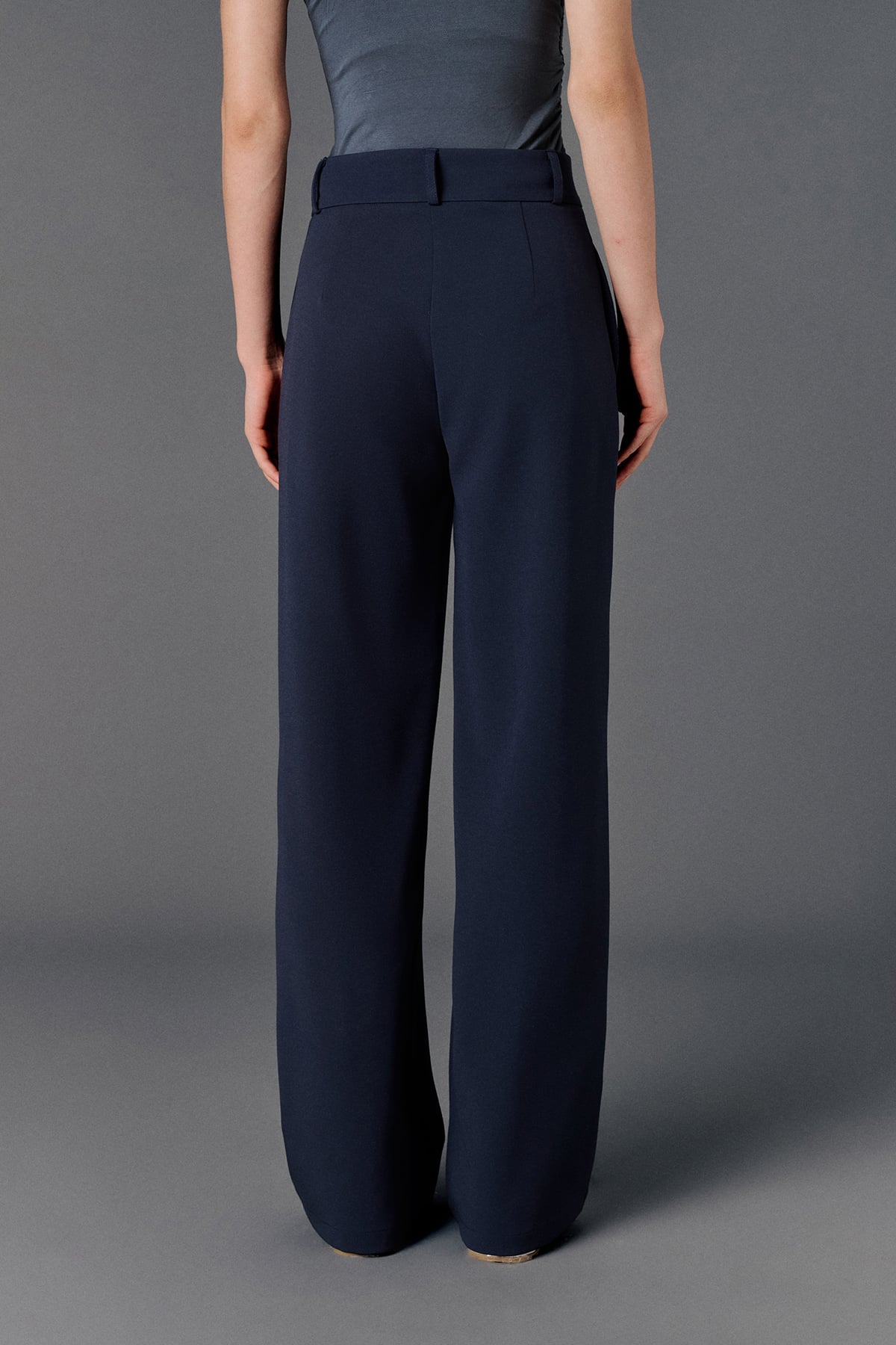 Yüksek bel, önden düğme ve fermuar kapamalı, yanlardan çift cepli, sol önünde aksesuar cep detaylı, casual kumaş pantolon.