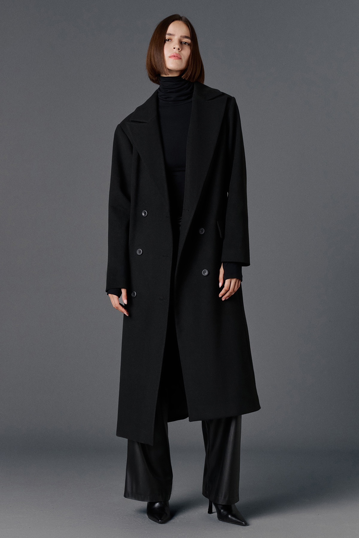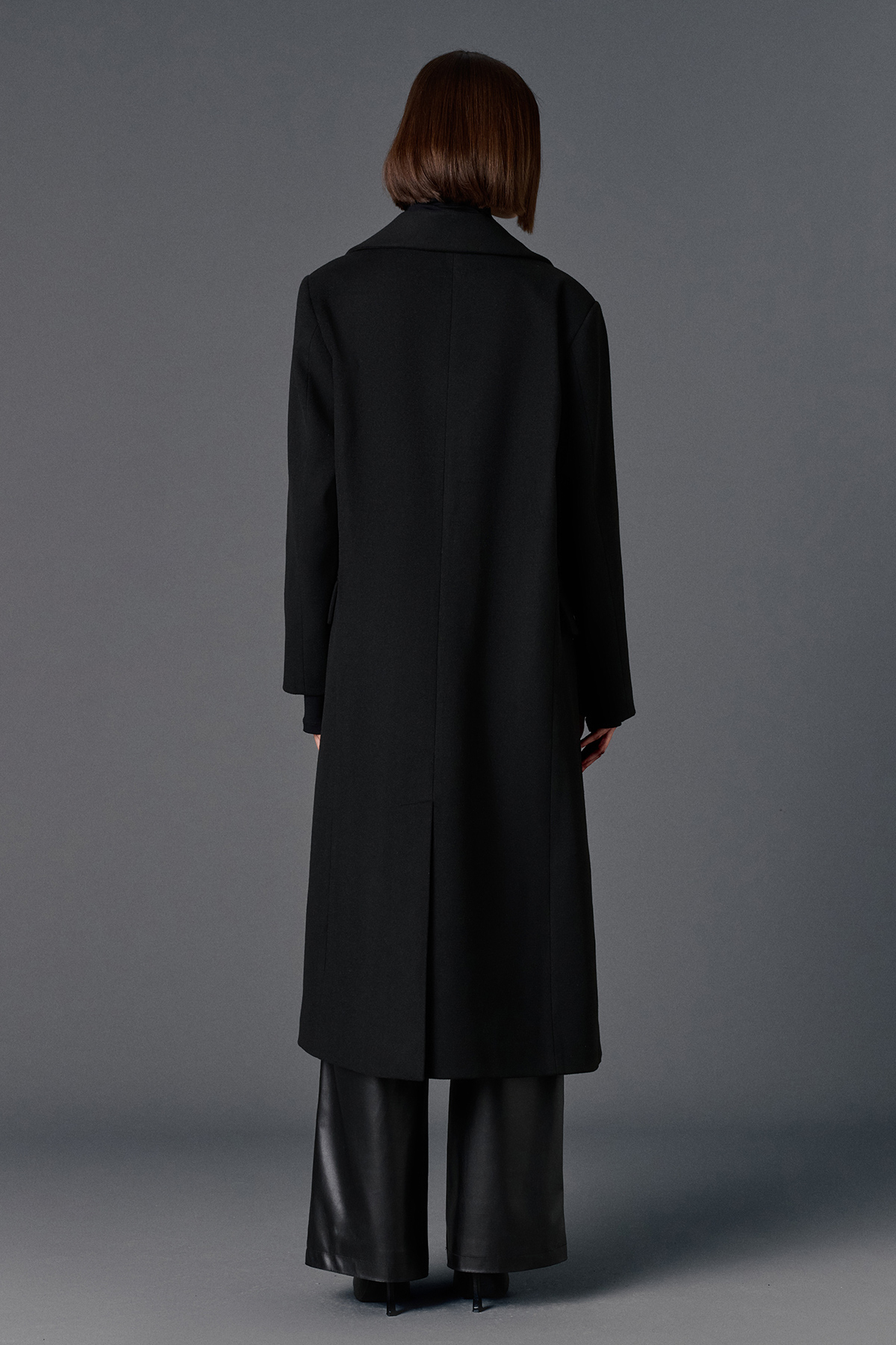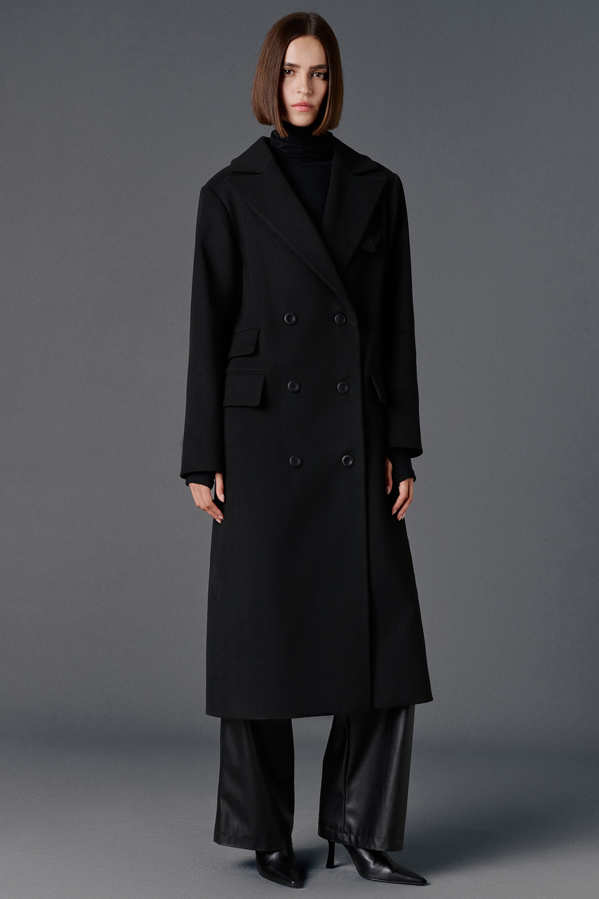Kruvaze yaka, düğme kapamalı, vatkalı, arkası yırtmaçlı, aksesuar cep detaylı(işlevsiz cep), astarlı, maxi kaban.