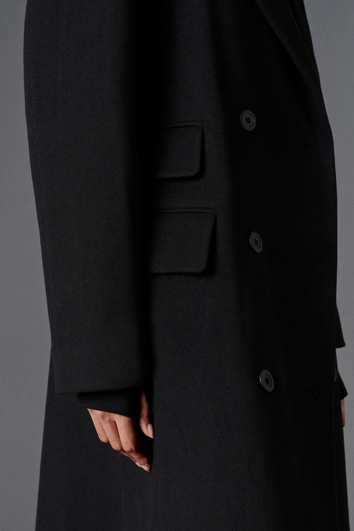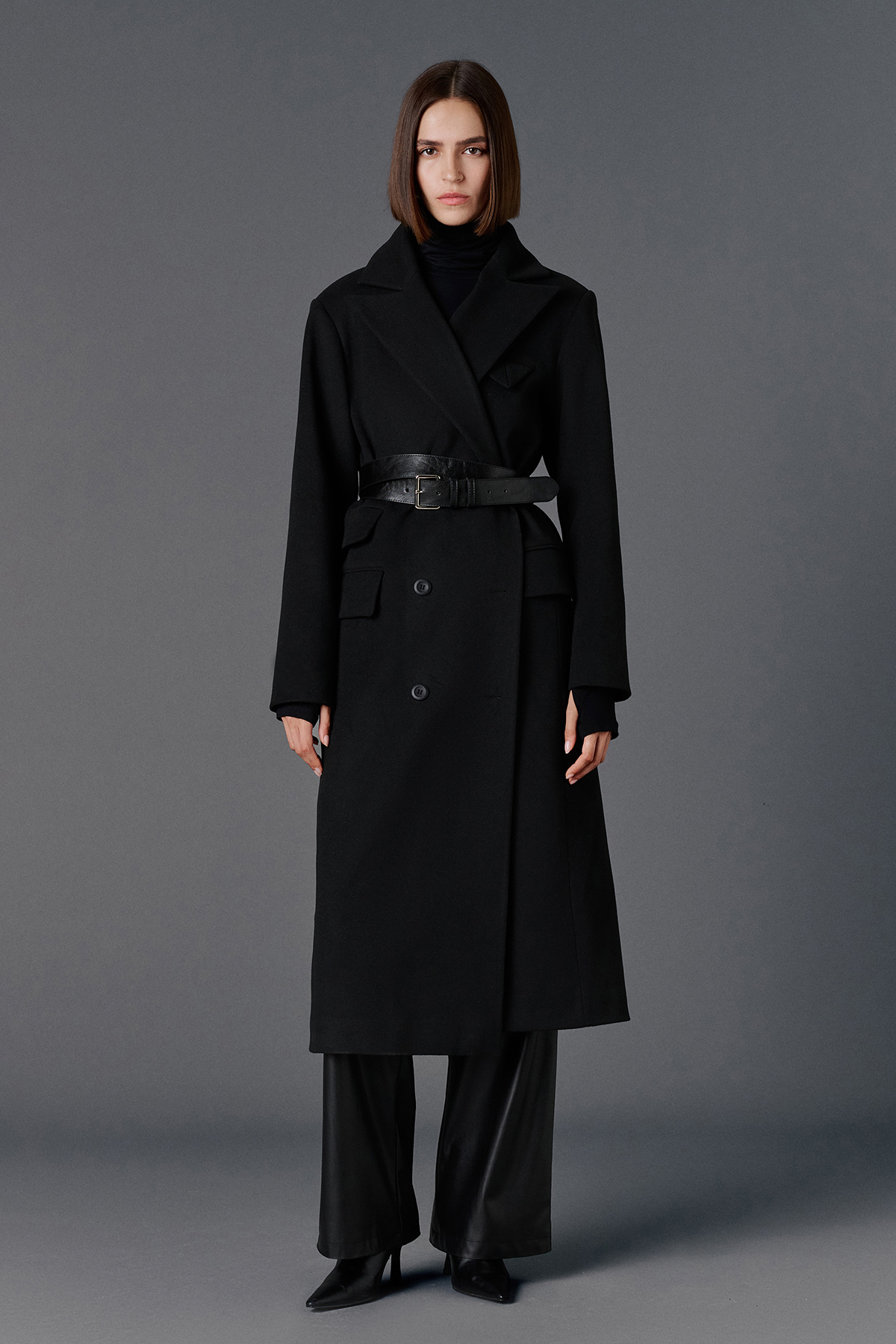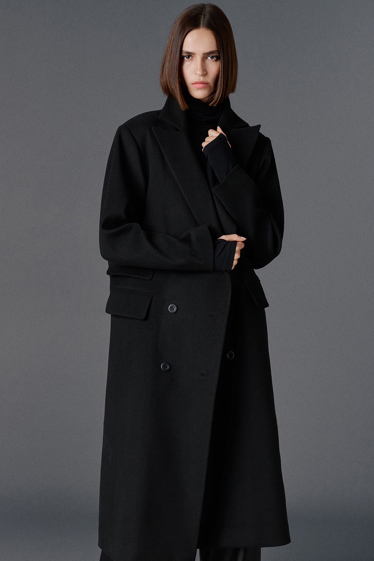 Kruvaze yaka, düğme kapamalı, vatkalı, arkası yırtmaçlı, aksesuar cep detaylı(işlevsiz cep), astarlı, maxi kaban.