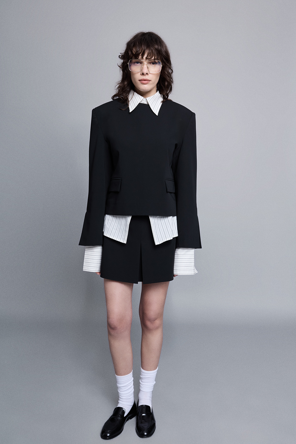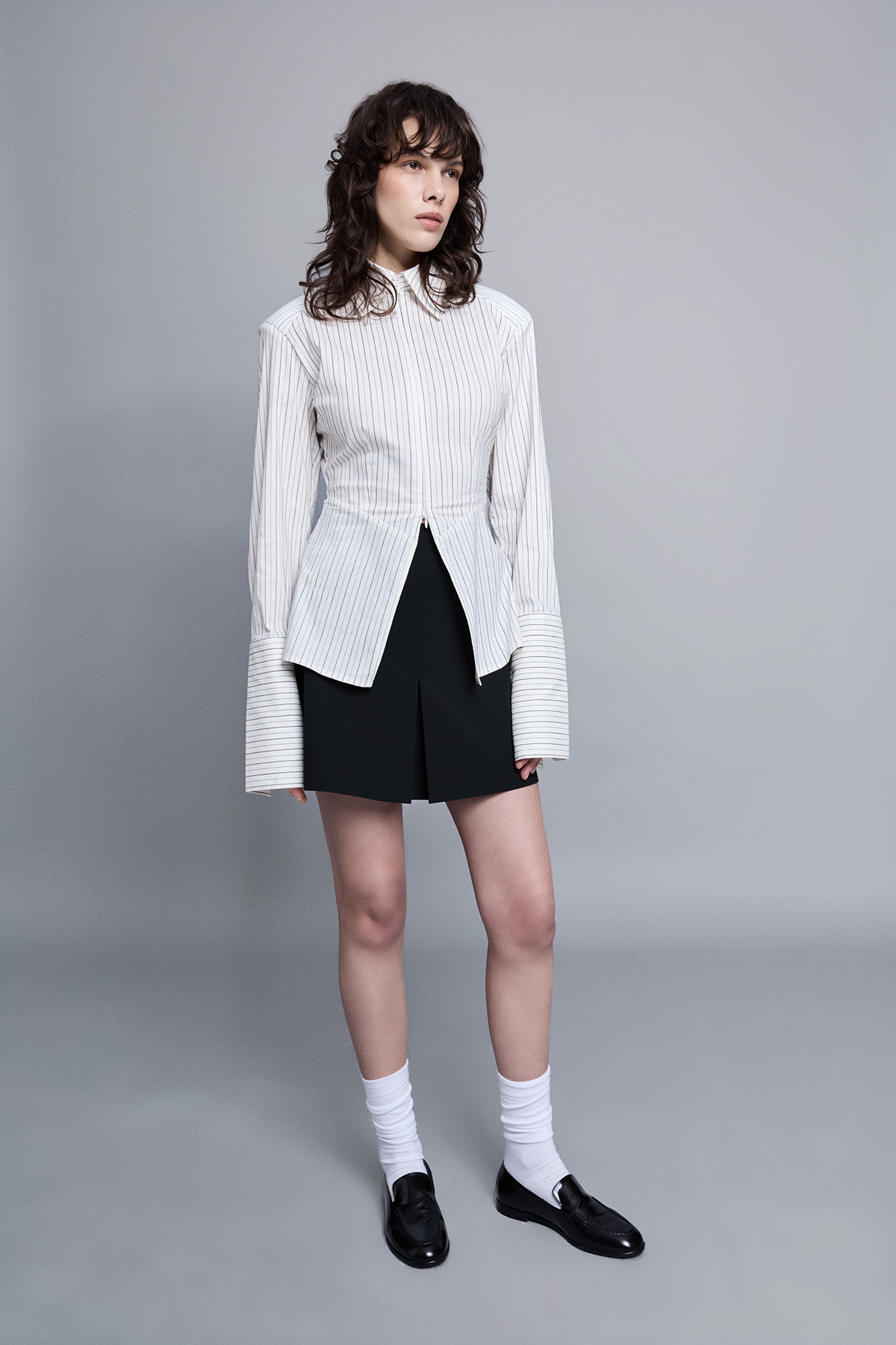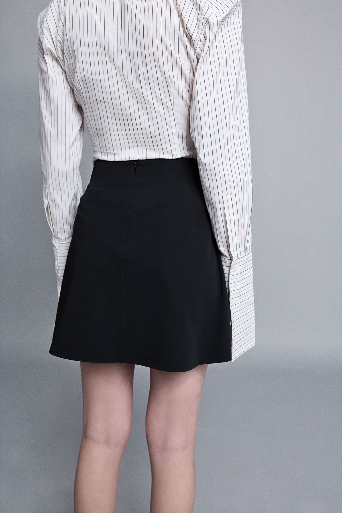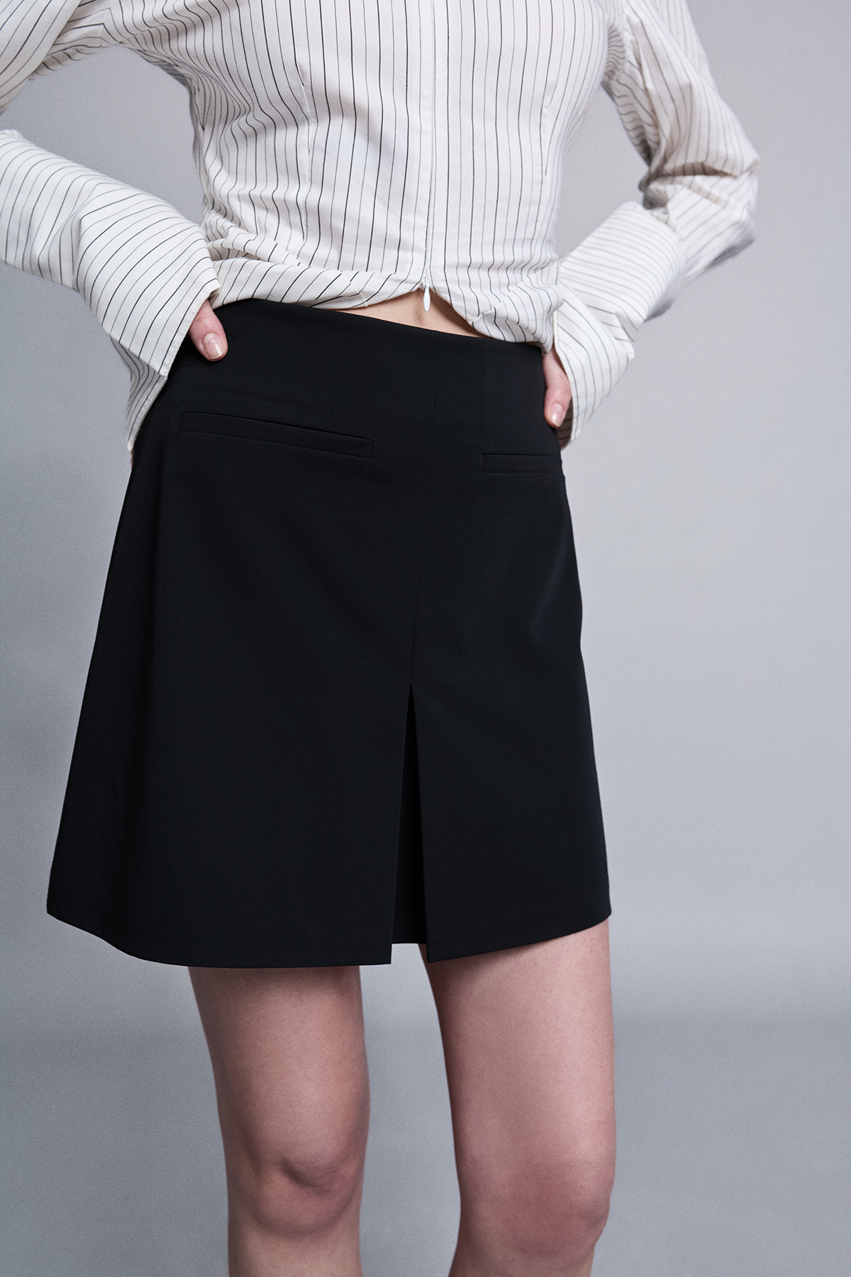 Mini boy, astarsız, önden pilikaşeli, gizli fermuar kapamalı, dokuma kumaş mini etek.