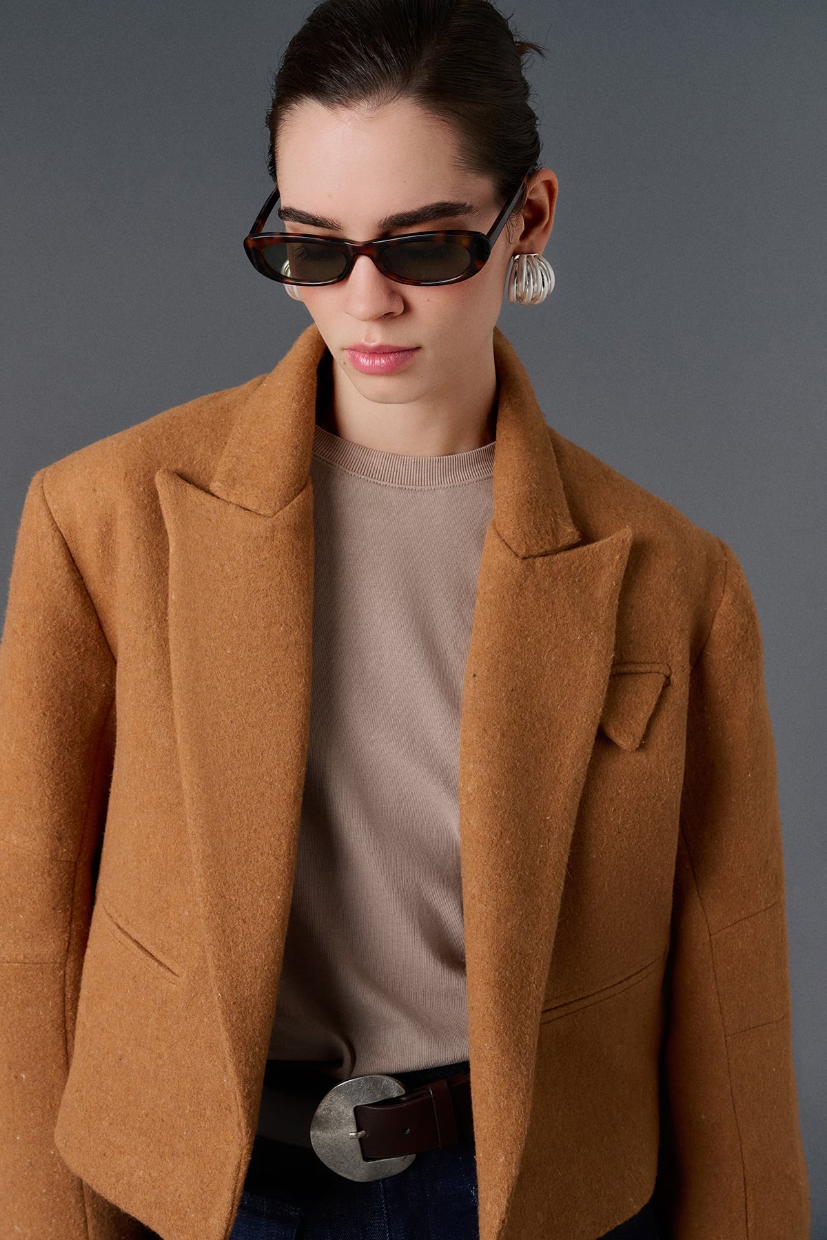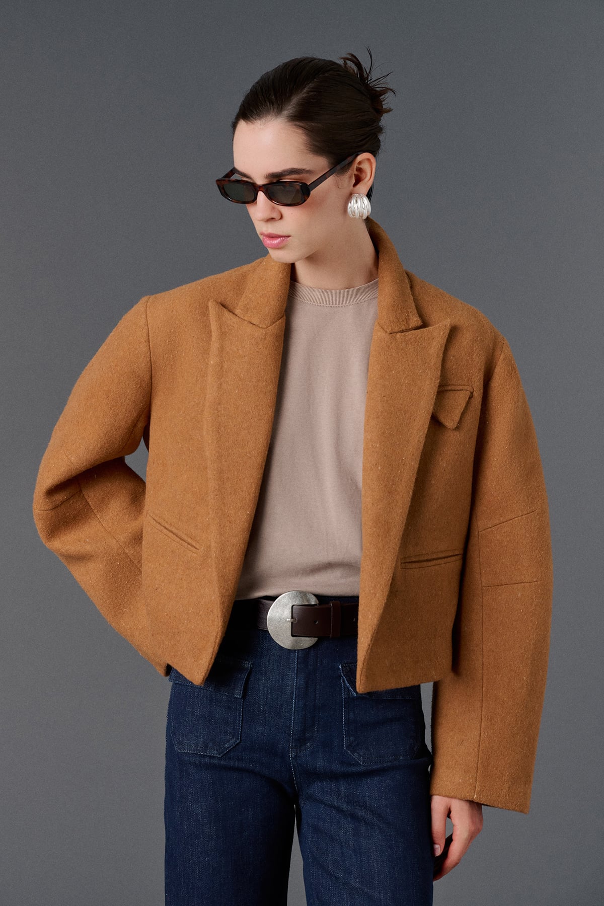 Vatkalı, kruvaze yaka, astarlı, cep aksesuar görünümlü (cepler aktif değildir.), geniş kol detaylı, düğmesiz, arkası lastikli, kaşe crop ceket.
