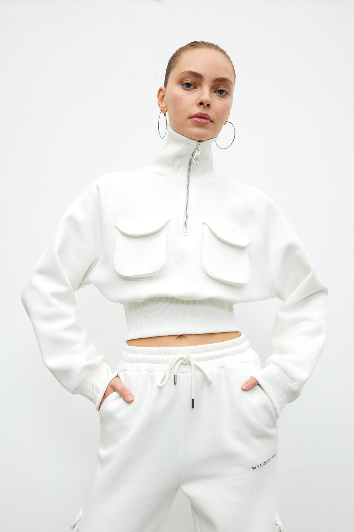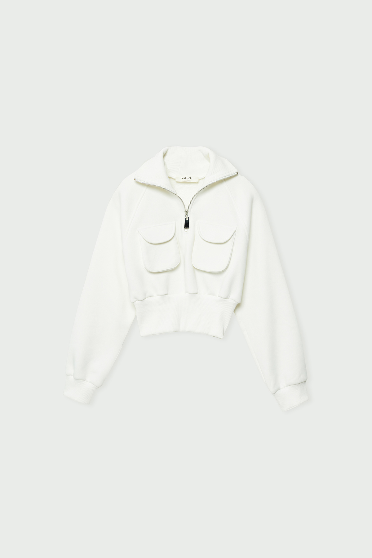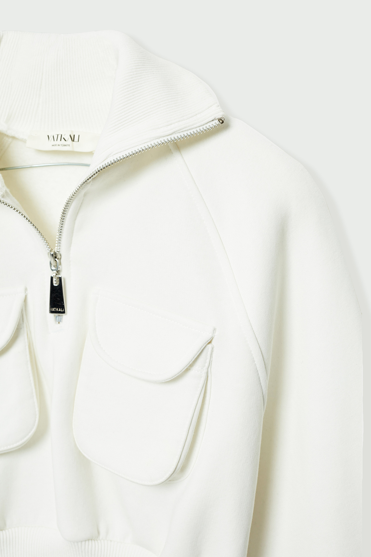 Balıkçı yaka,fermuarlı,yama cep detaylı,beli elastik bantlı, crop sweatshirt.