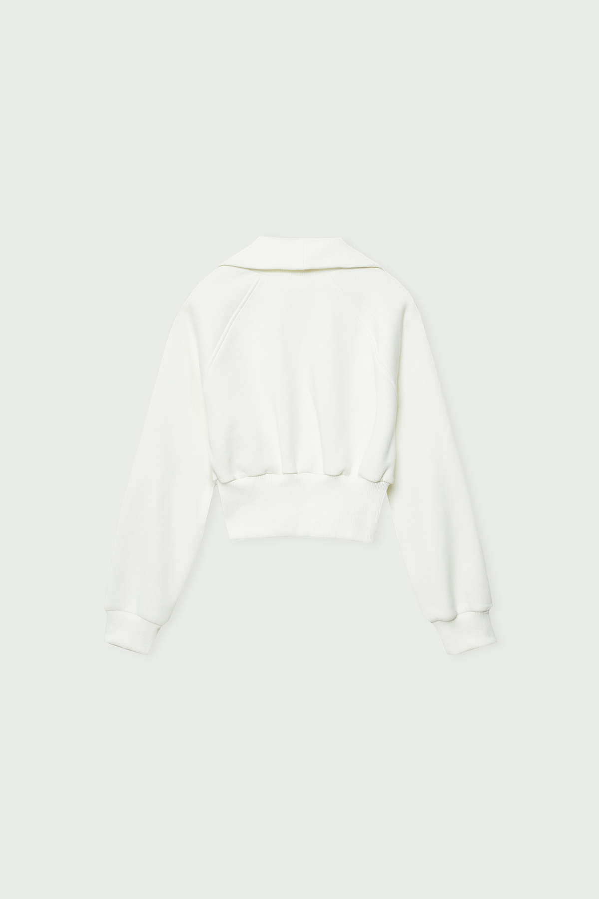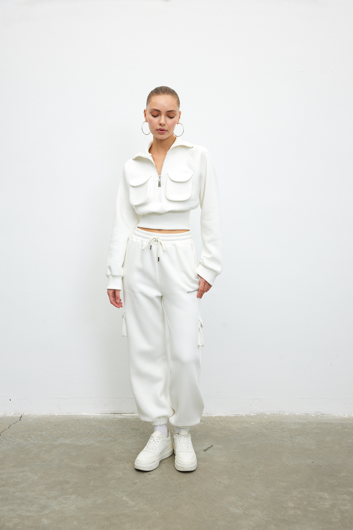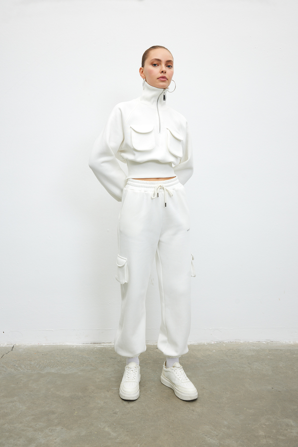 Balıkçı yaka,fermuarlı,yama cep detaylı,beli elastik bantlı, crop sweatshirt.