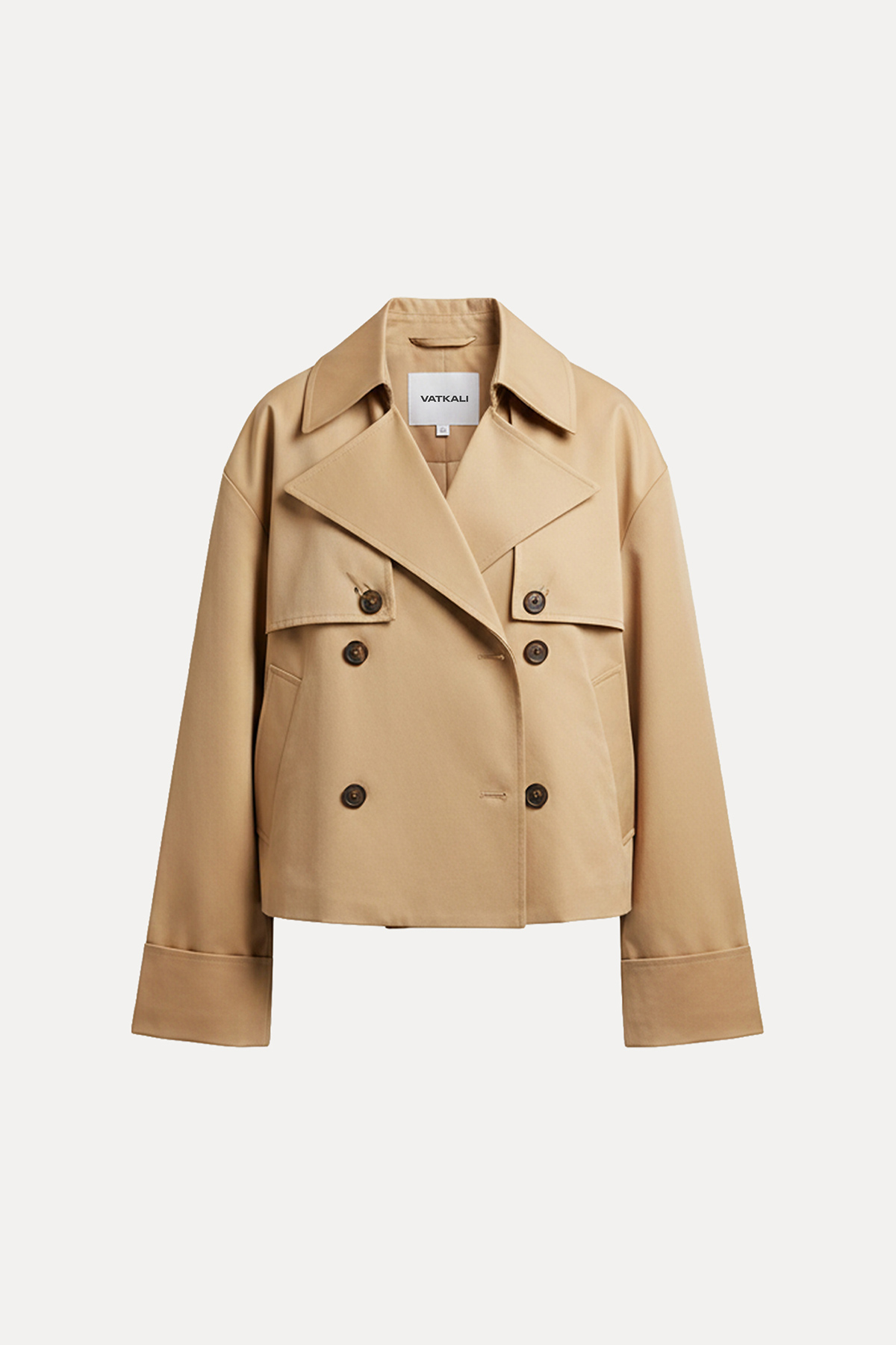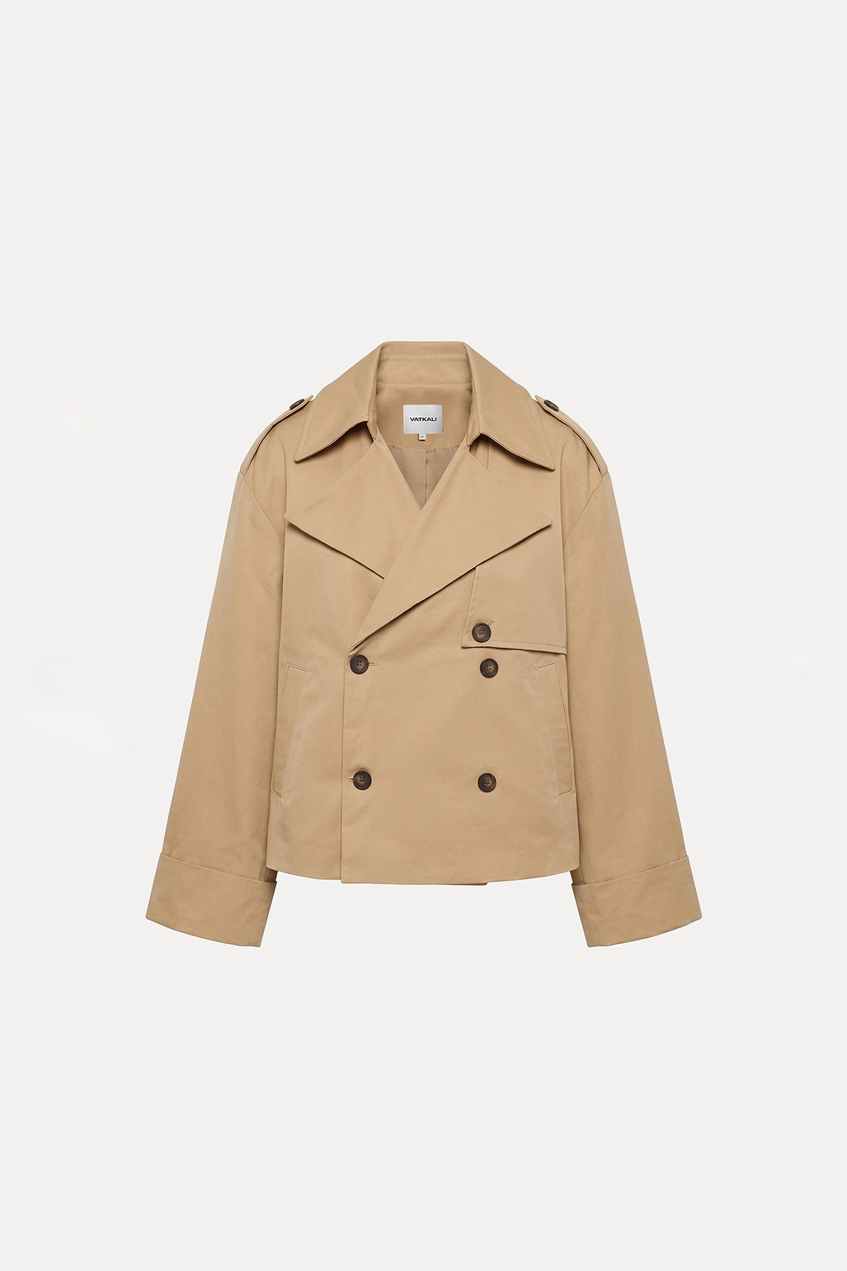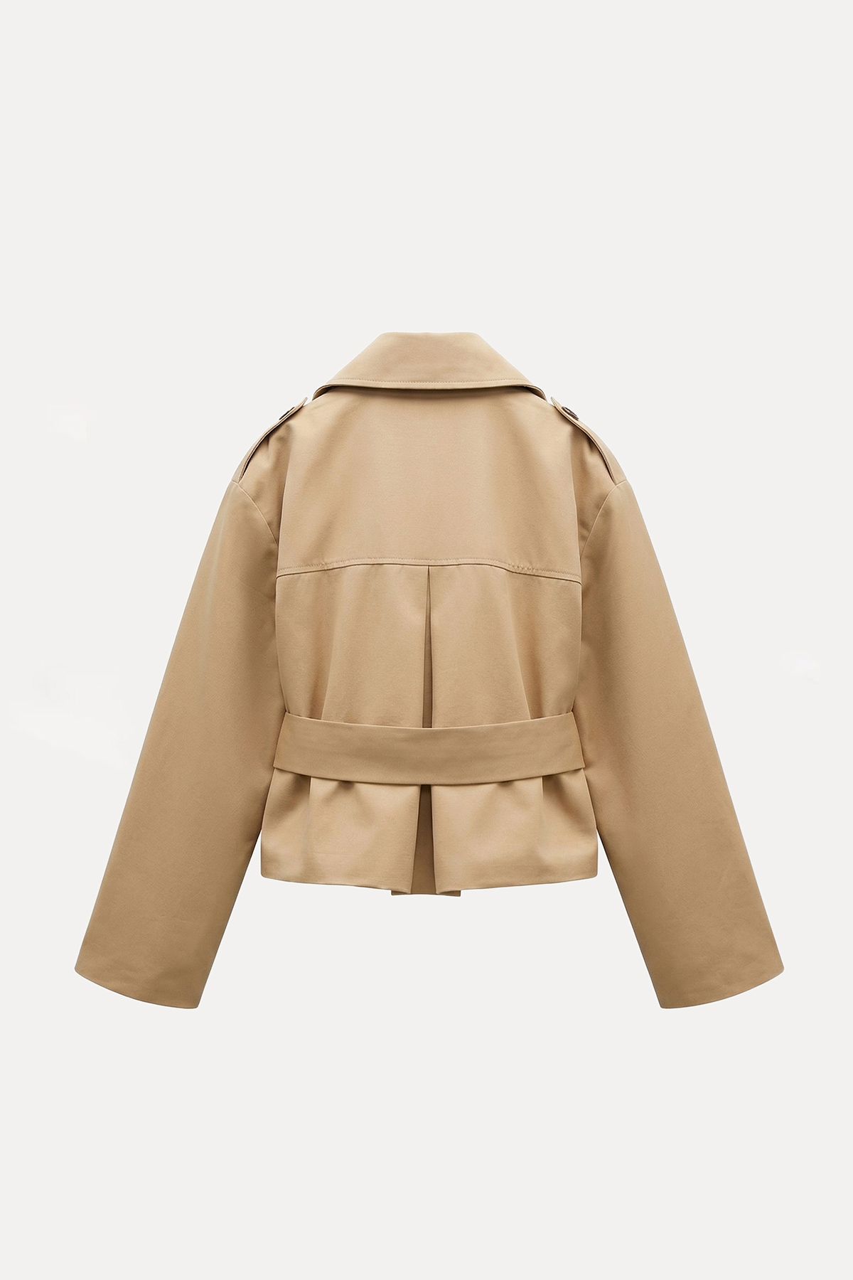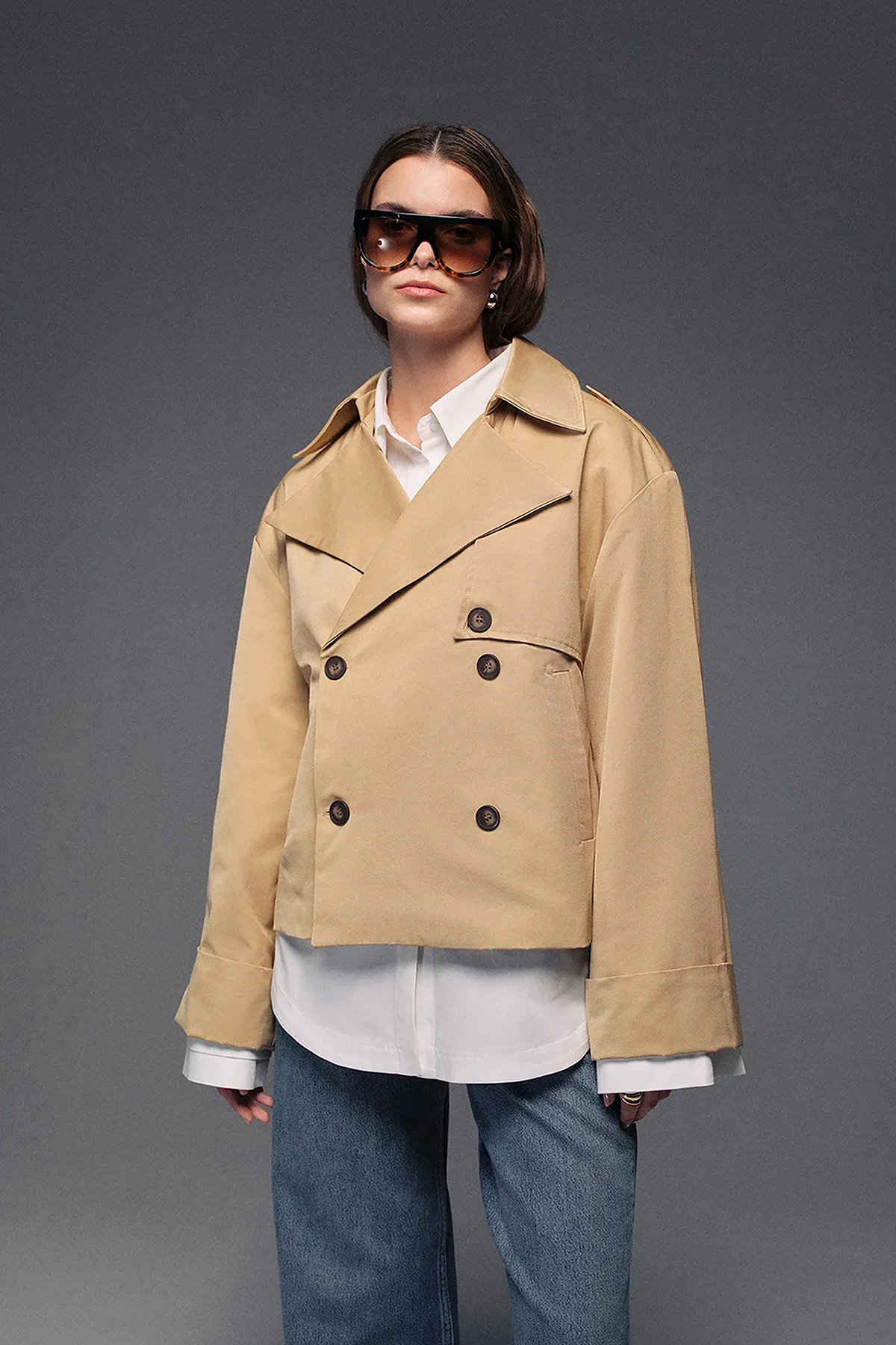 Kruvaze yaka, düğme kapamalı,cepli,astarlı, oversize kalıp, kısa trençkot