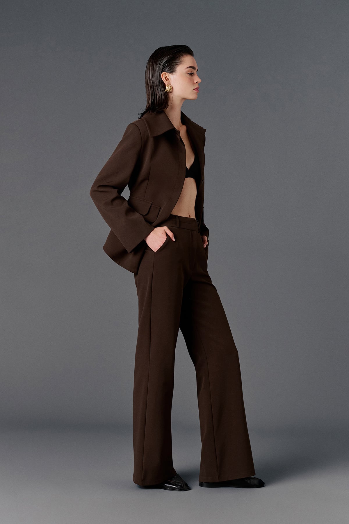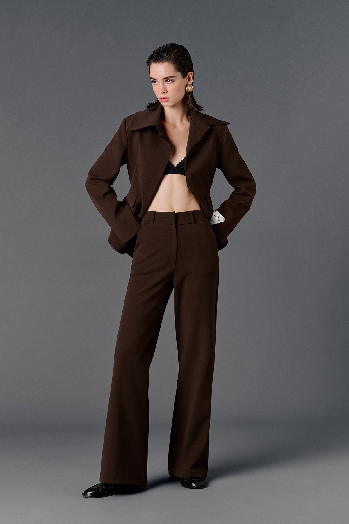 Yüksek bel, çift kemer detaylı, yanlardan 2 cepli, önden düğme, fermuar ve klips kapamalı, arkası aksesuar cep görünümlü palazzo pantolon.