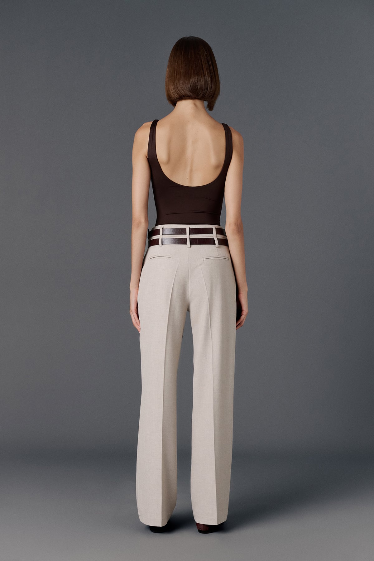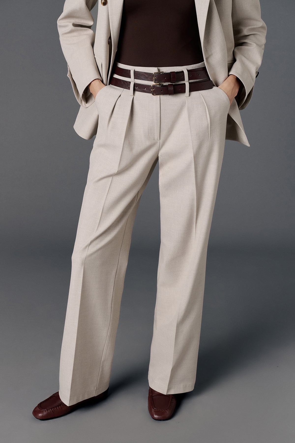 Yüksek bel, çift kemer detaylı, astarsız, cepli, palazzo pantolon.