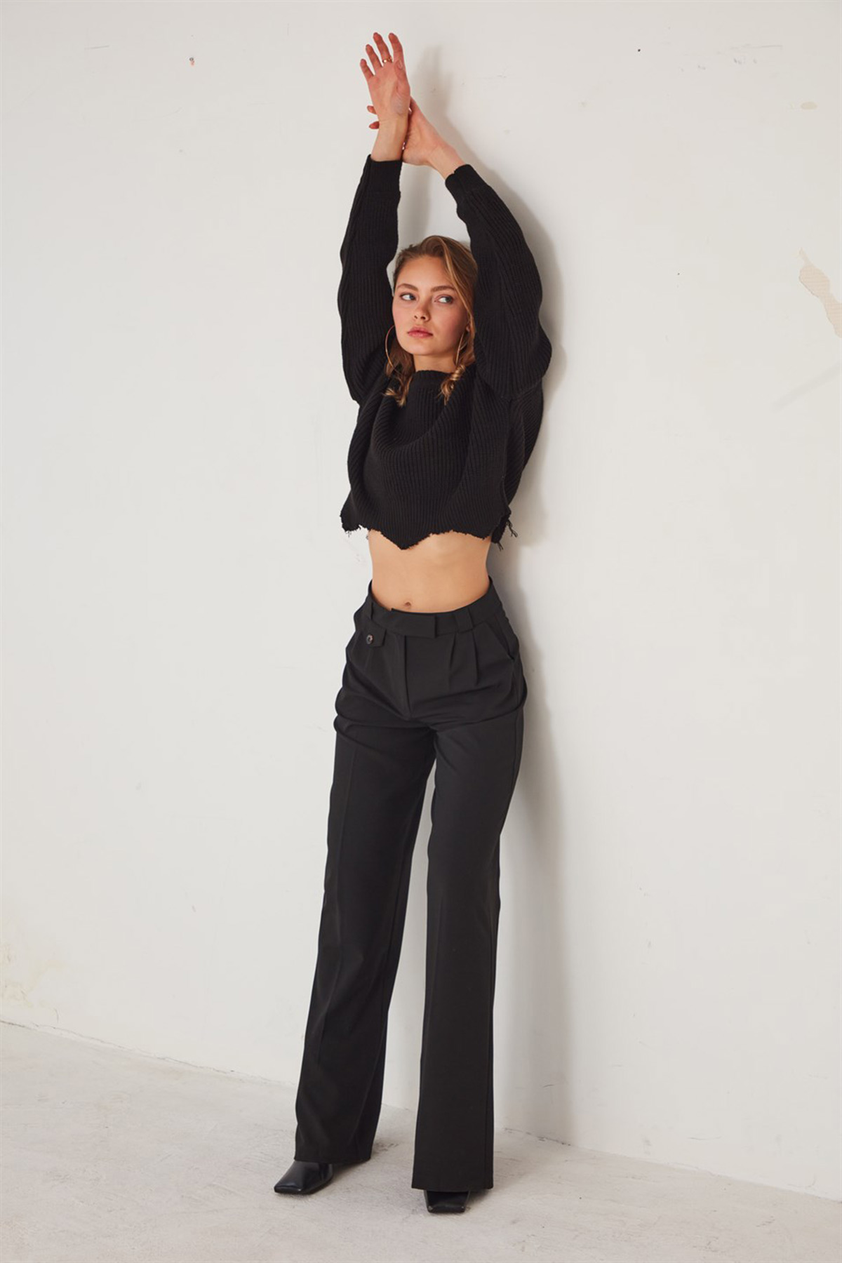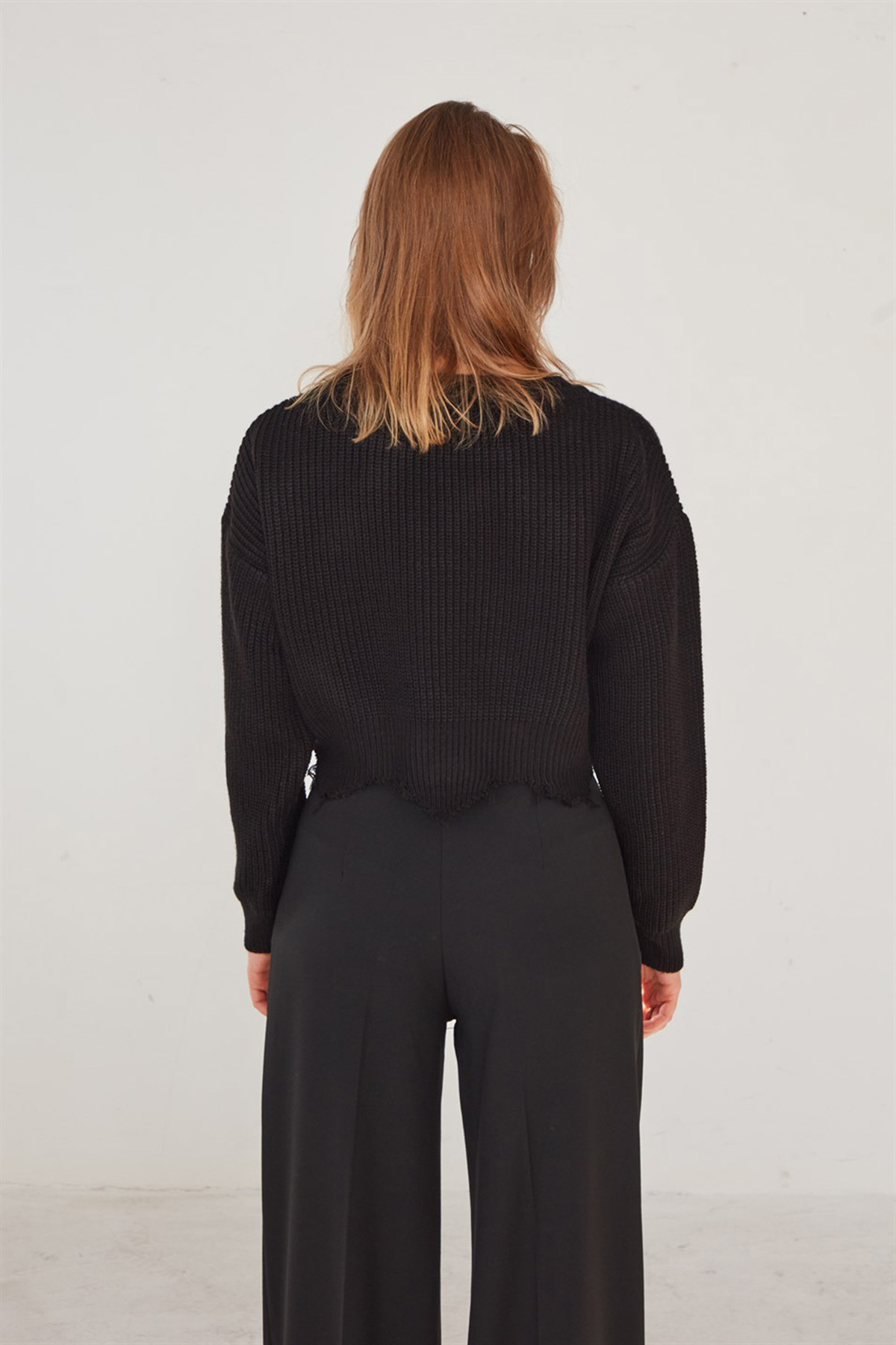 Bisiklet yaka, örgü detaylı, uzun kollu, kadın crop kazak.