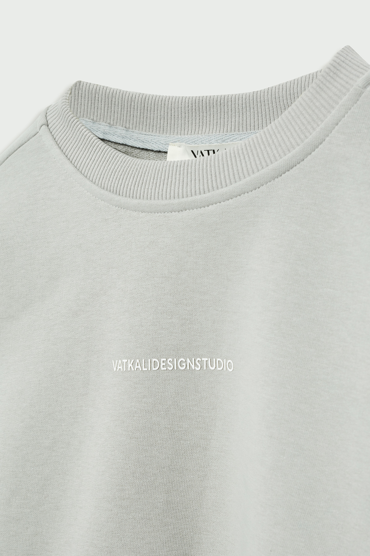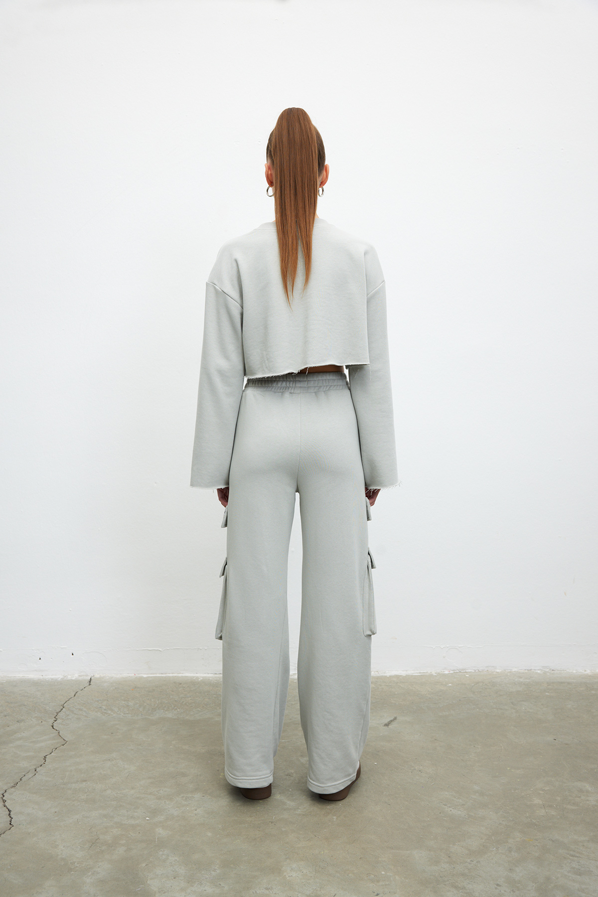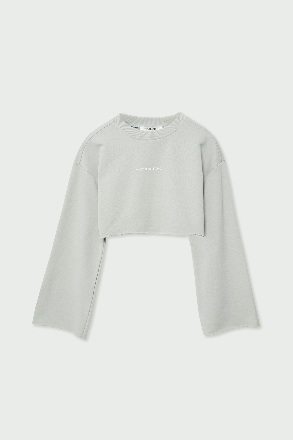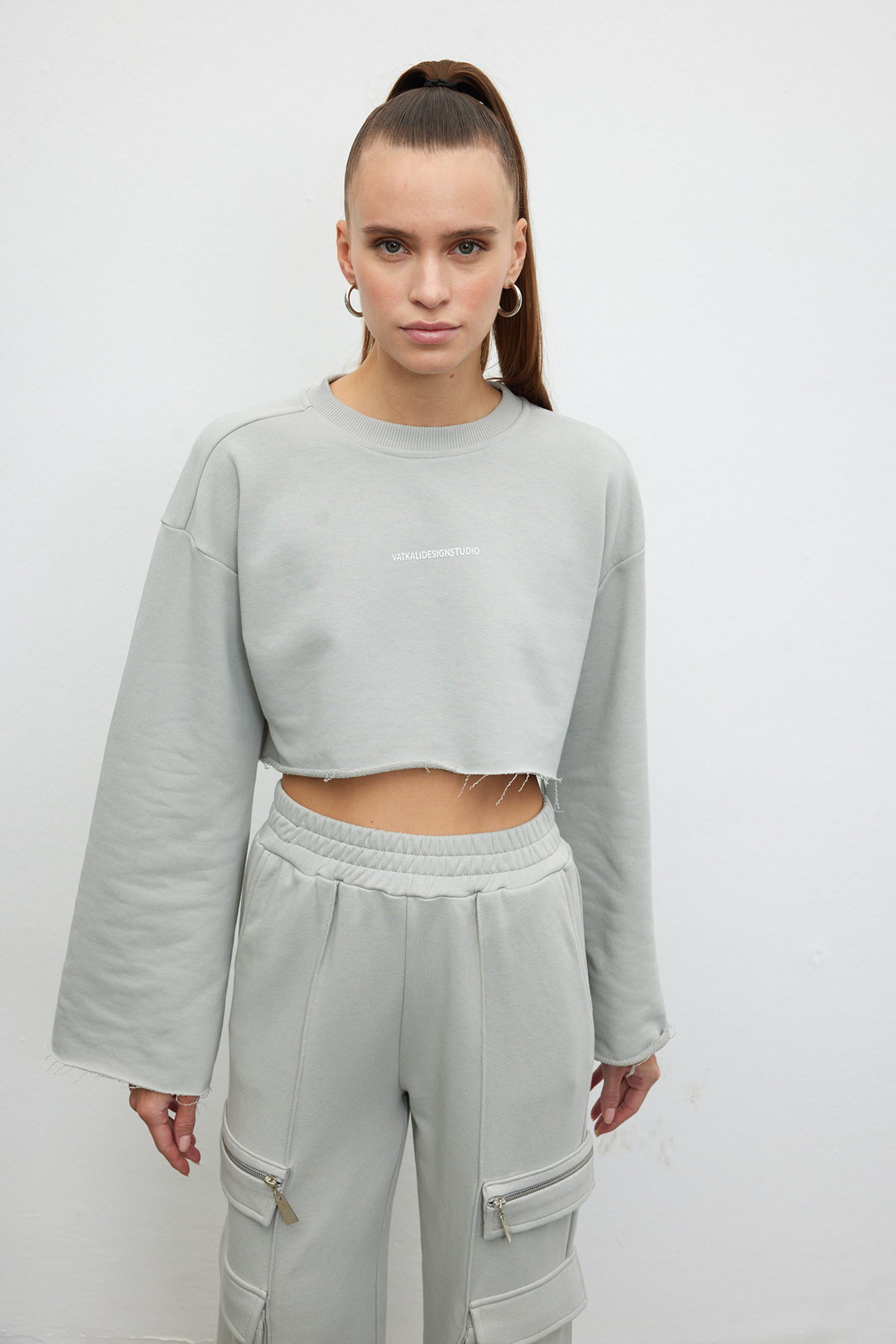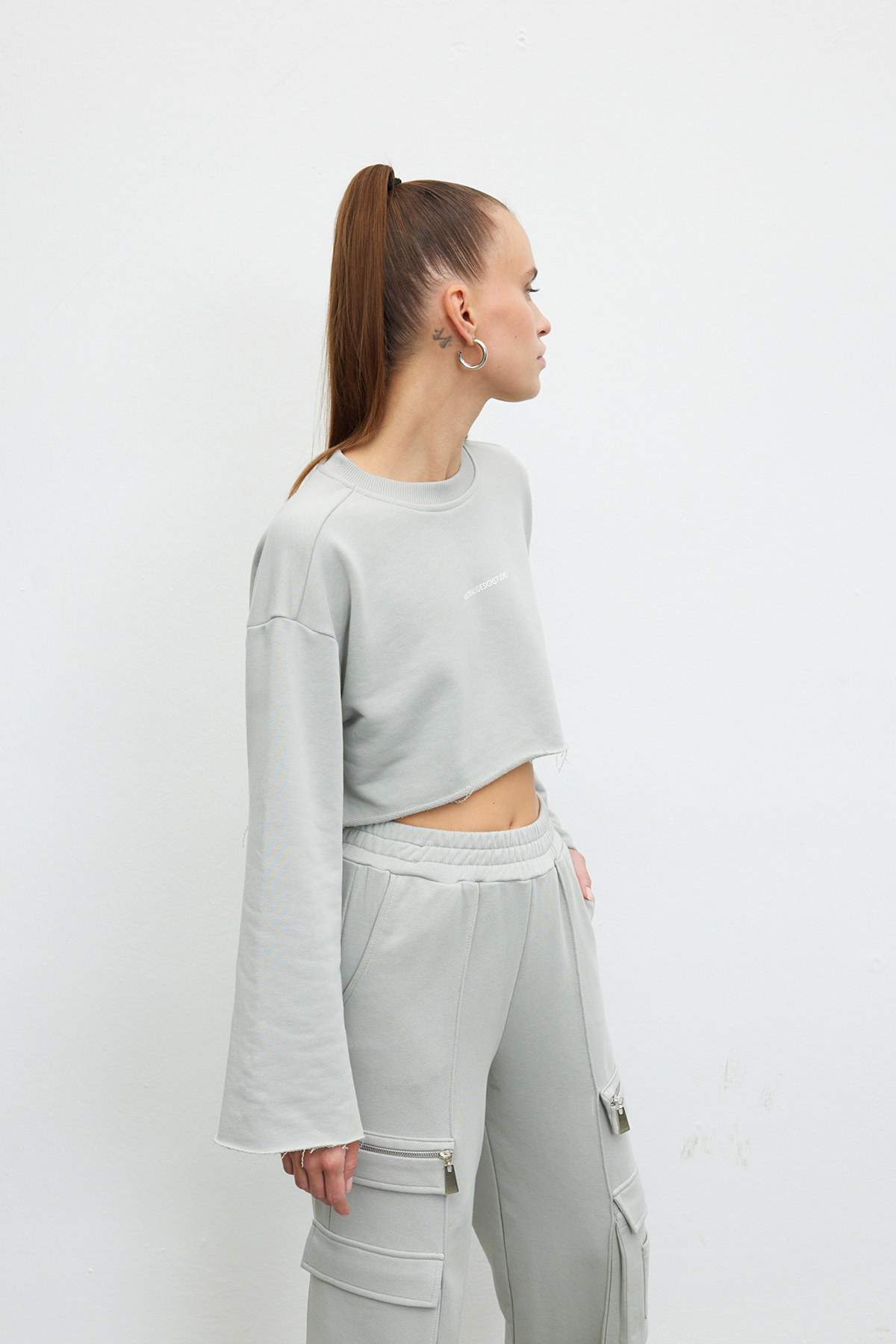 Pamuklu, bisiklet yaka ve uzun kollu, slogan baskılı crop sweatshirt.