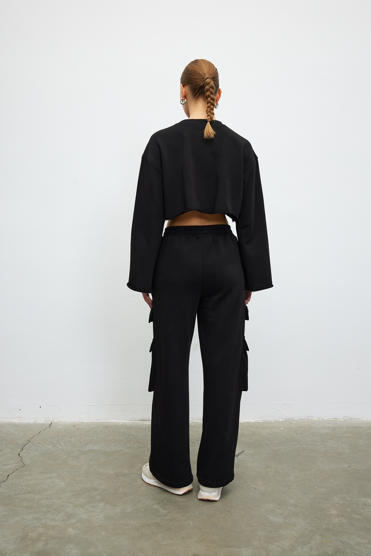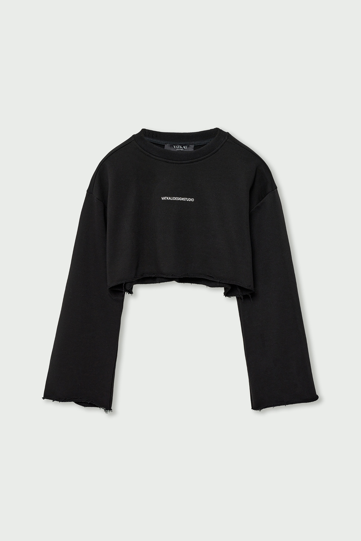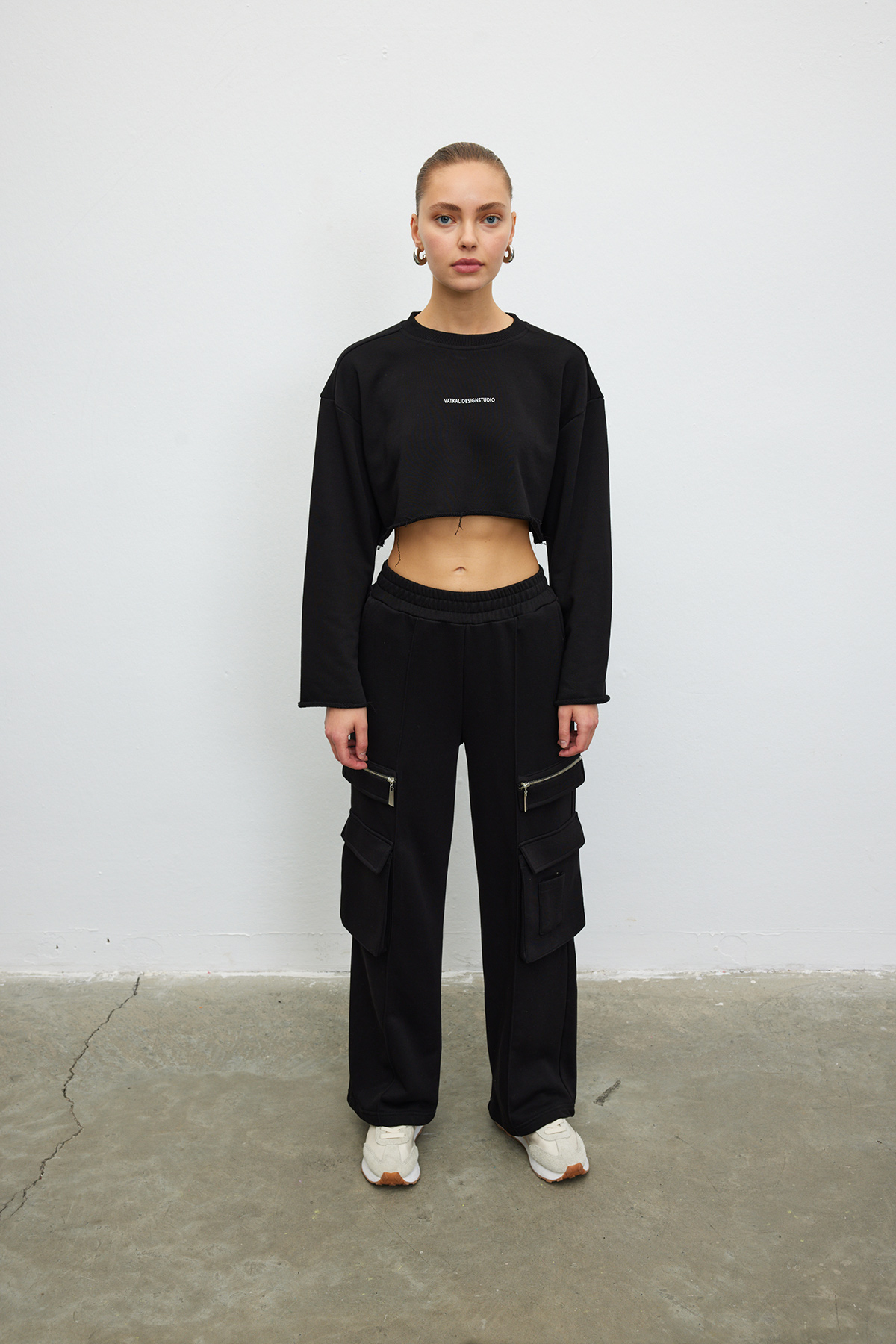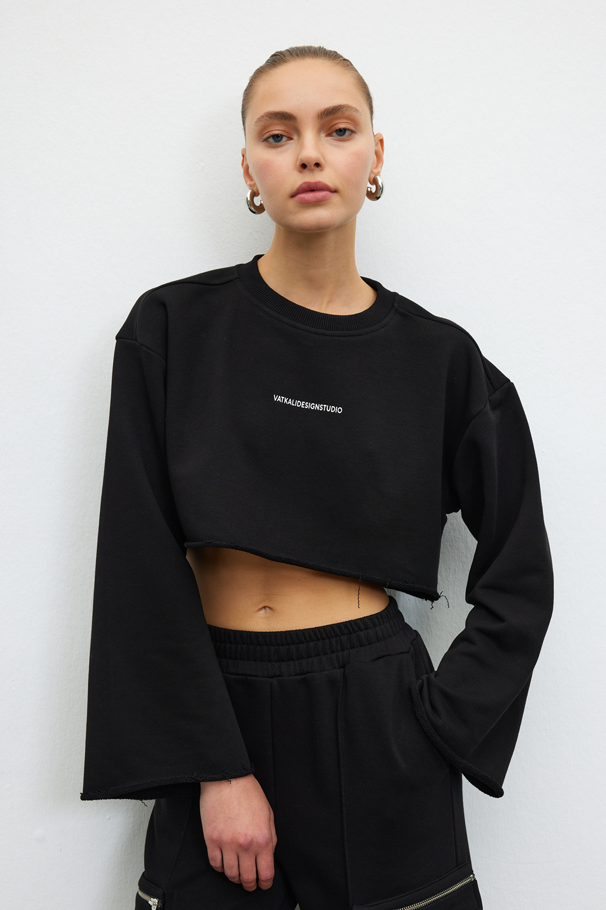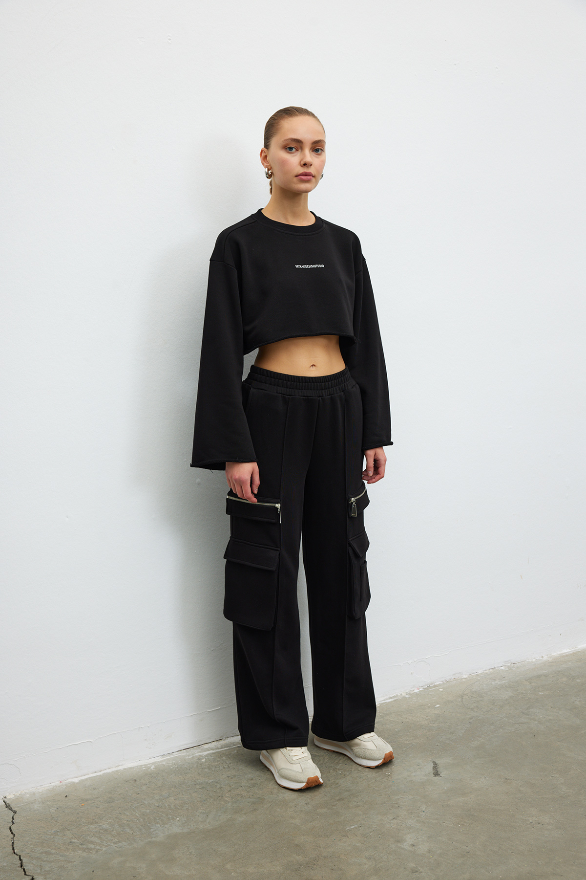 Pamuklu, bisiklet yaka ve uzun kollu, slogan baskılı crop sweatshirt.