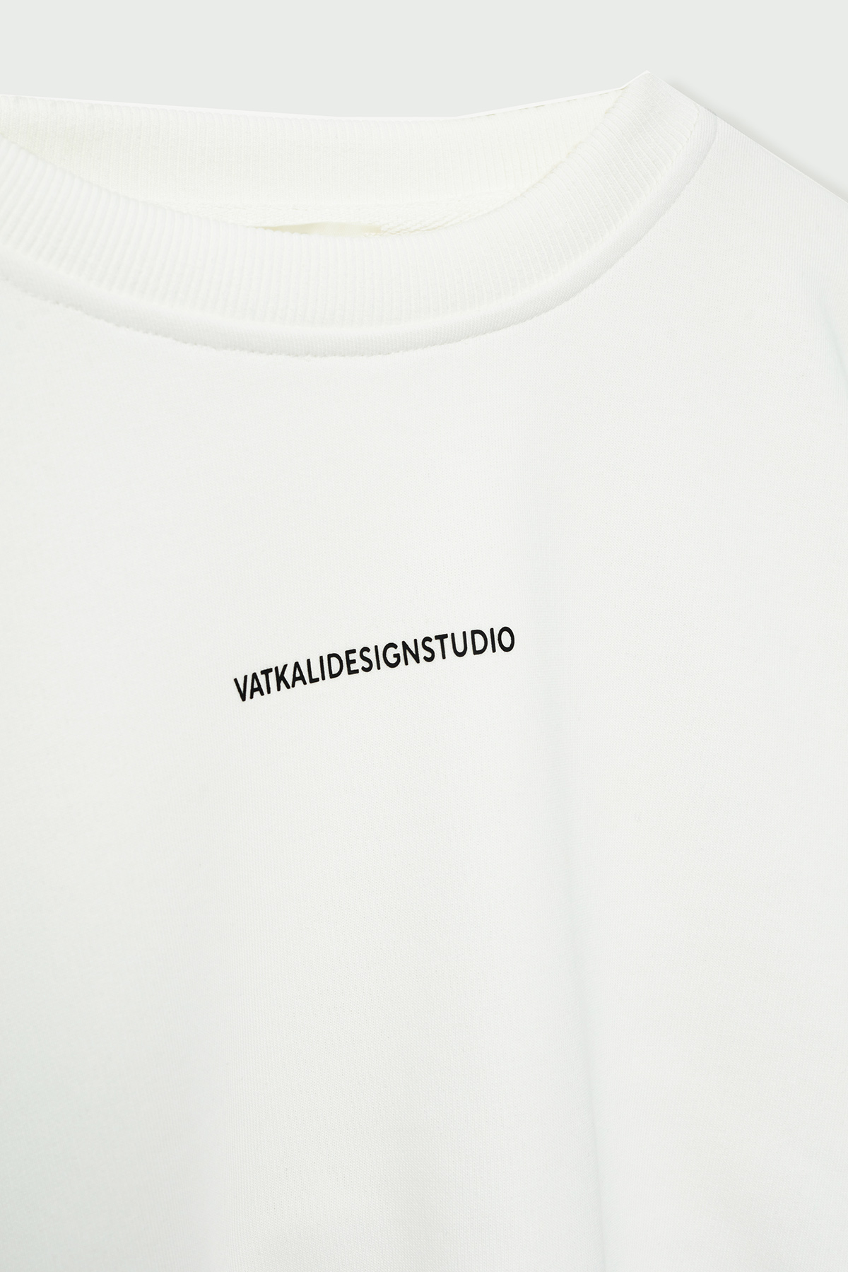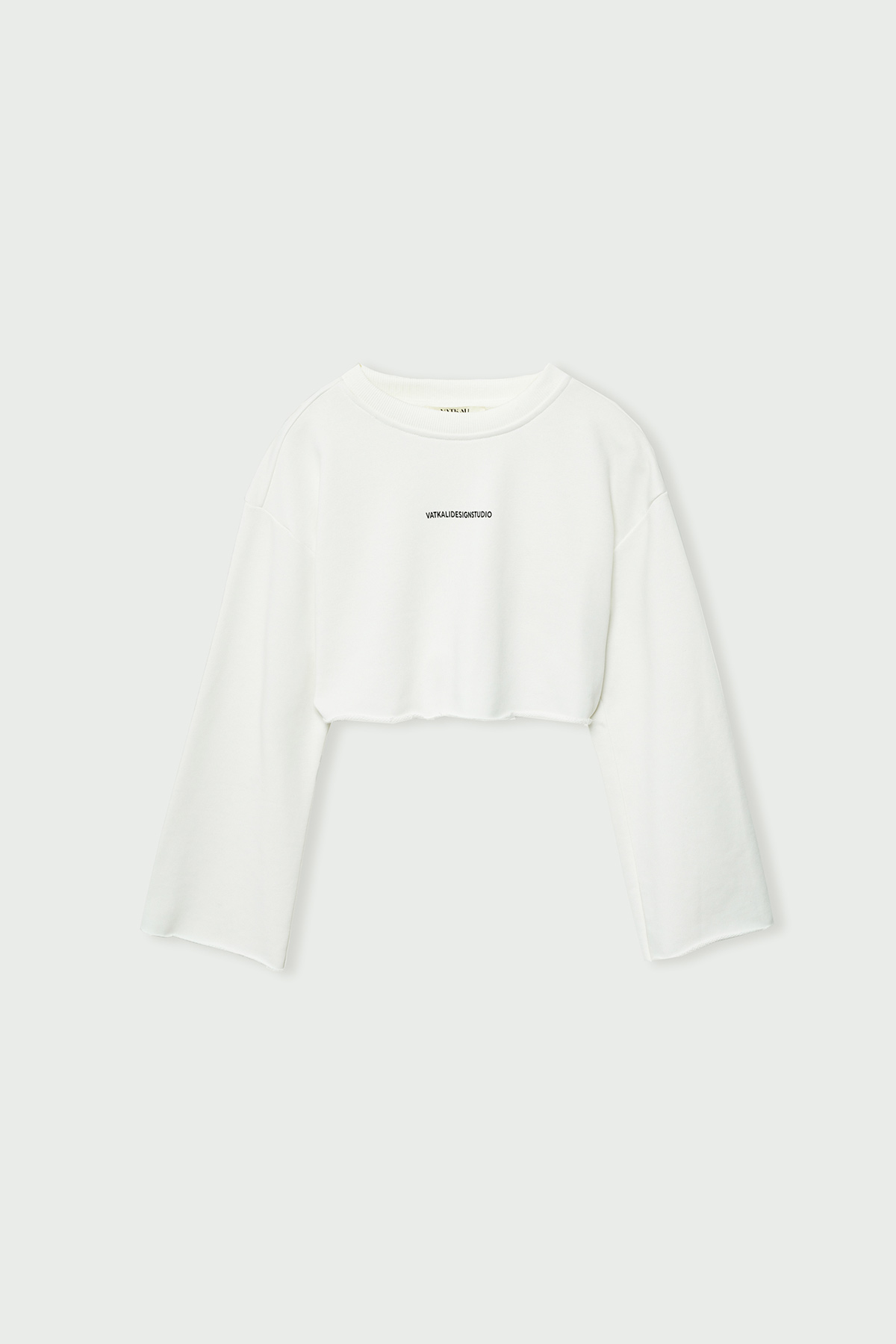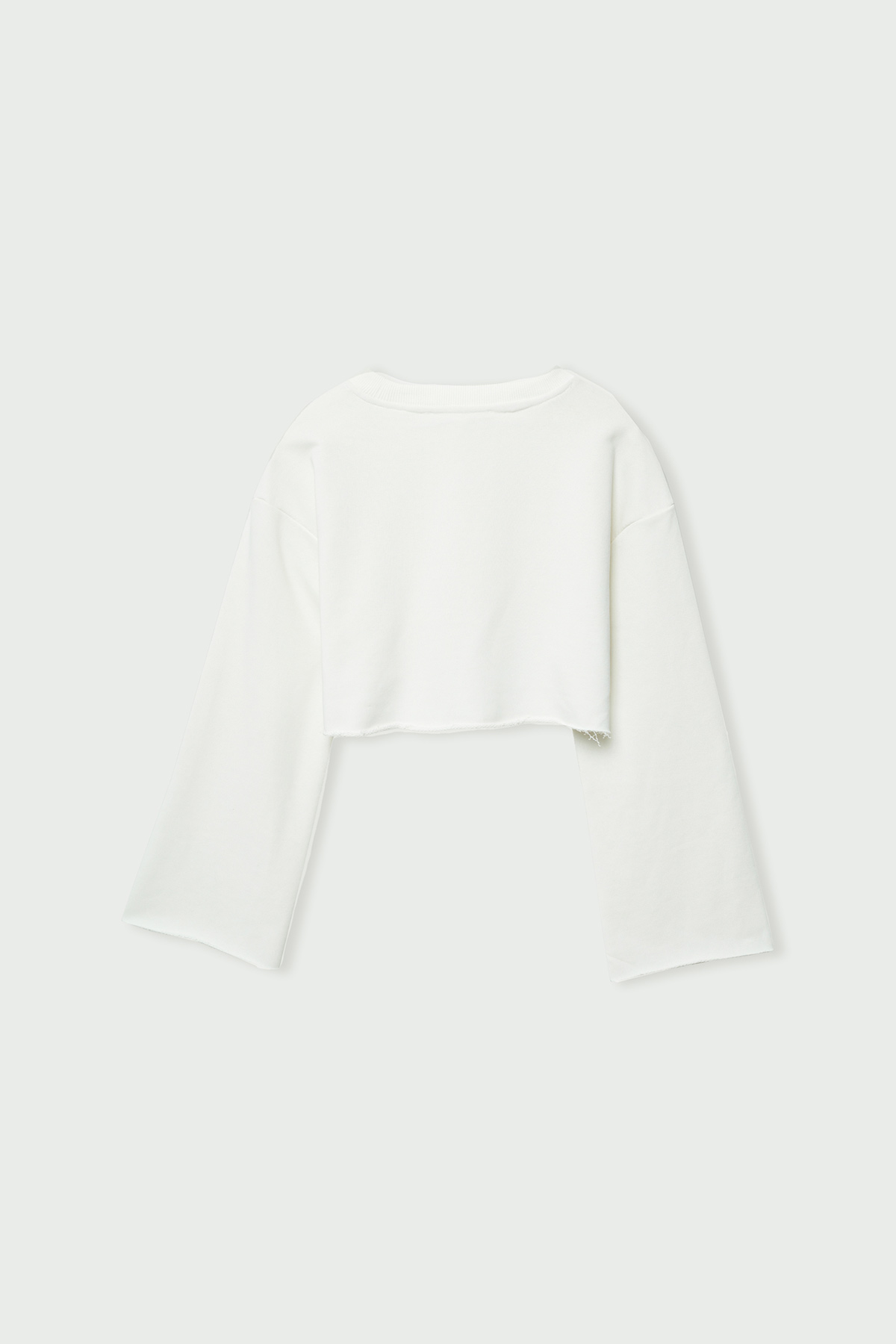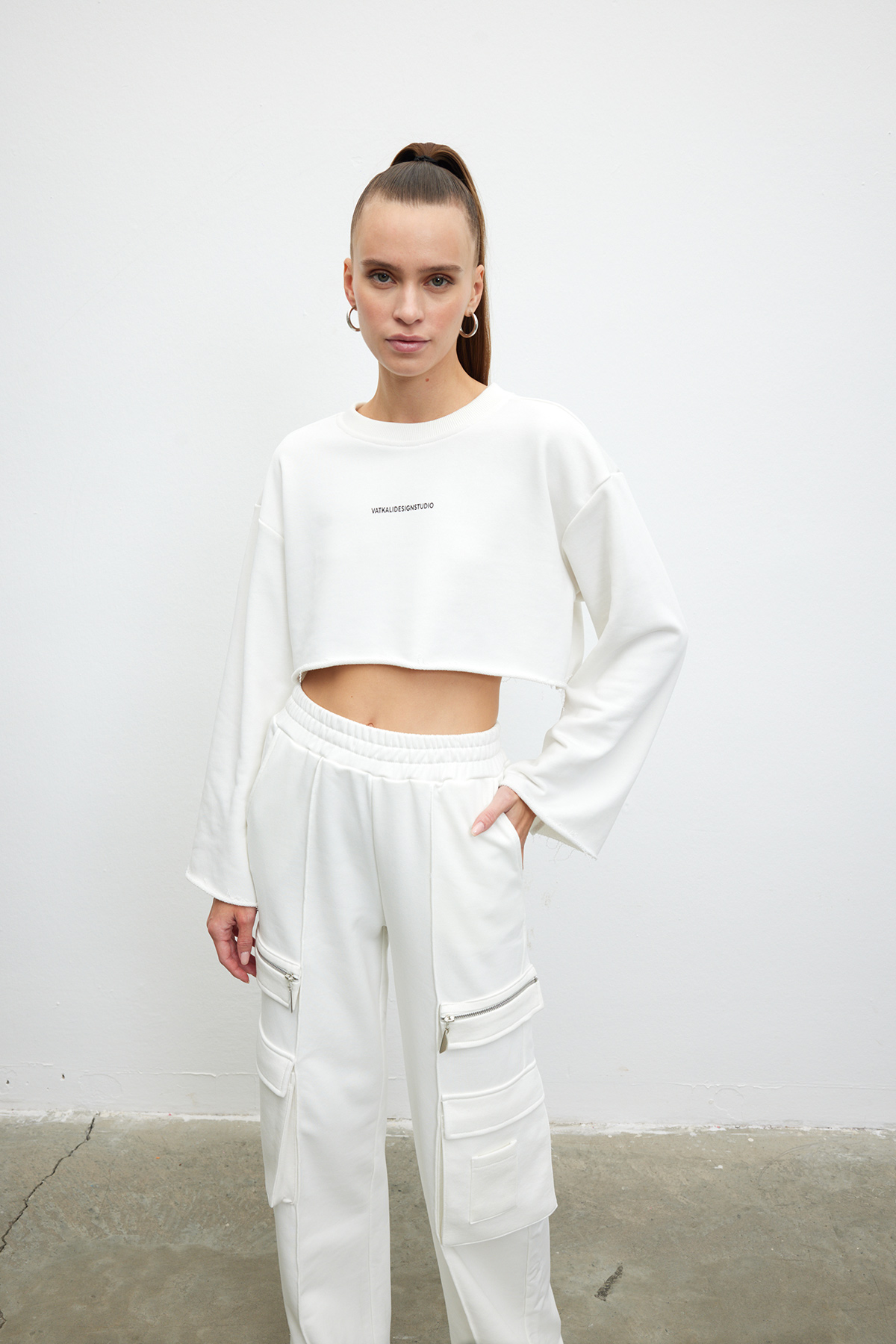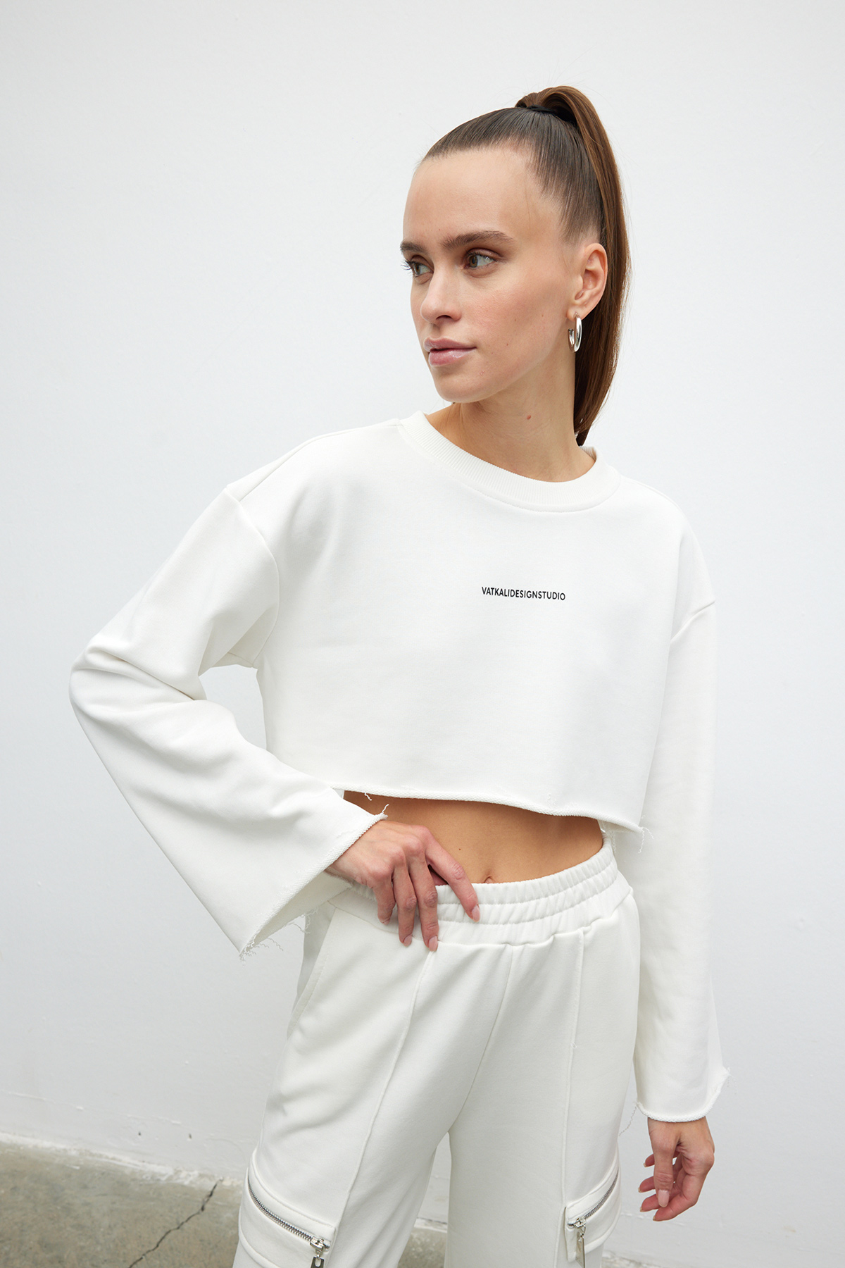 Pamuklu, bisiklet yaka ve uzun kollu, slogan baskılı crop sweatshirt.