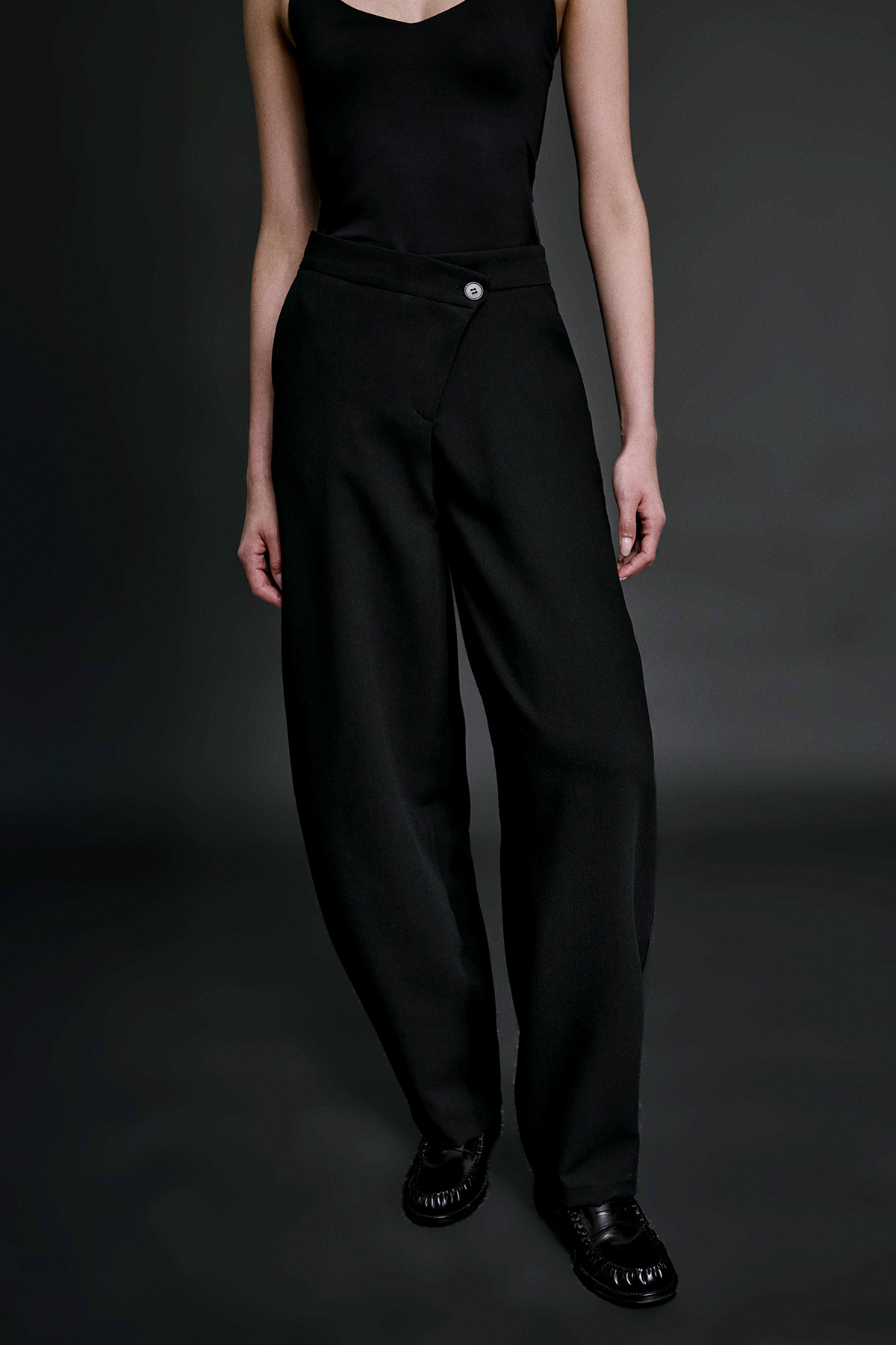 Çapraz kapama detaylı, yüksel bel, çift cepli, düğme ve fermuar kapamalı barrel kesim pantolon.
