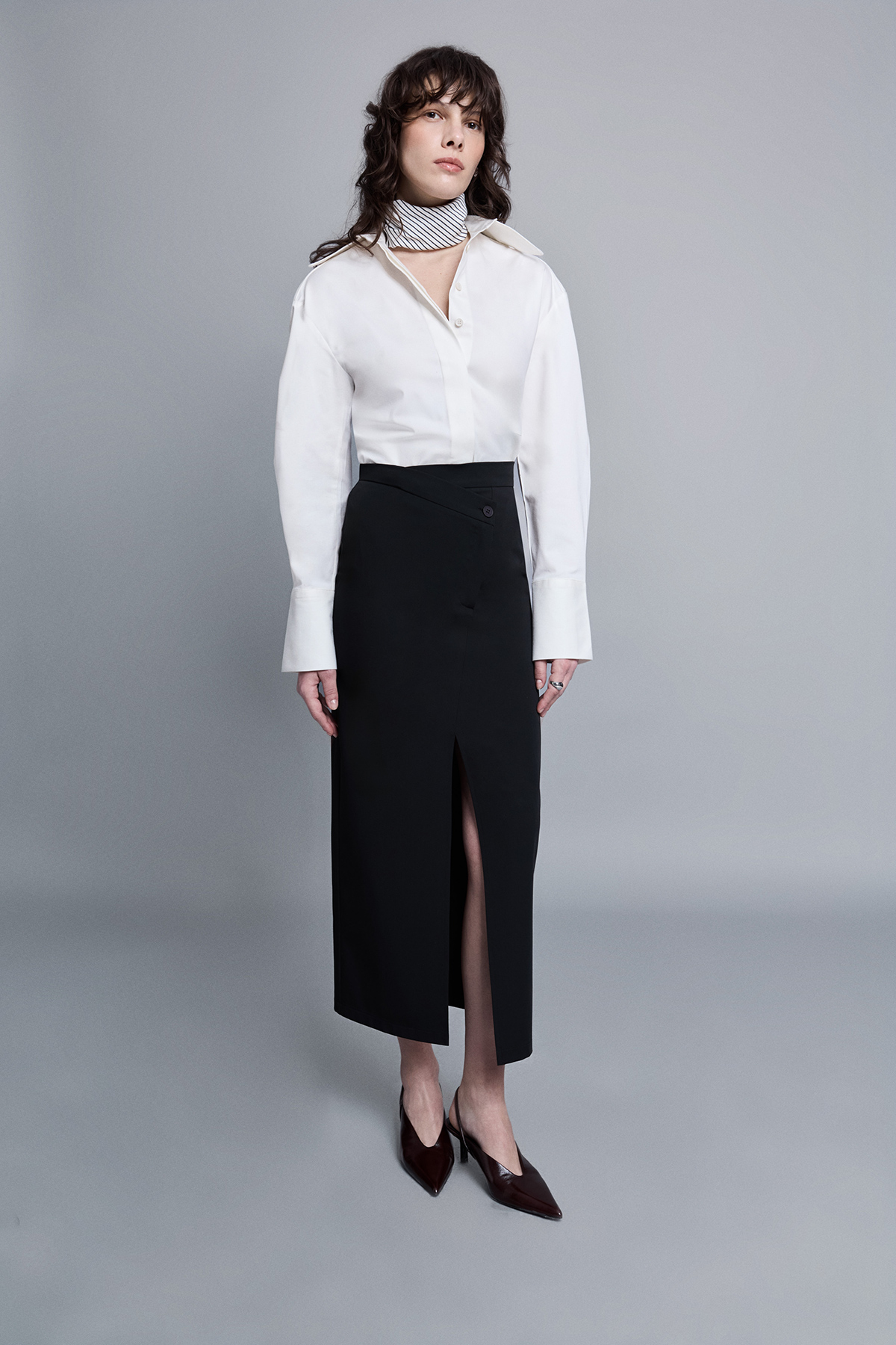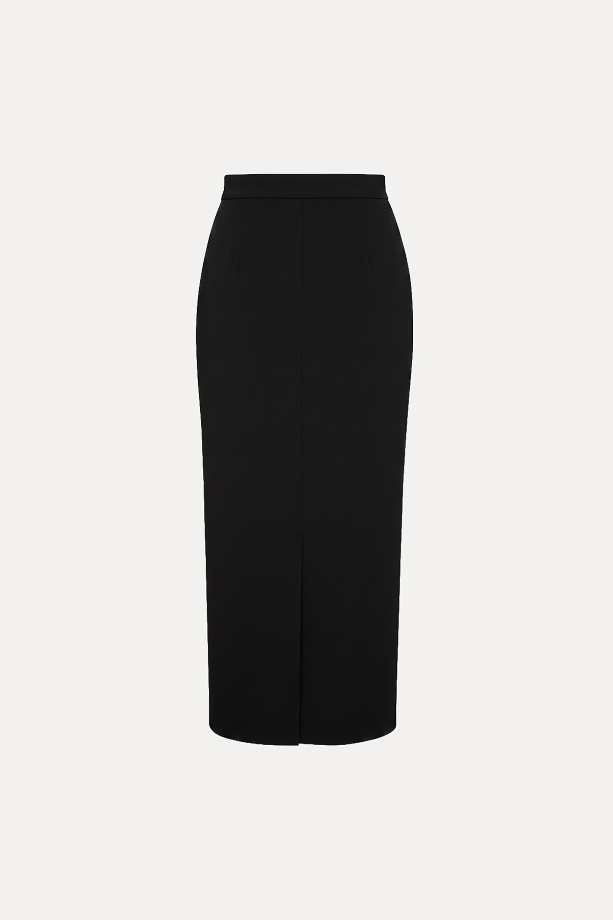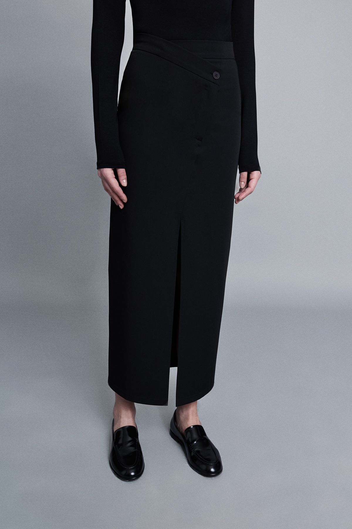 Midi boy, astarsız, çapraz düğme ve fermuar kapamalı, önden yırtmaçlı, dokuma kumaş etek.