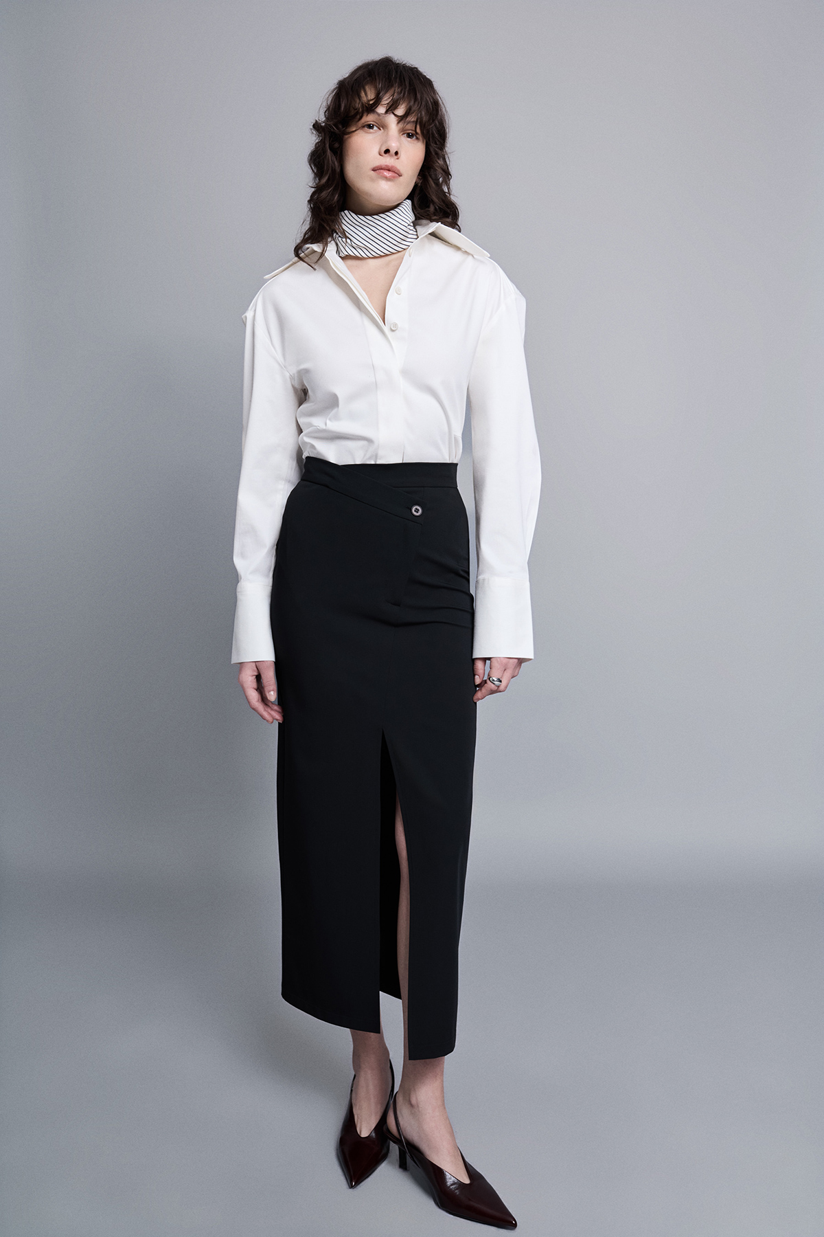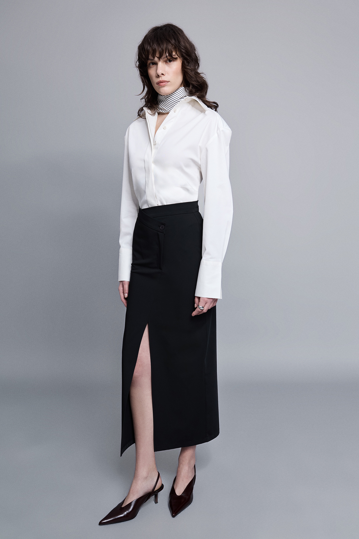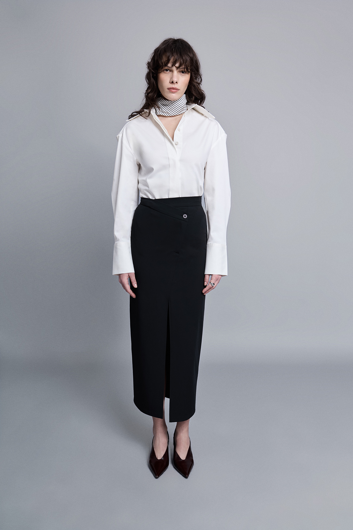 Midi boy, astarsız, çapraz düğme ve fermuar kapamalı, önden yırtmaçlı, dokuma kumaş etek.