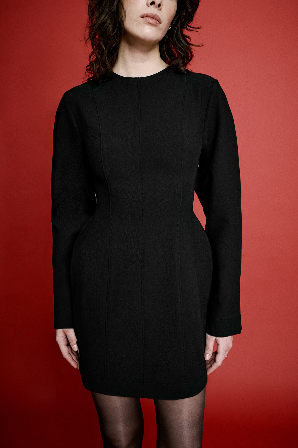 Curved Mini Elbise, bele oturan curved kesimiyle silueti zarifçe şekillendirirken modern ve feminen bir görünüm sunar. Bisiklet yaka detayı sade ve dengeli bir duruş sağlarken, uzun kollu tasarımı mini boyla kontrast yaratarak güçlü bir stil oluşturur.