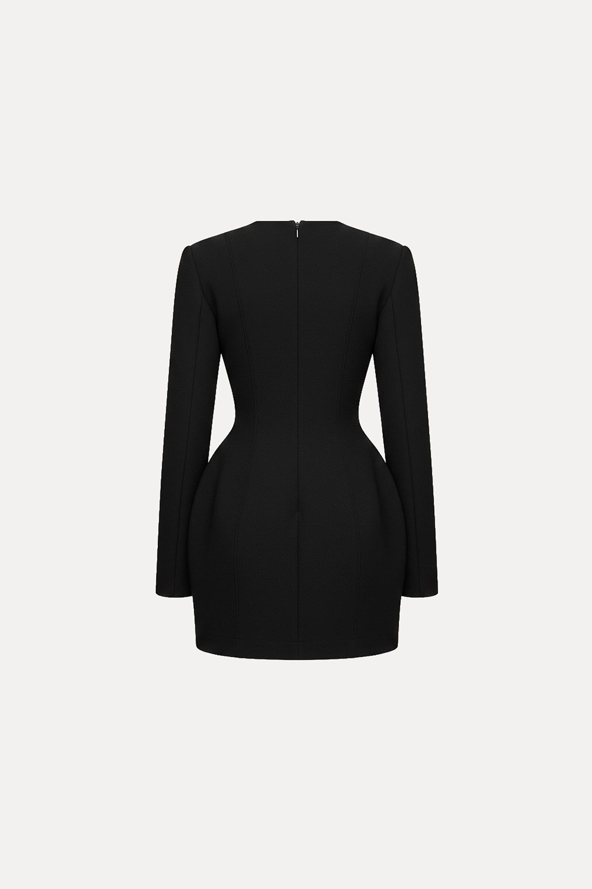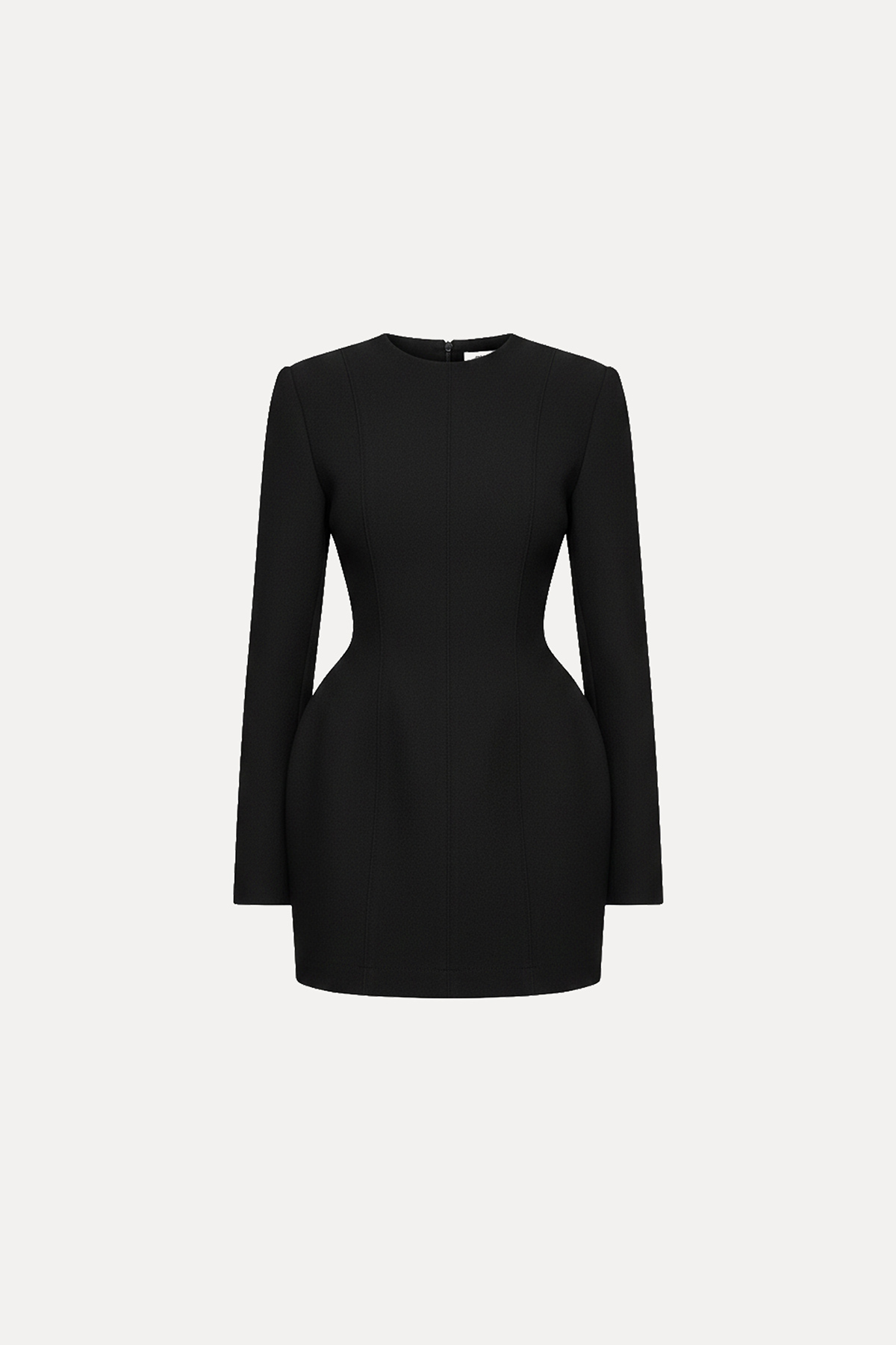 Bisiklet yaka, vatkalı, astarsız, arkadan gizli fermuar kapamalı, uzun kollu, bele oturan mini elbise.
