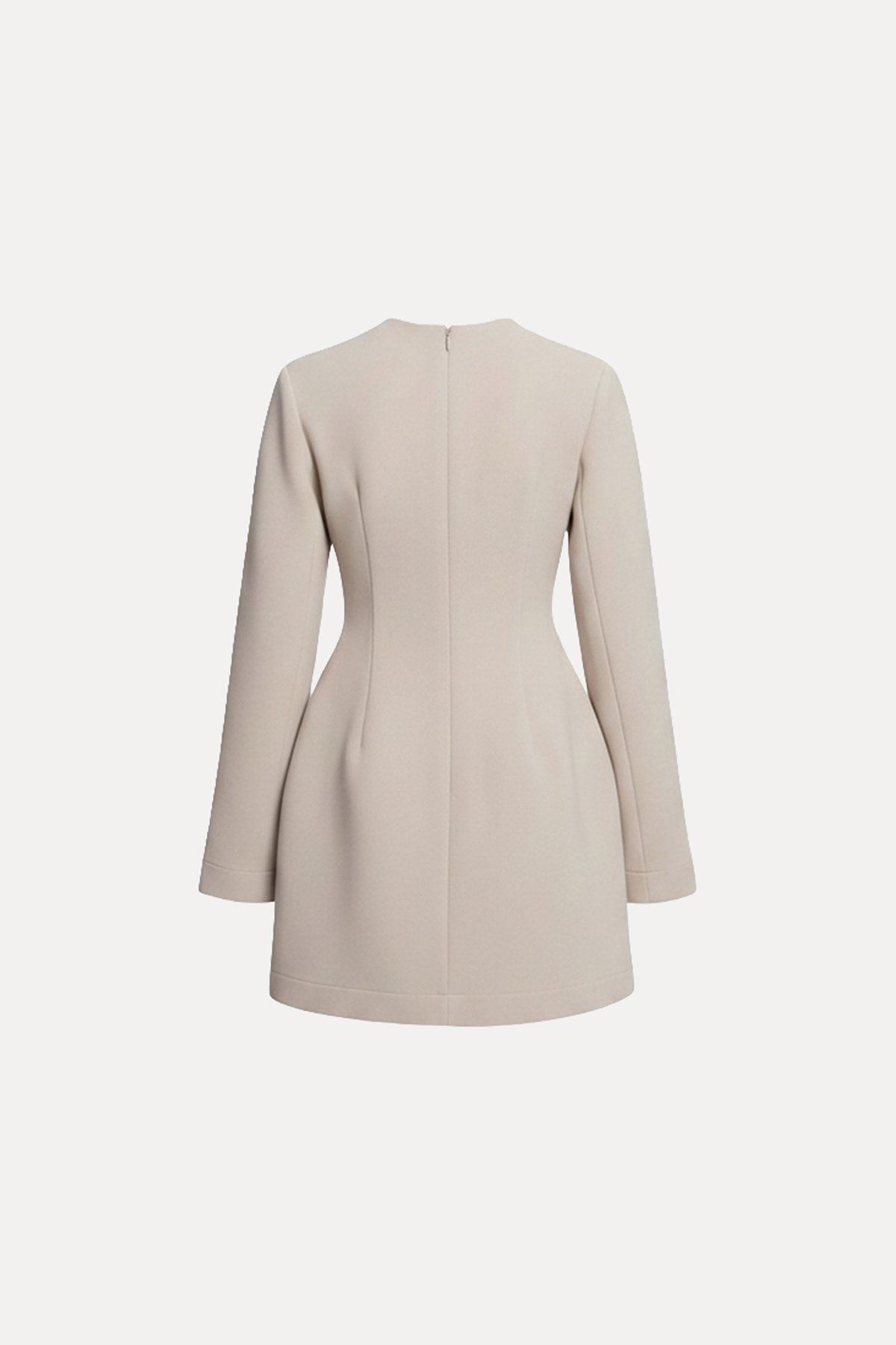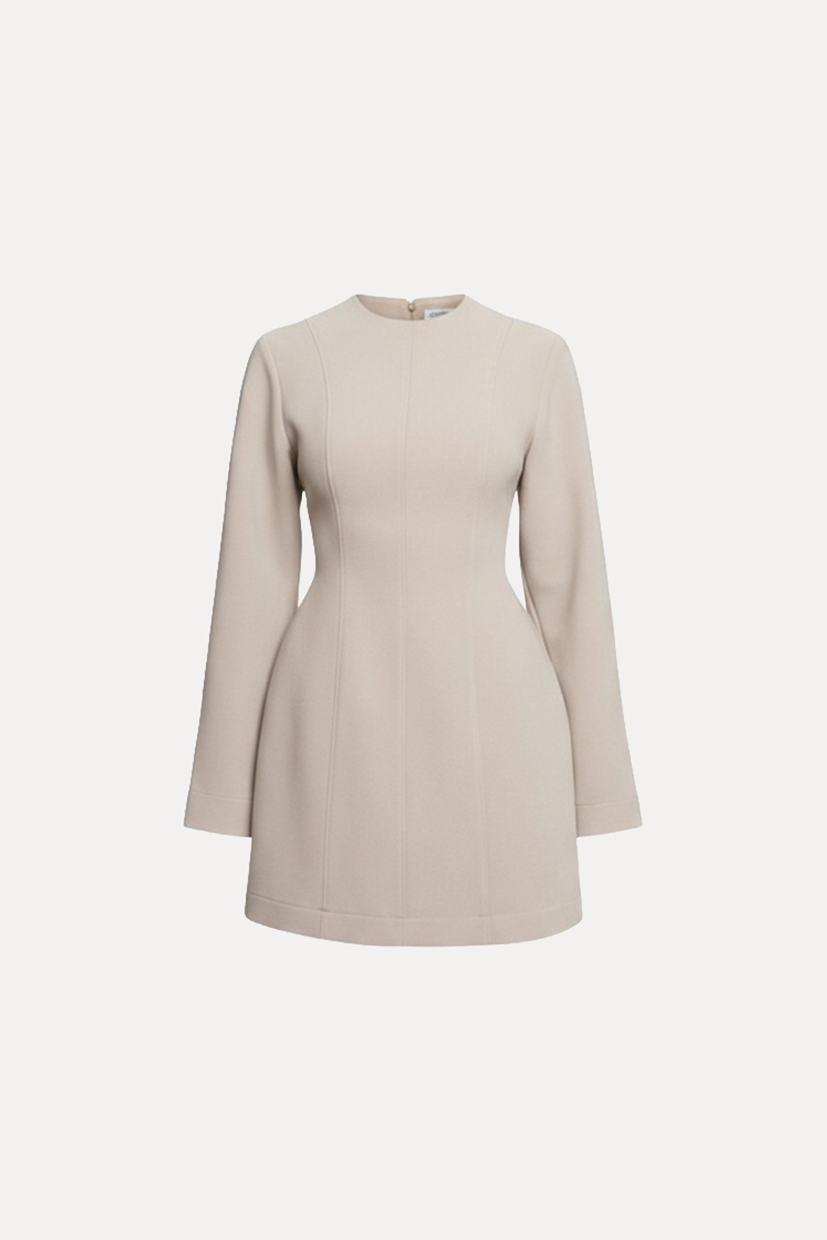 Bisiklet yaka, astarsız, arkadan gizli fermuar kapamalı, uzun kollu, bele oturan mini elbise.