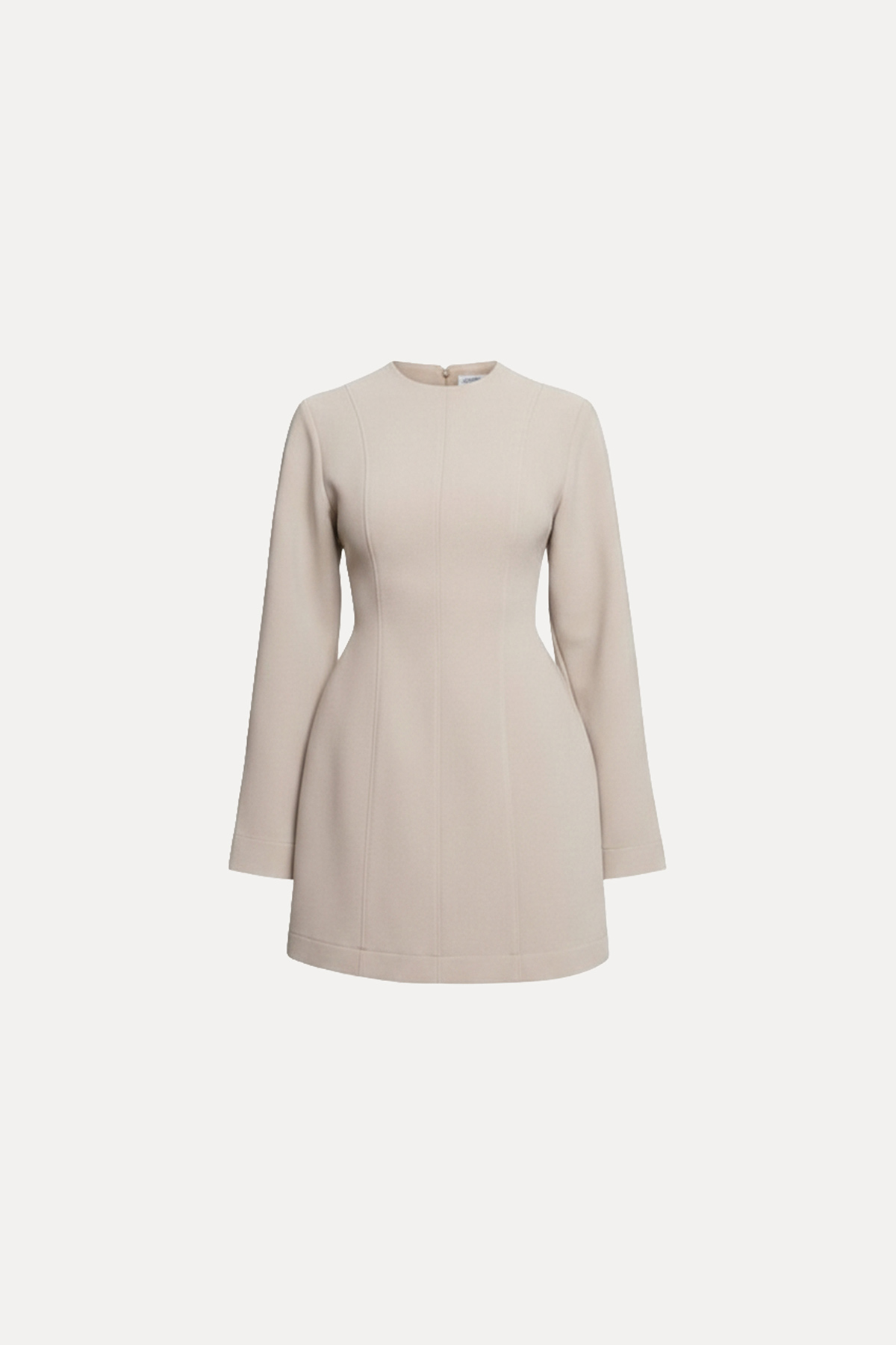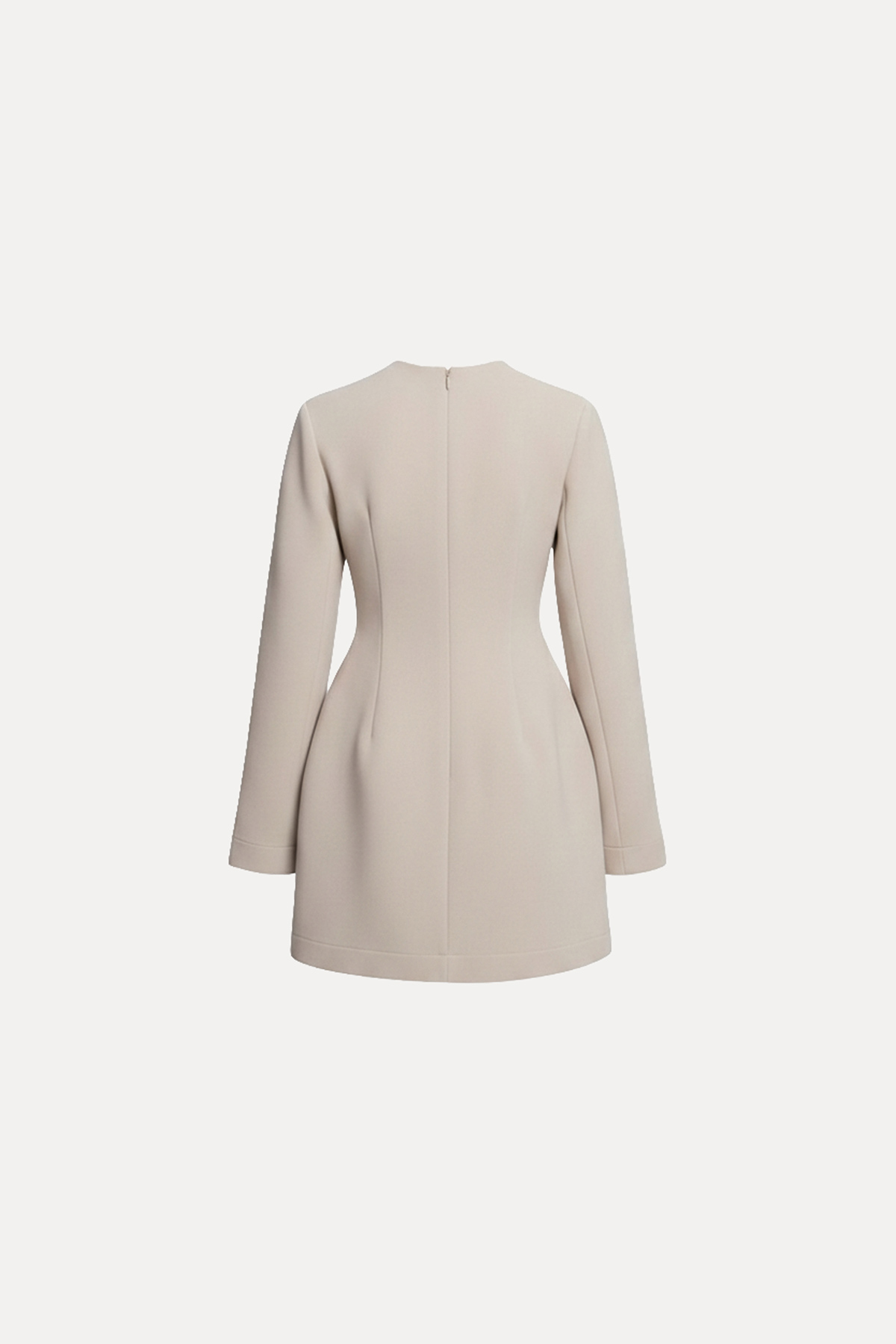 Bisiklet yaka, vatkalı, astarsız, arkadan gizli fermuar kapamalı, uzun kollu, bele oturan mini elbise.