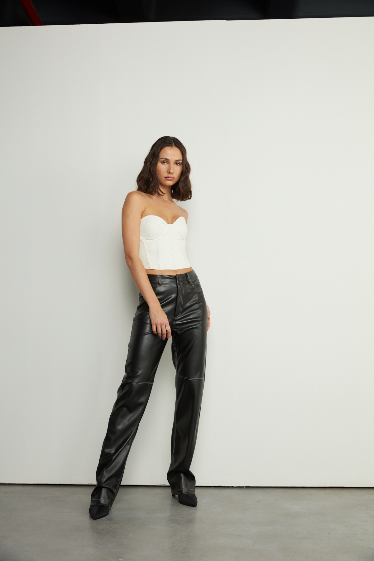 İki ön cepli, tam kalıp yüksek bel, Fermuarlı ve klipsli, Suni deri pantolon. İç kısmı şardonludur.