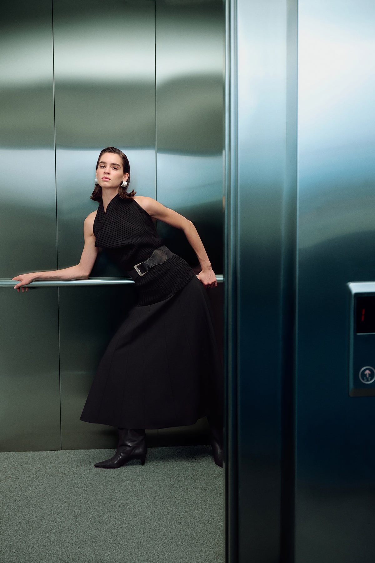 Dökümlü, kolsuz, sırt dekolteli, halter yaka bluz.