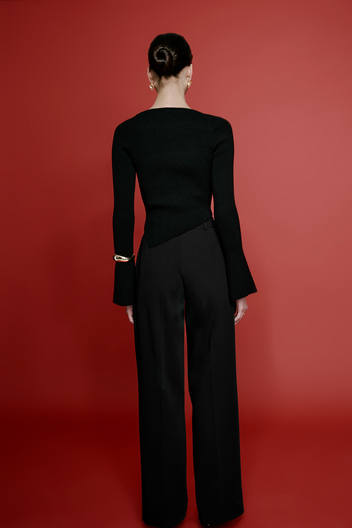 Yüksek bel, bol paça, pile detaylı, yandan 2 cepli, dökümlü kumaş pantolon.