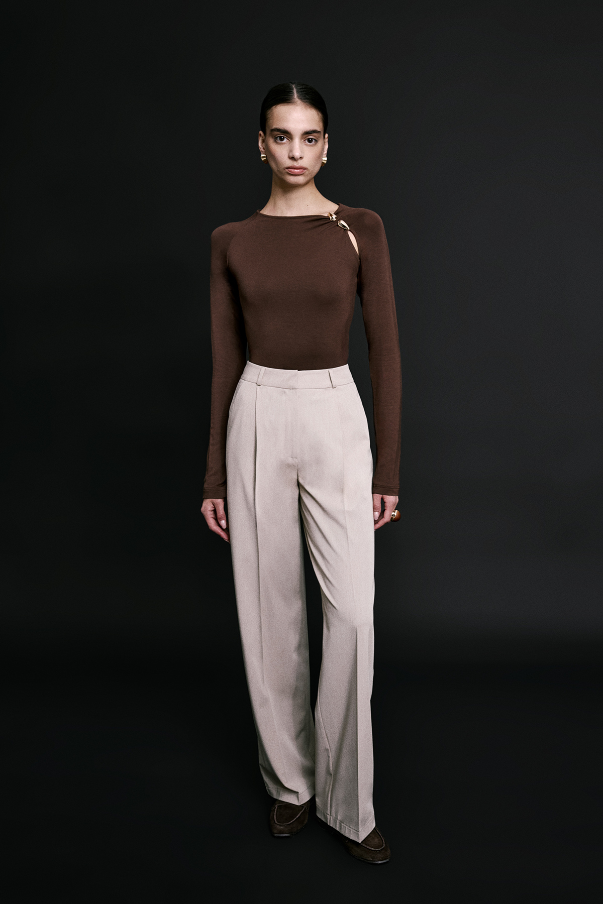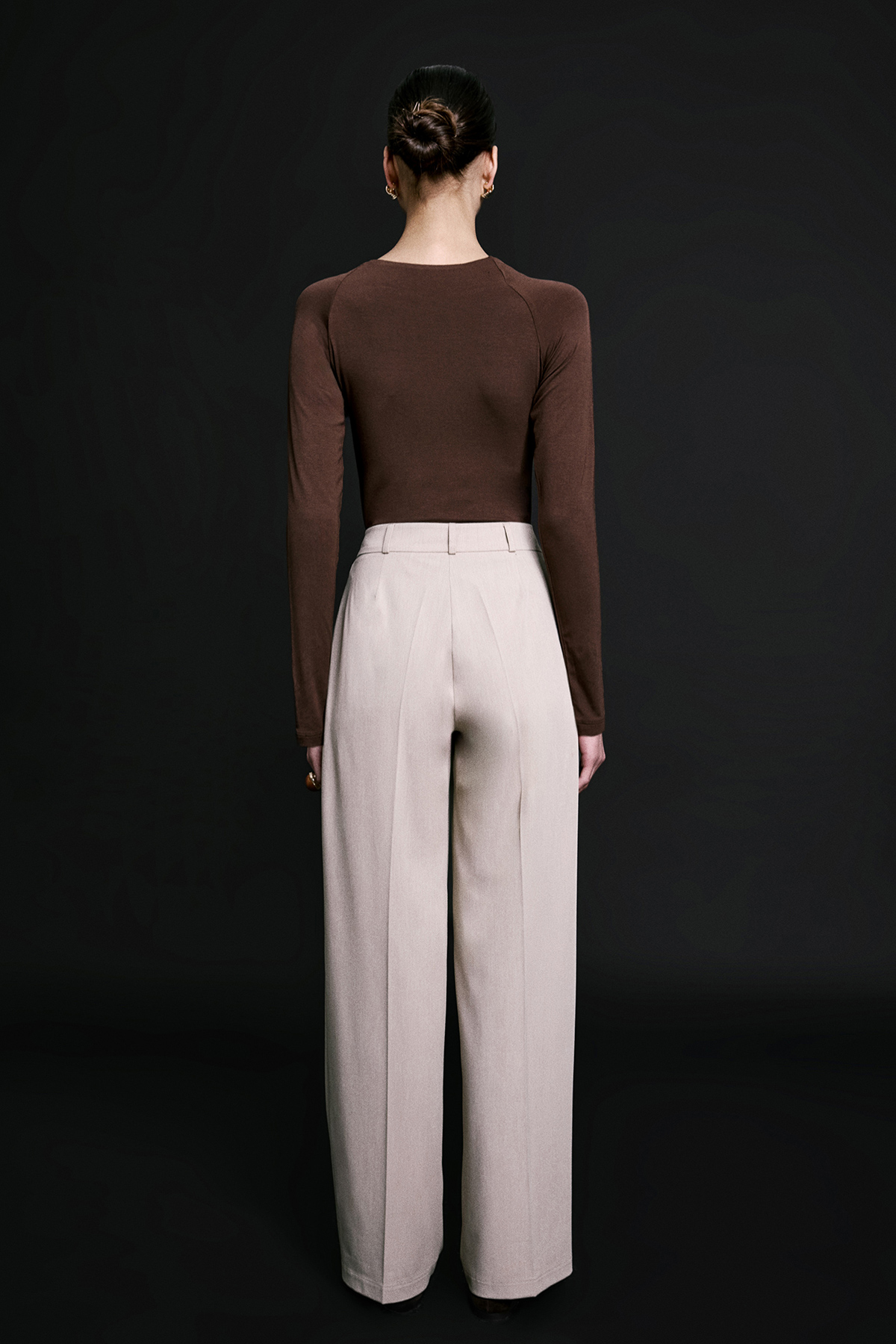 Yüksek bel, bol paça, pile detaylı, yandan 2 cepli, dökümlü kumaş pantolon.