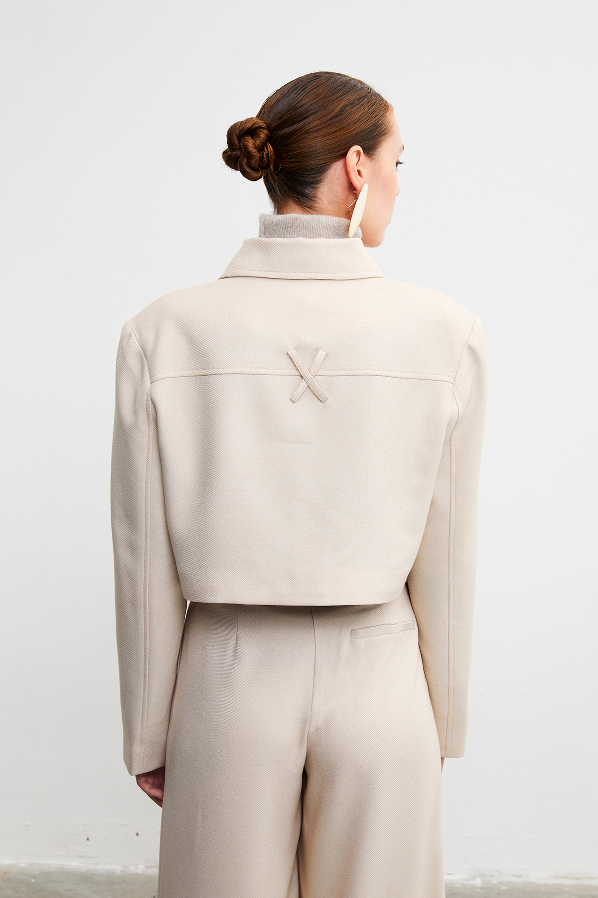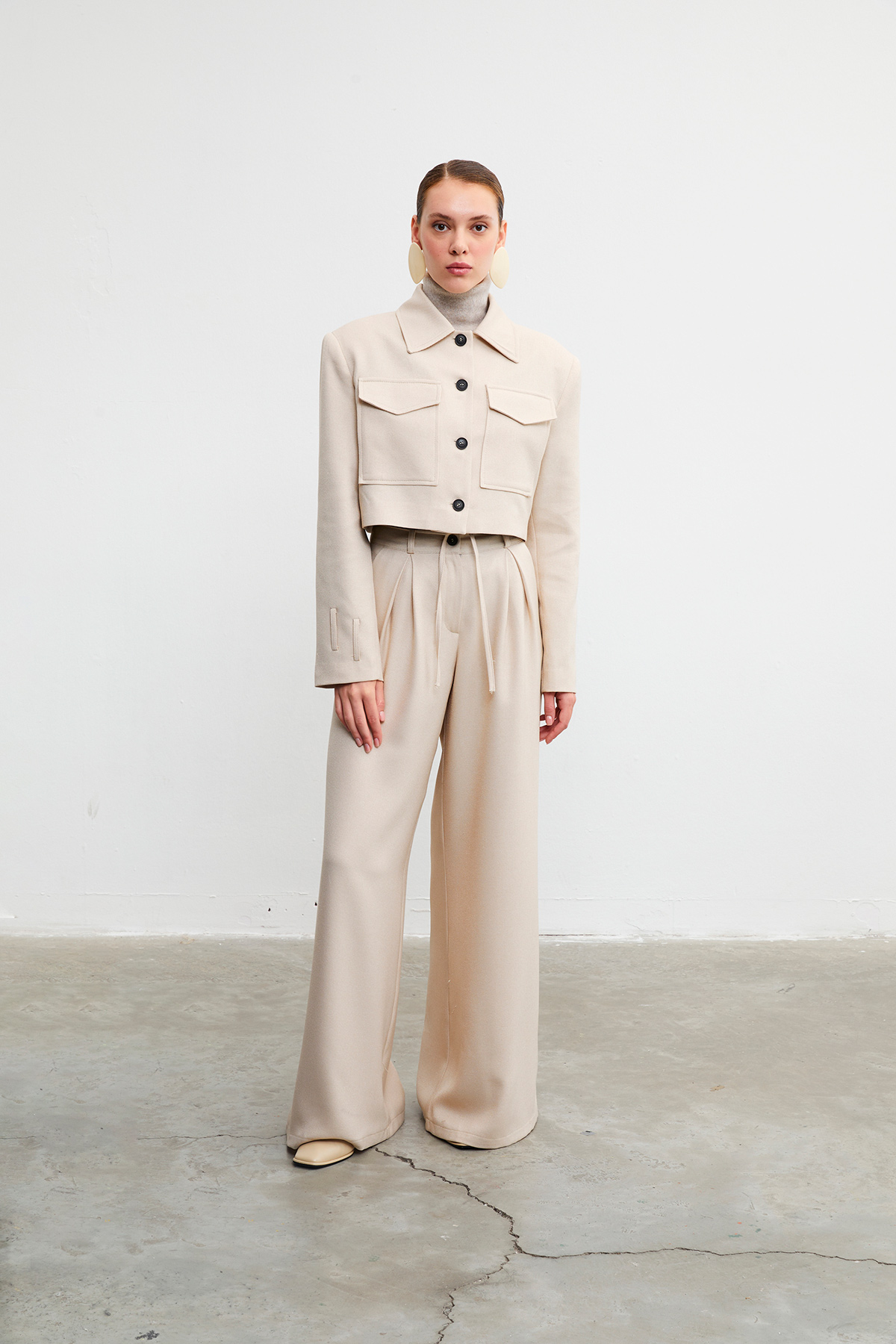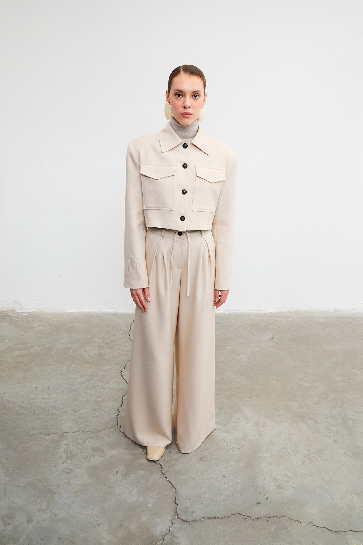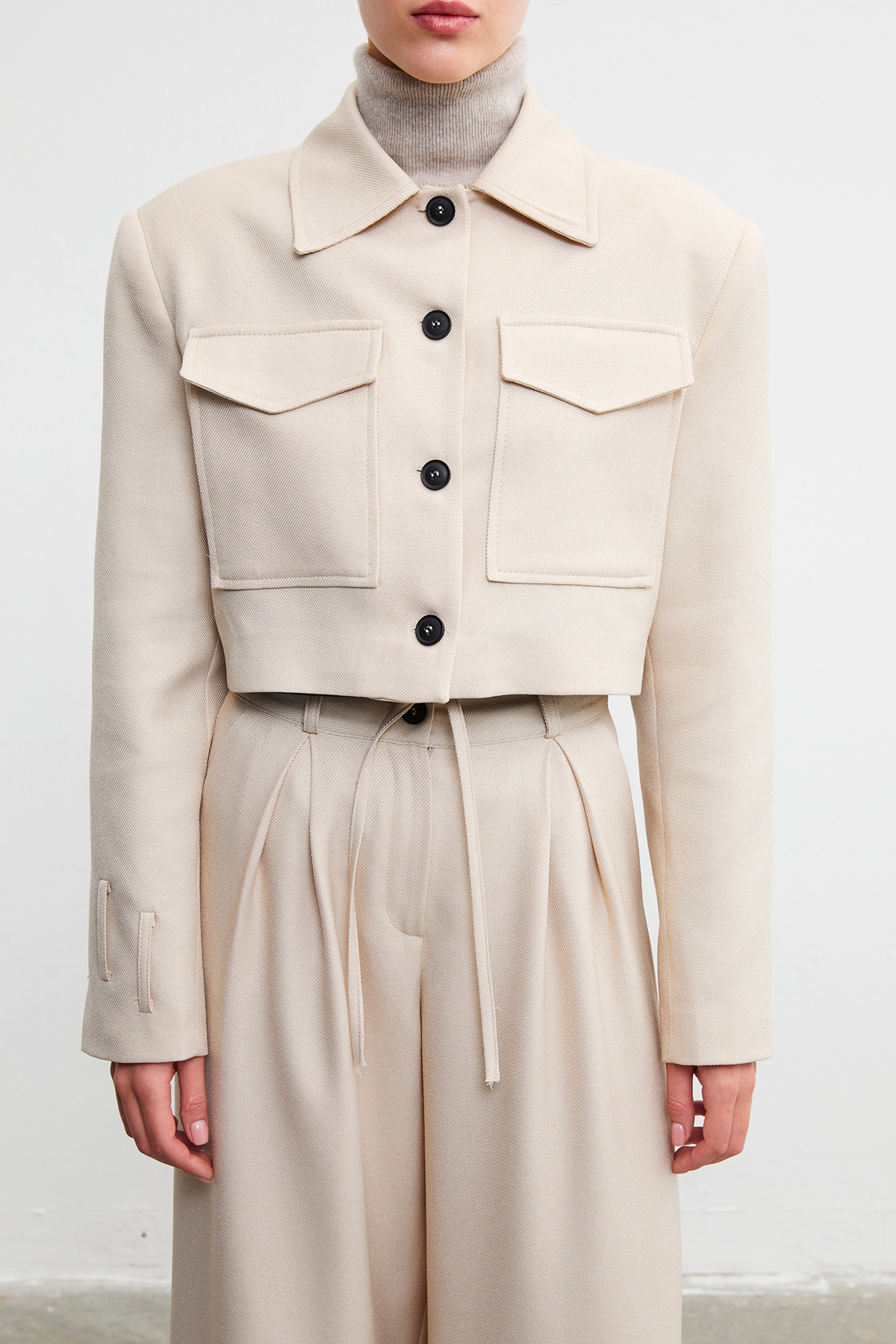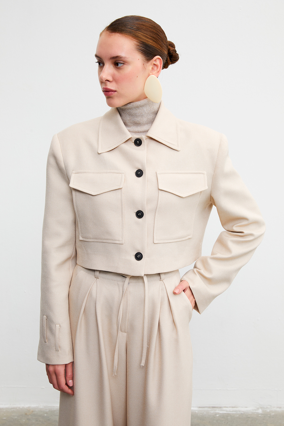 Gömlek yaka, düğme kapamalı, çift cepli crop ceket