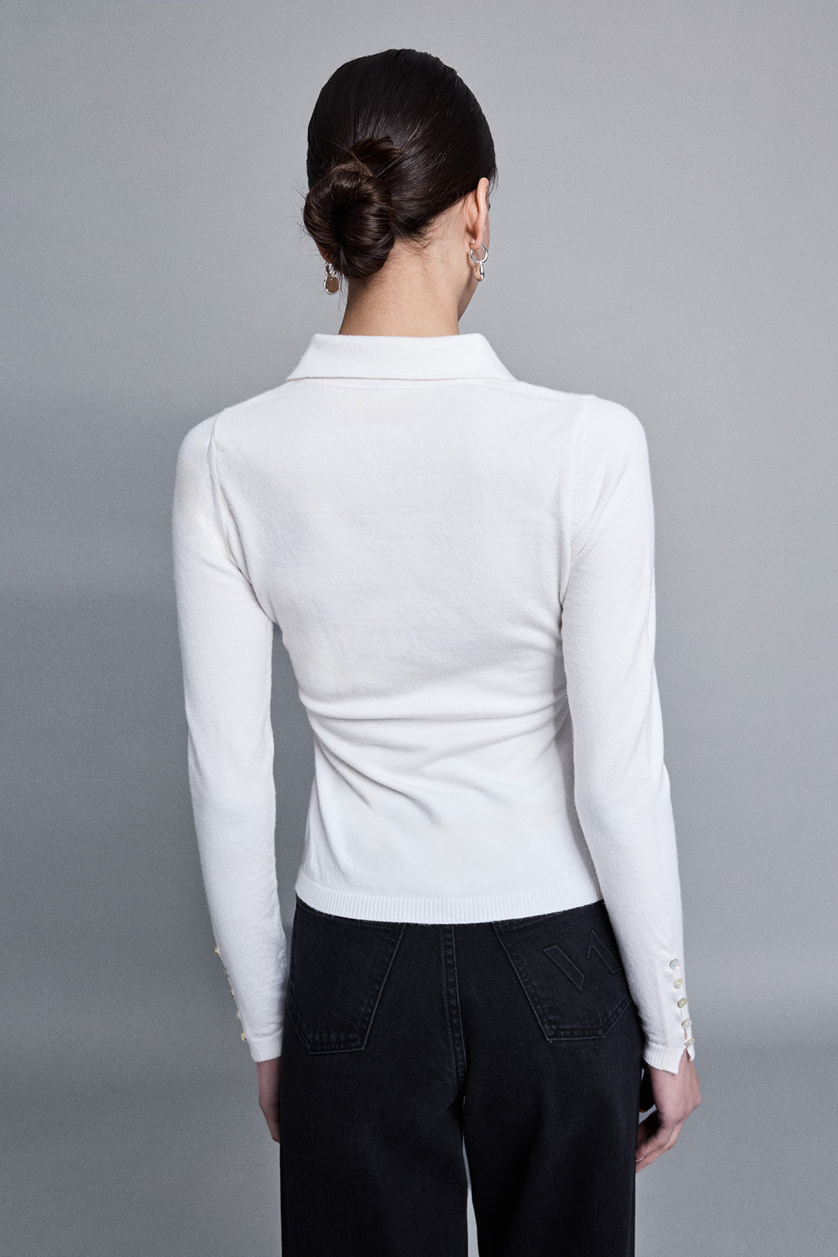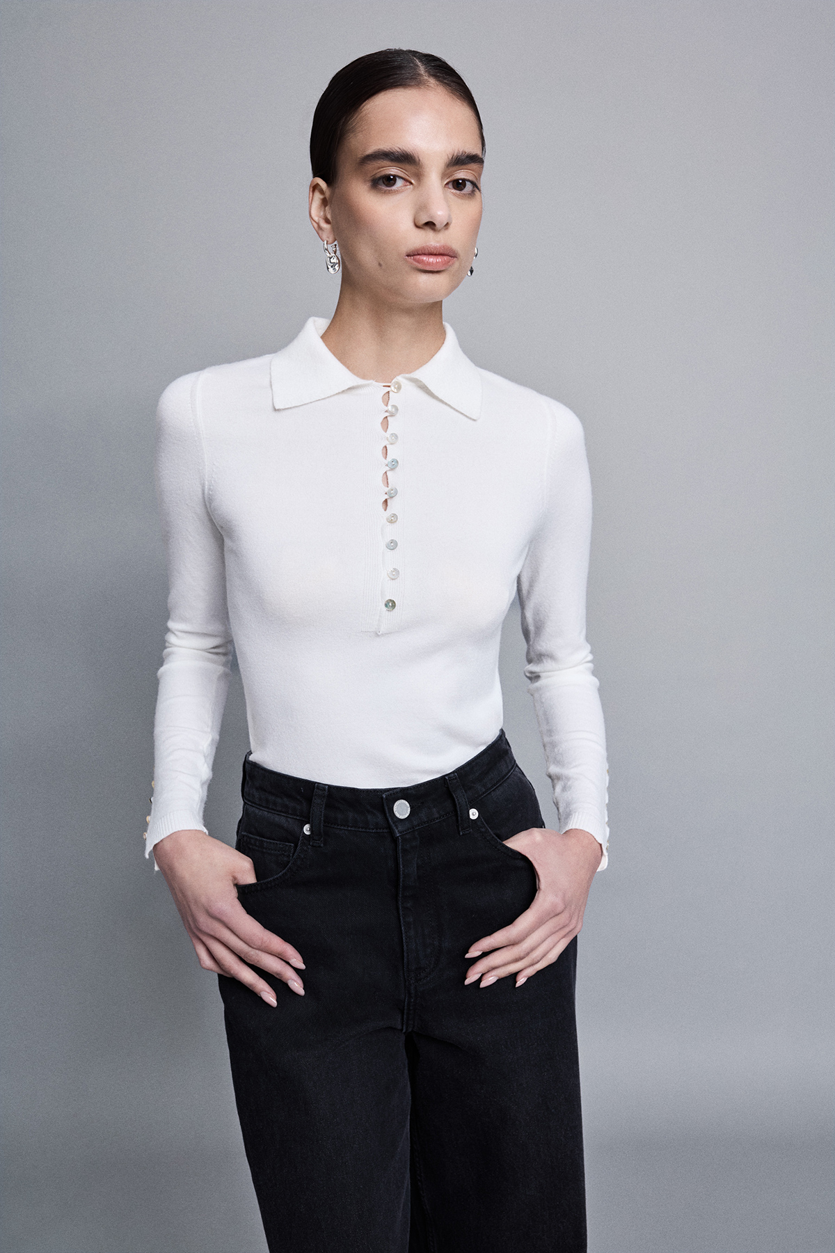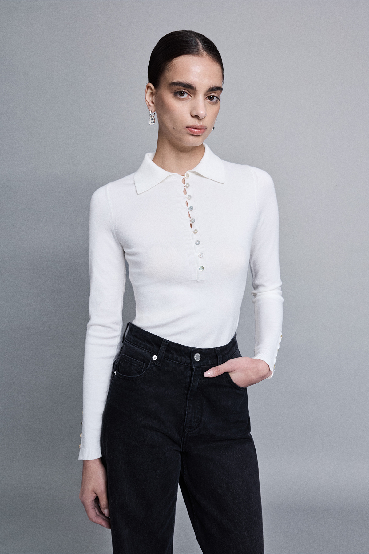 Polo yaka, önü ve kolları düğme detaylı, triko, vücuda oturan, uzun kollu bluz.