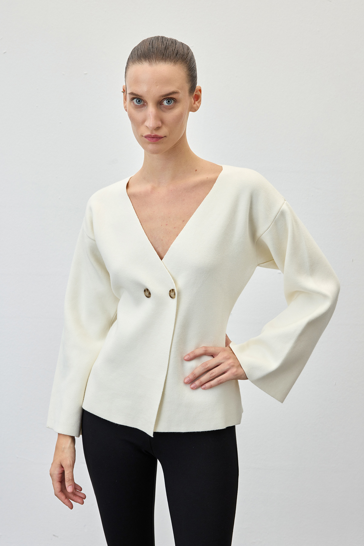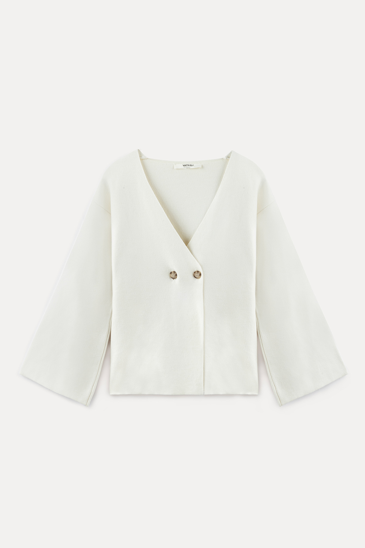 V yaka , önden düğmeli, ispanyol kol, oversıze kalıp, kadın triko hırka.