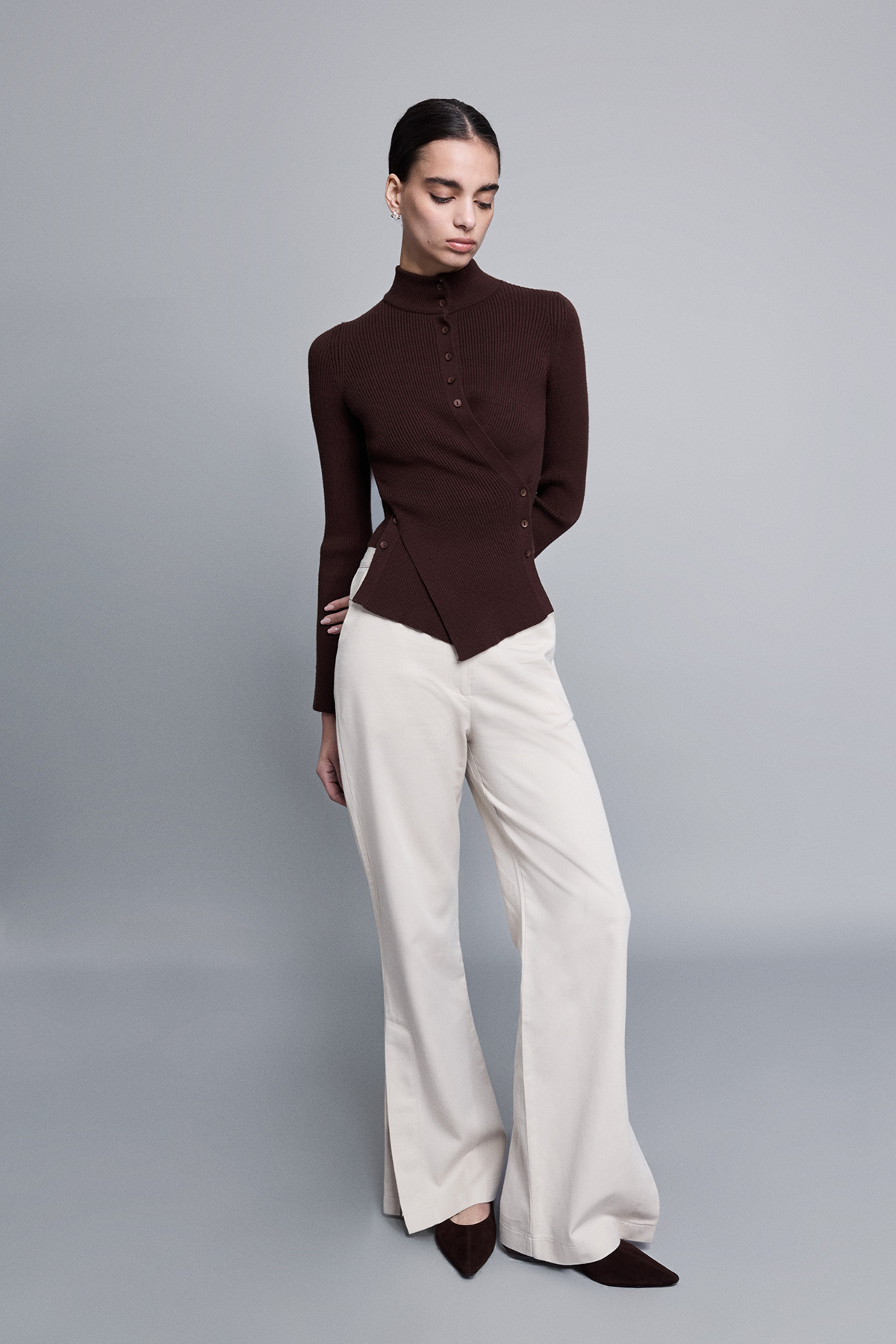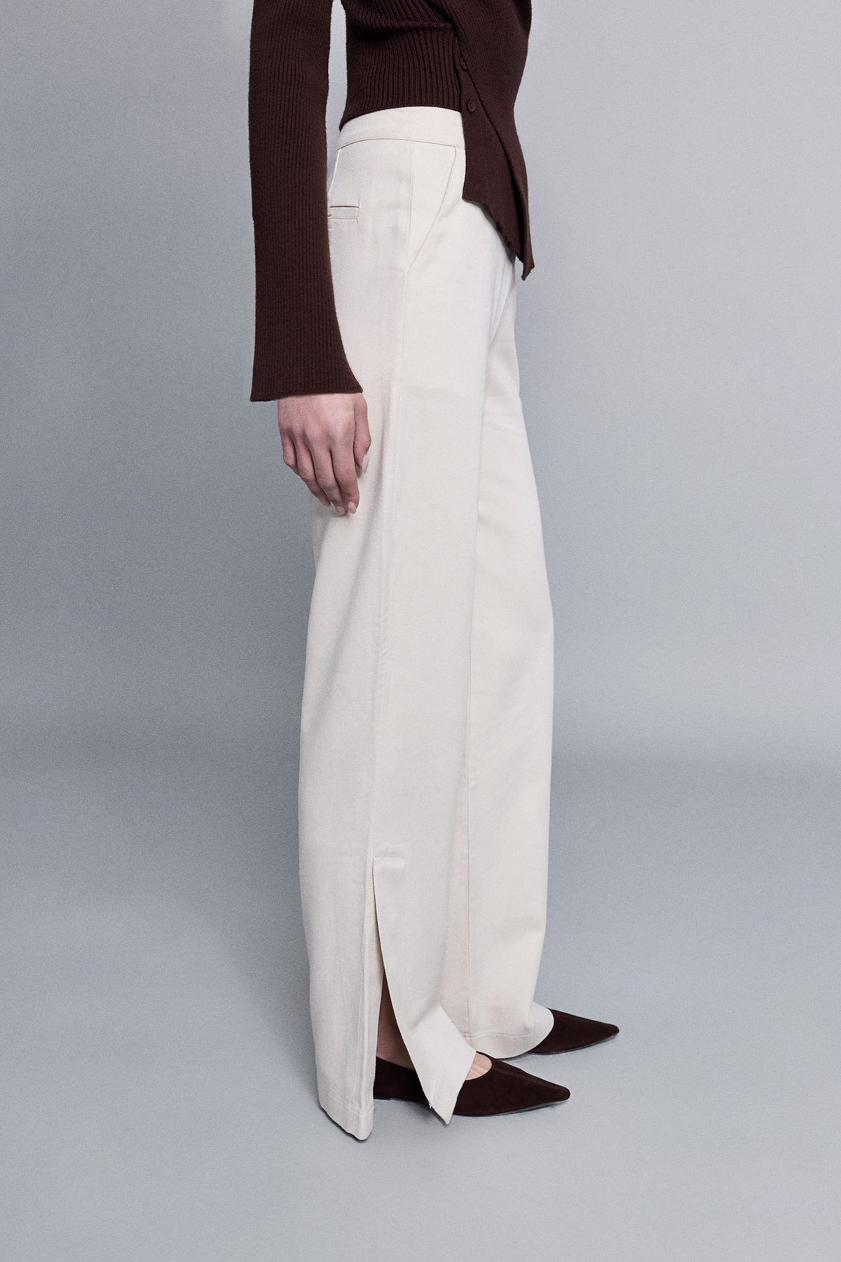 Yüksek bel, düğmeli ve fermuarlı, astarsız, tam kalıp, paçası yırtmaçlı kadın pantolon.