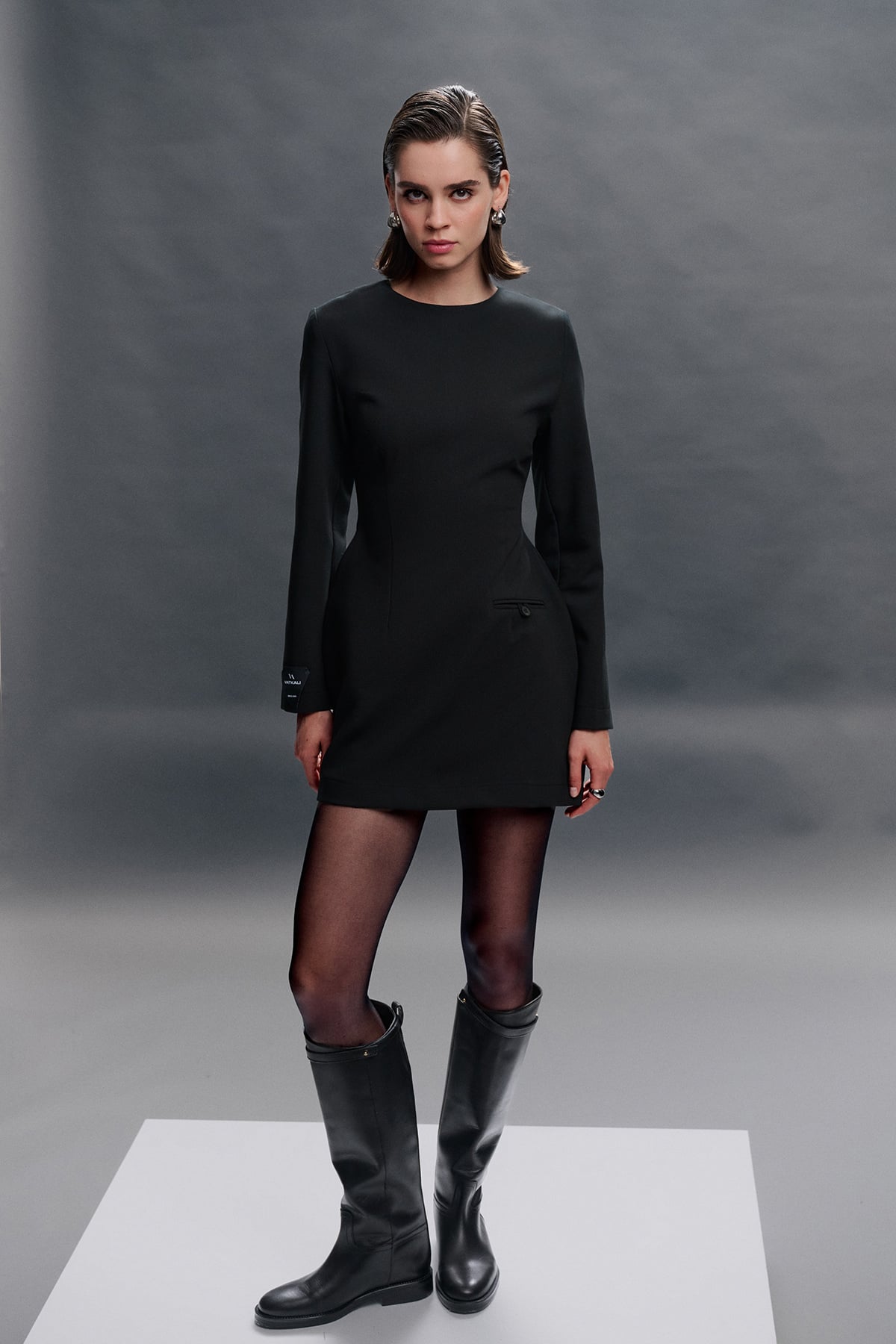 Bisiklet yaka, astarsız, arkadan gizli fermuar kapamalı, uzun kollu, aksesuar cep görünümlü, bele oturan mini elbise.