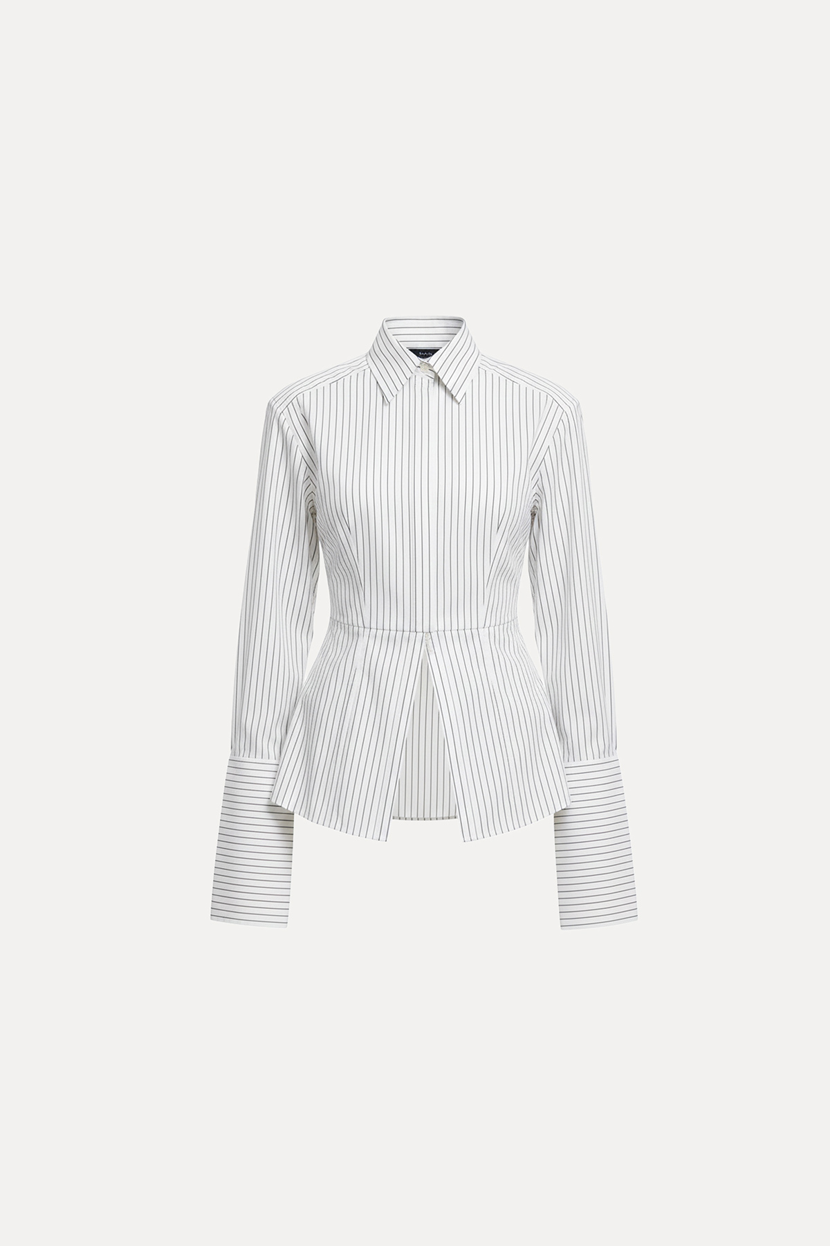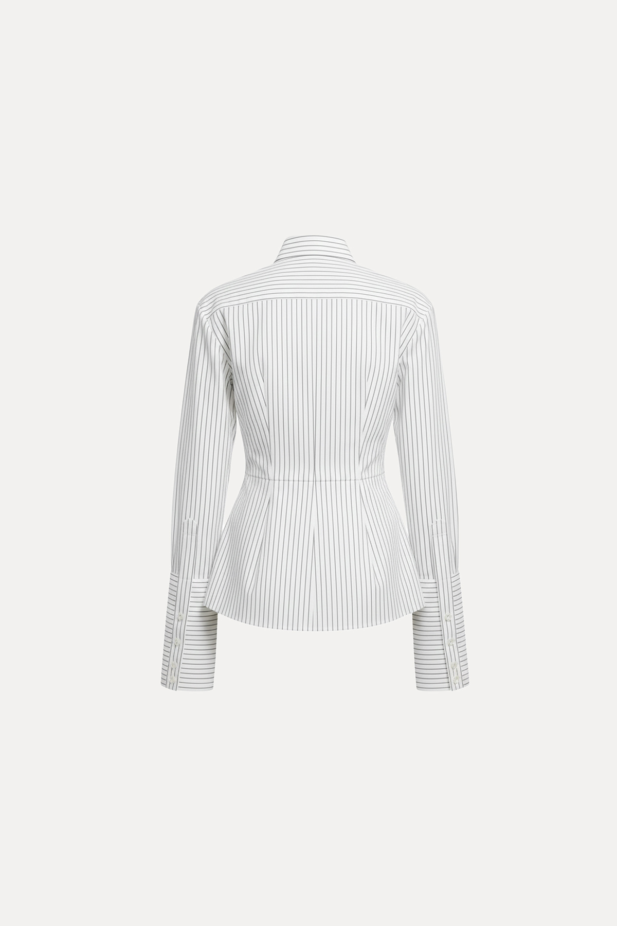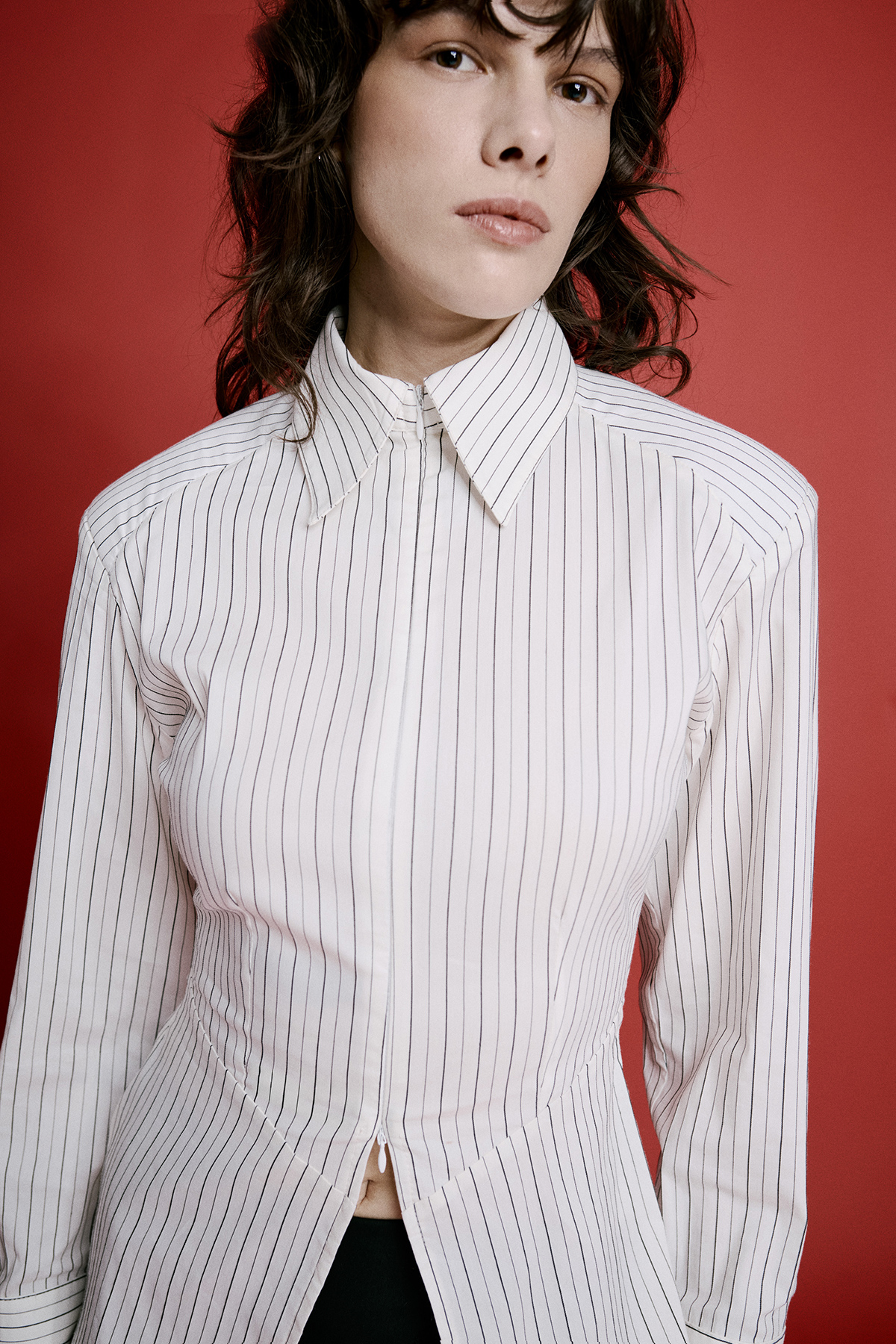 Çift yönlü fermuar kapamalı, vatkalı, geniş manşetli, çizgili, vücuda oturan gömlek.