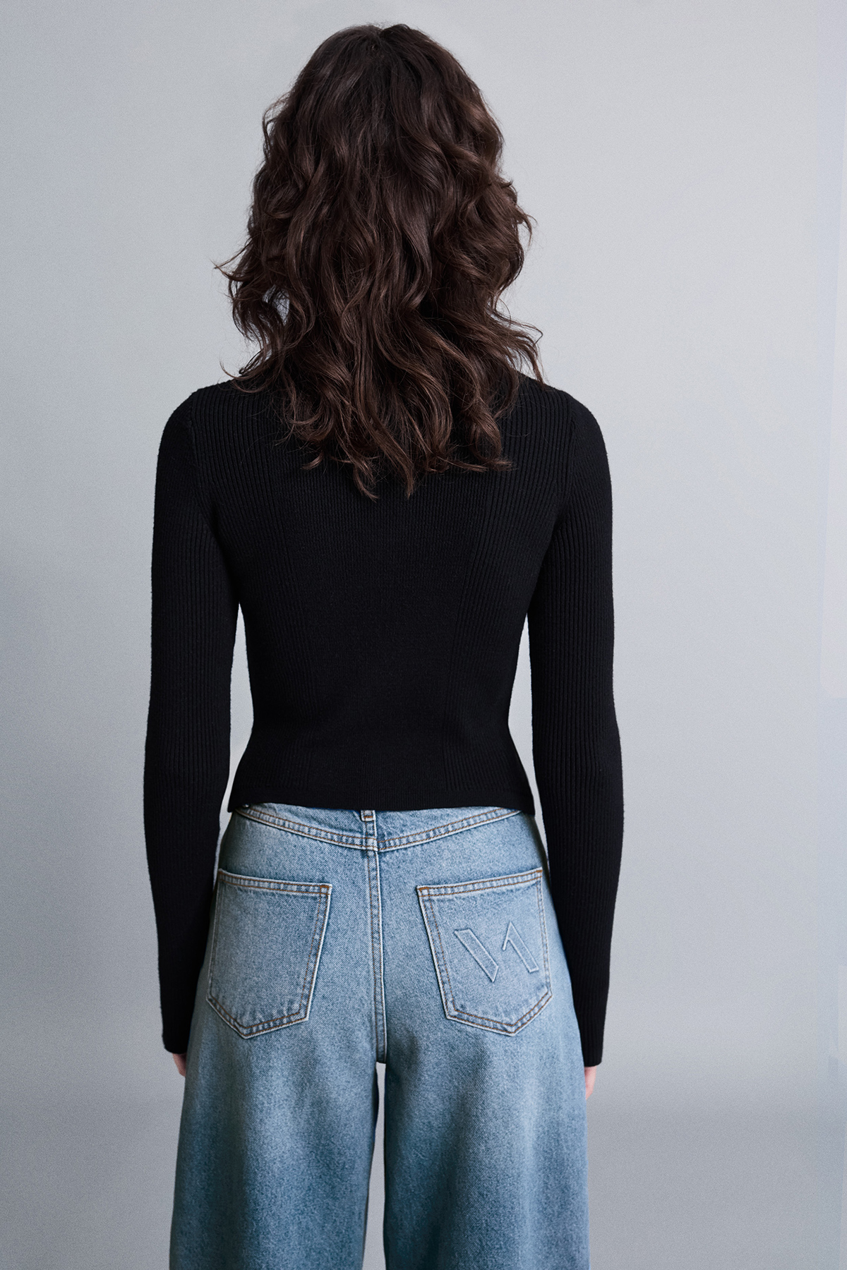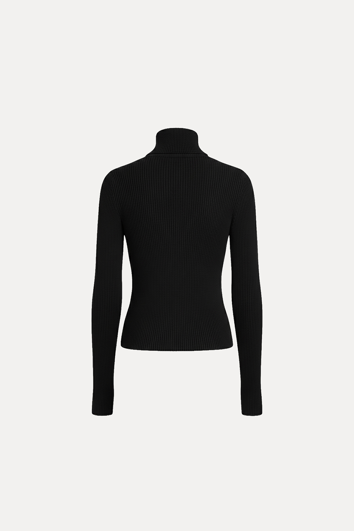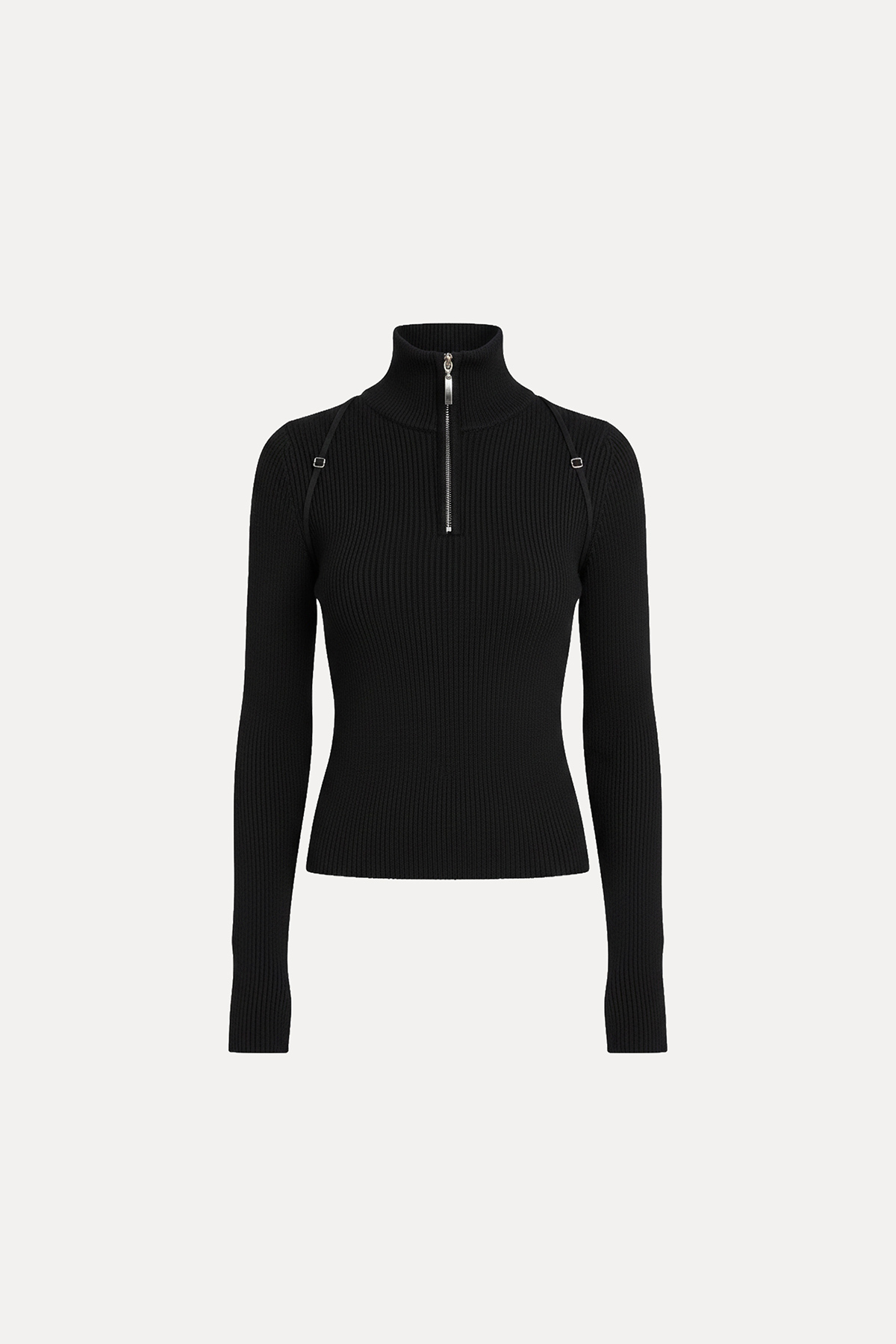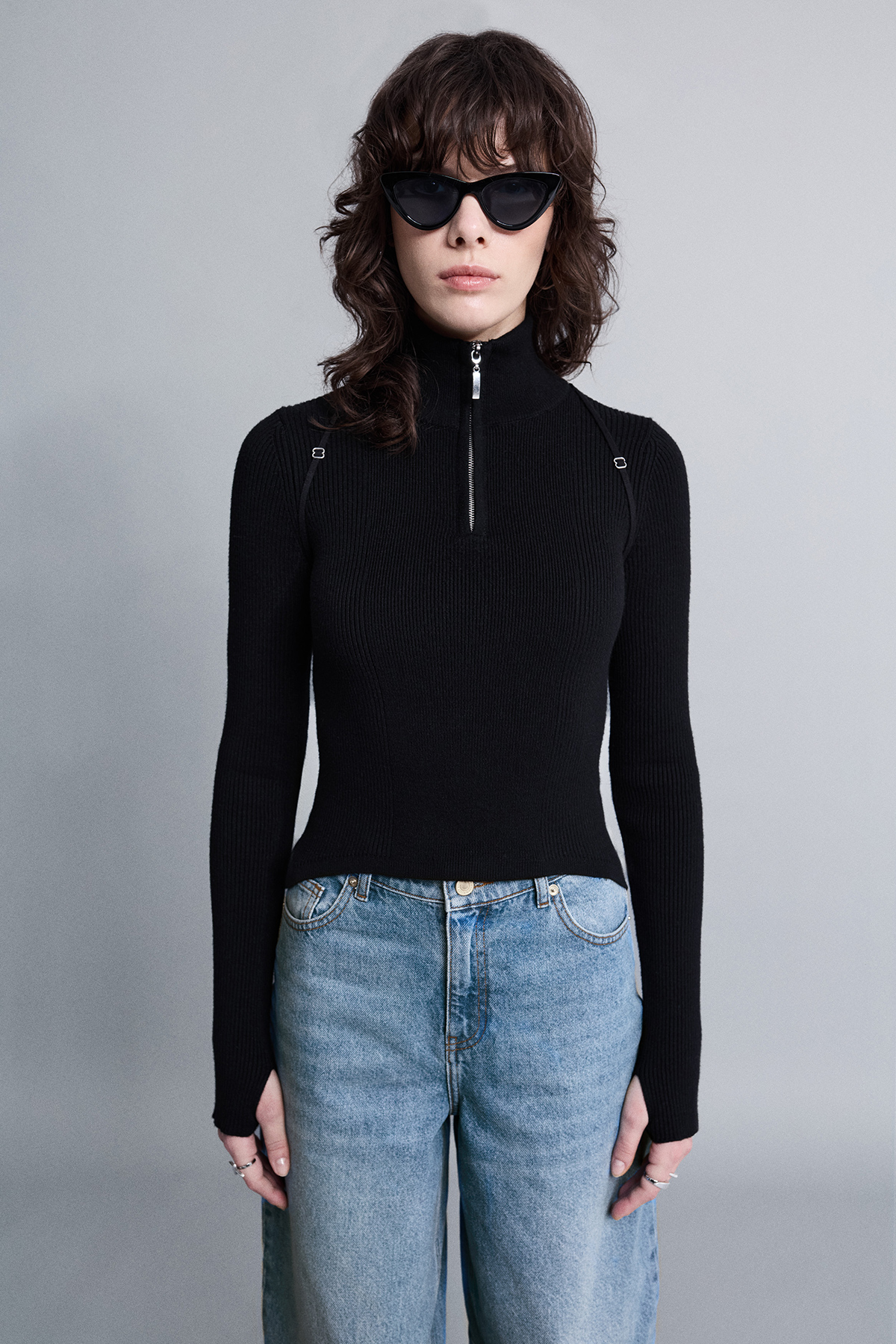 Dik yaka, önü fermuar detaylı, triko kumaş, vücuda oturan bluz.