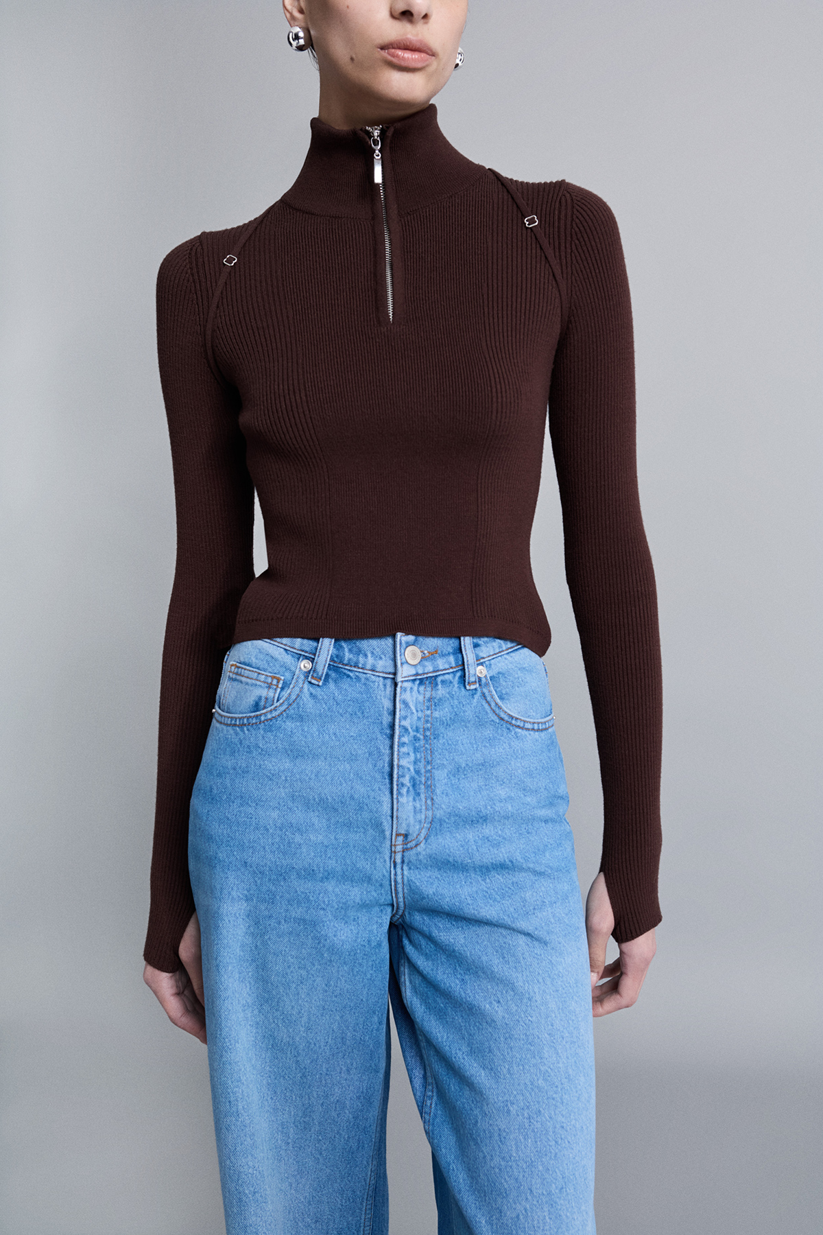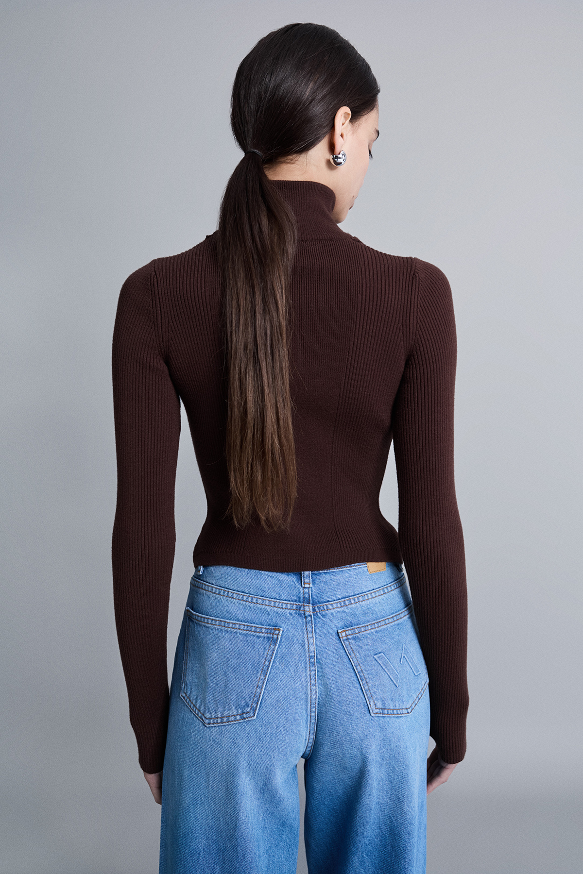 Dik yaka, önü fermuar detaylı, triko kumaş, vücuda oturan bluz.