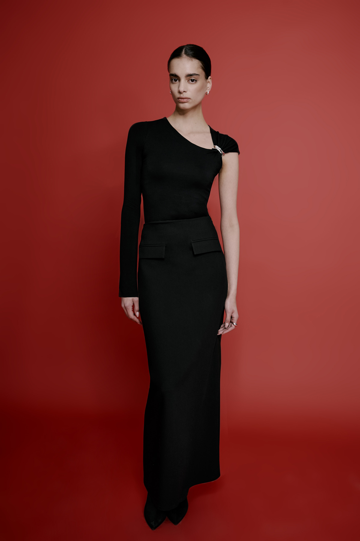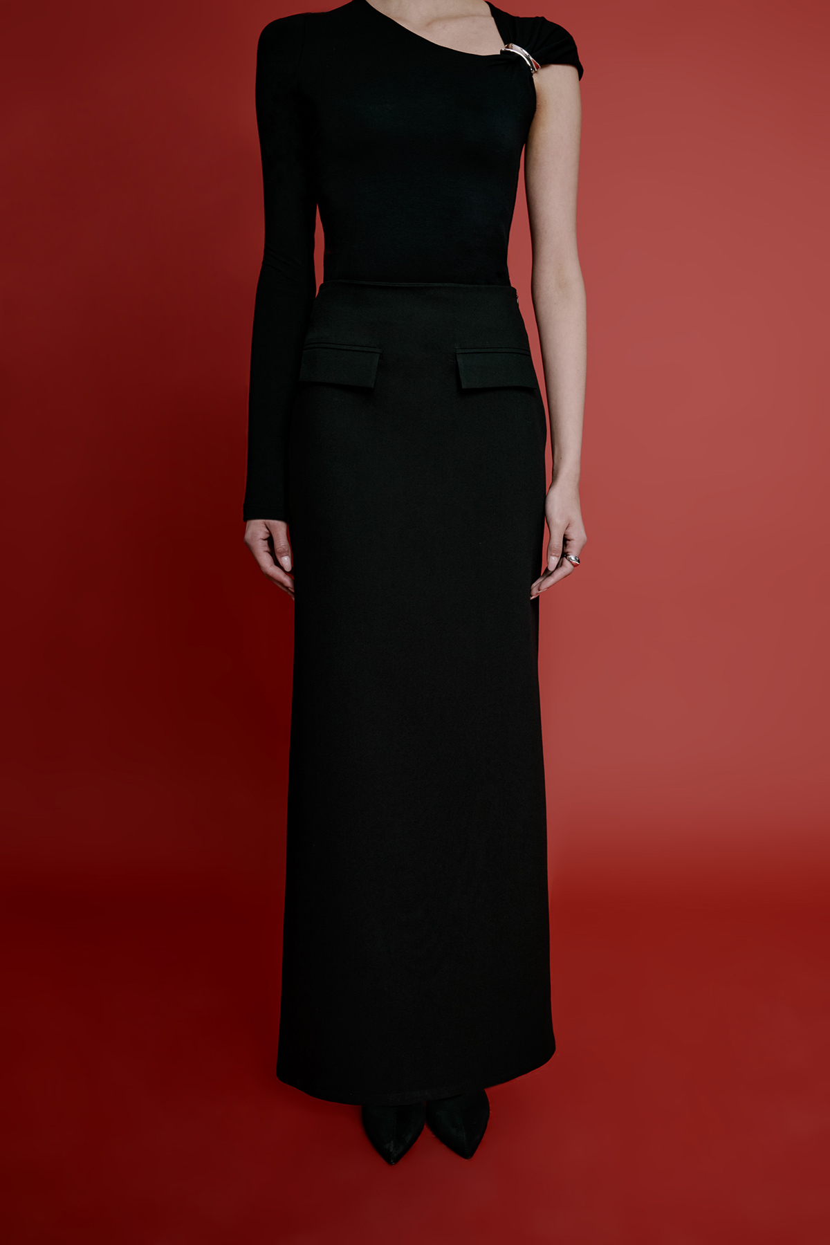 Önden cep kapak detaylı, gizli fermuar kapamalı, maxi boy kalem etek.