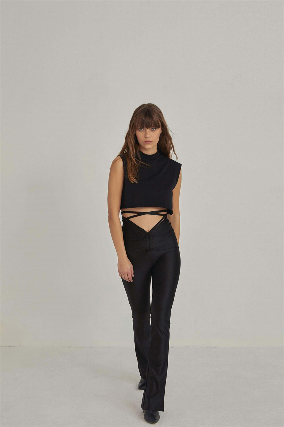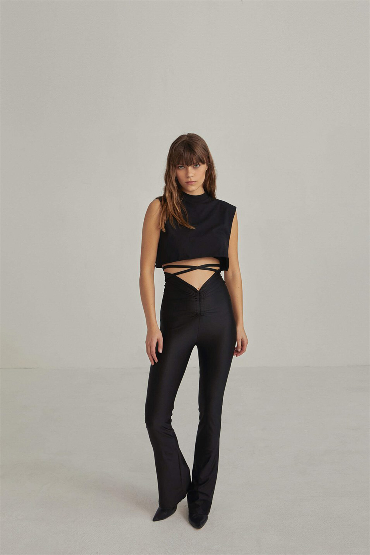 Büzgü ve bağlama detayıyla şık kombinler oluşturabileceğiniz İspanyol paça tayt siyah rengiyle dikkat çekiyor. Kolsuz top ile kombinlediğimiz İspanyol paça büzgülü taytla şık kombinler oluşturarak tarzınızı yansıtabilirsiniz.