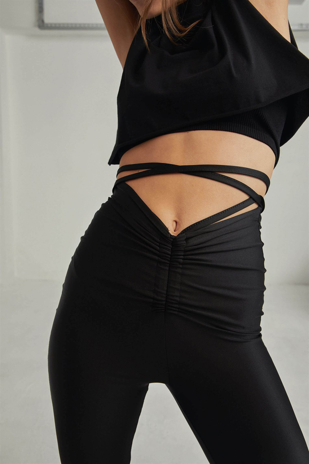 Beli büzgü ve bağlama detaylı, ispanyol paça kadın tayt.